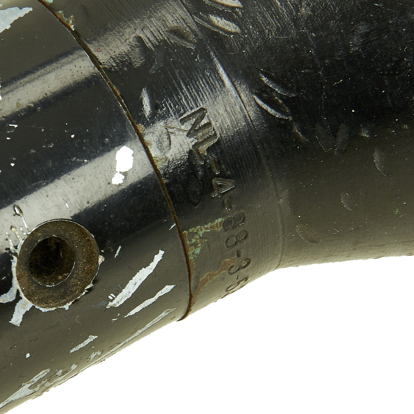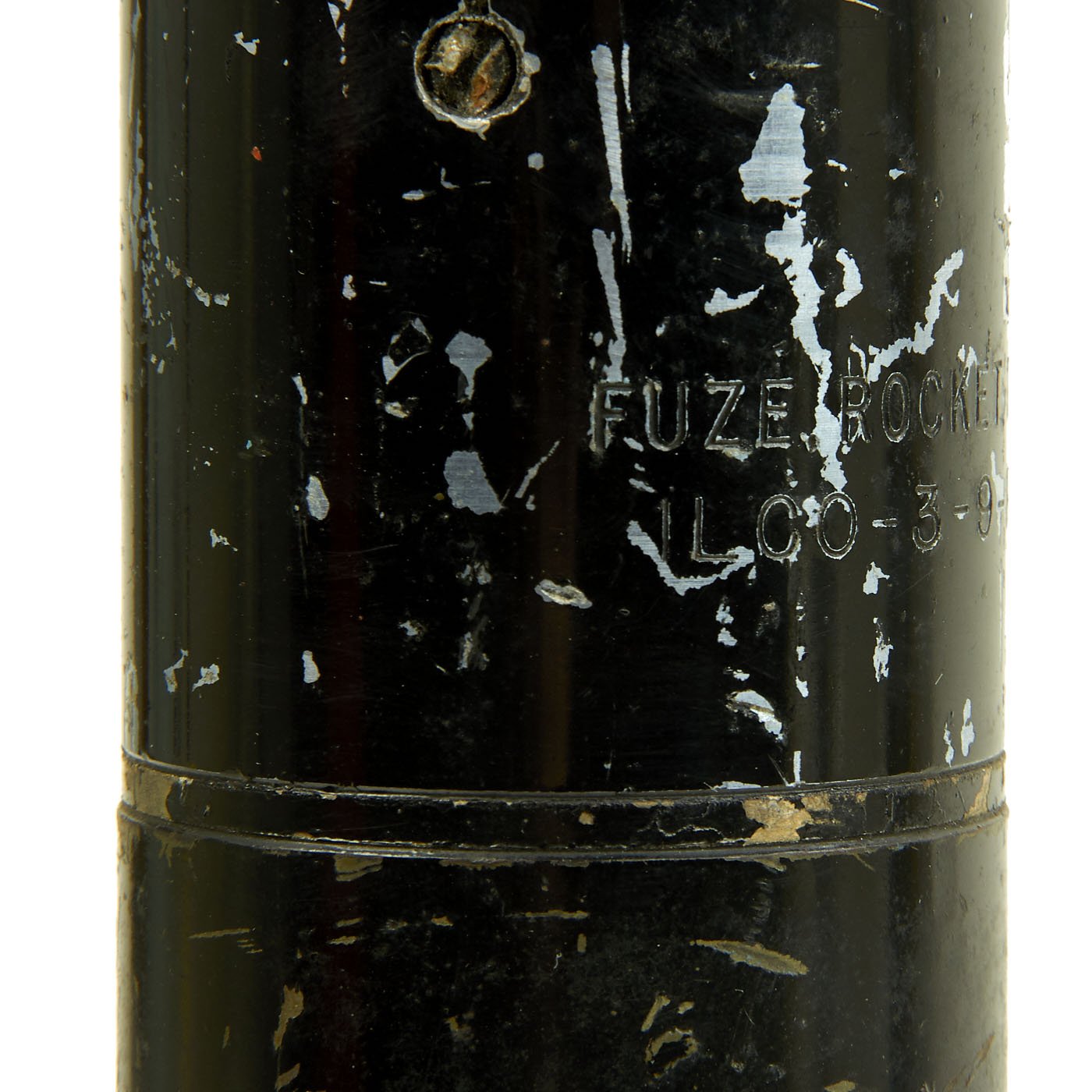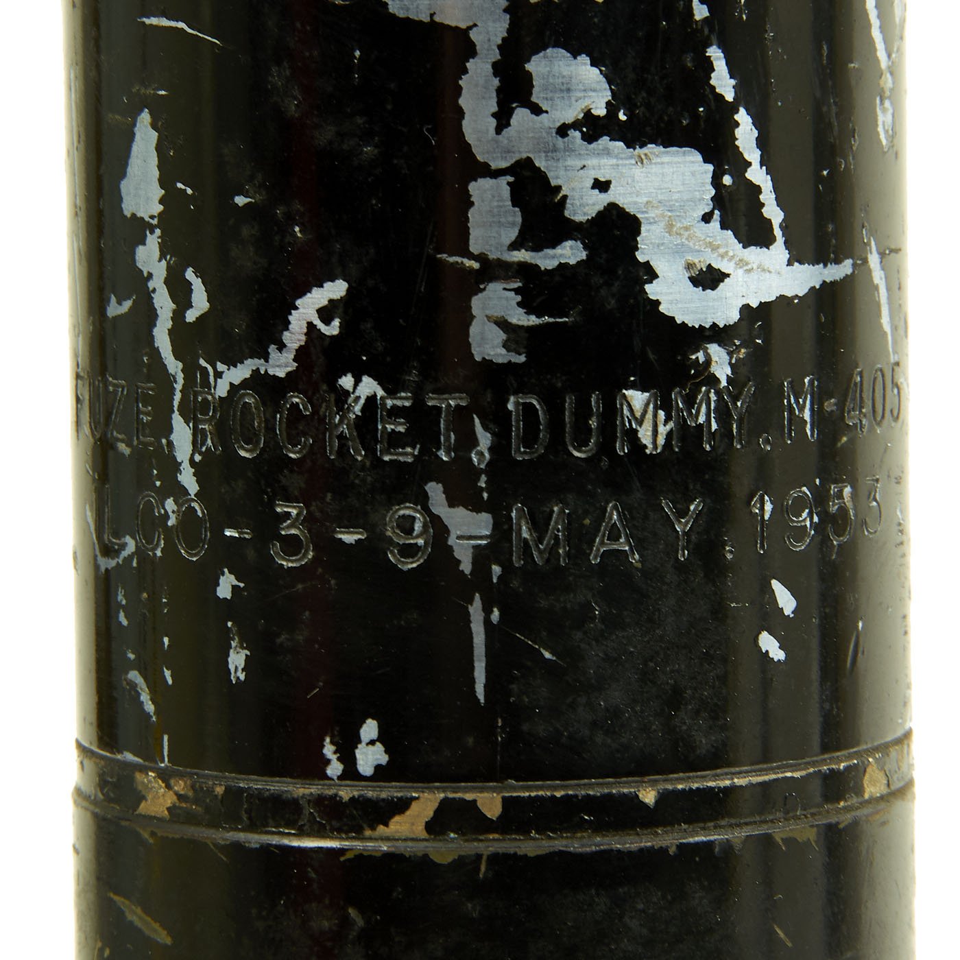 This is a U.S. military M29A2 Inert Practice Round for the M20 A1 B1 3.5 Inch Super Bazooka offered in very good condition, which has been repainted black and red for decorative purposes. The information on the FUZE. ROCKET. DUMMY. M-405 marked body indicates production on 3 - 9 - 1953.