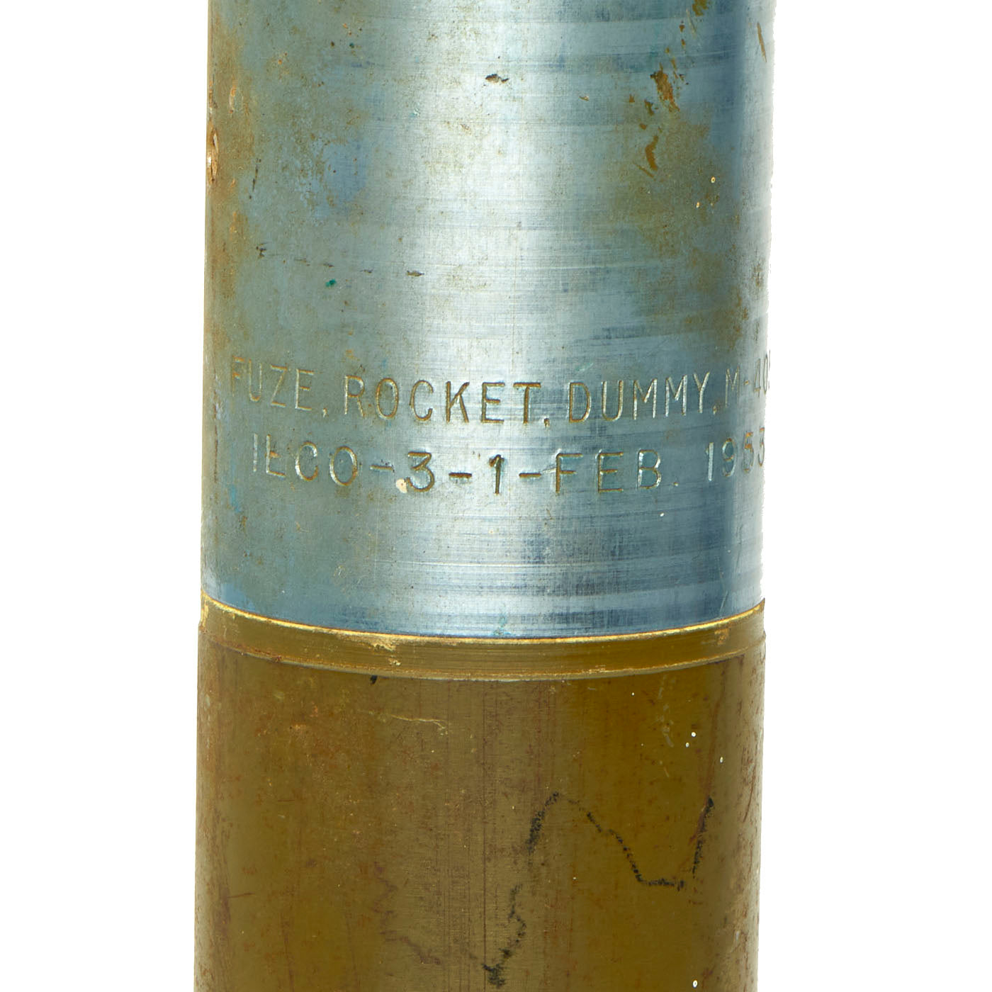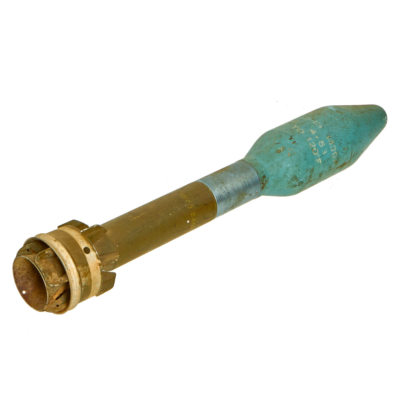 This is a U.S. military M29A2 Inert Practice Round for the M20 A1 B1 3.5 Inch Super Bazooka offered in very nice condition, and it still has the original OD green and Blue paint in very good shape. The Body has what appears to be a 1950s manufacturing code and date, and there are also clear paint markings on the inert warhead, with 4-53 dates painted.