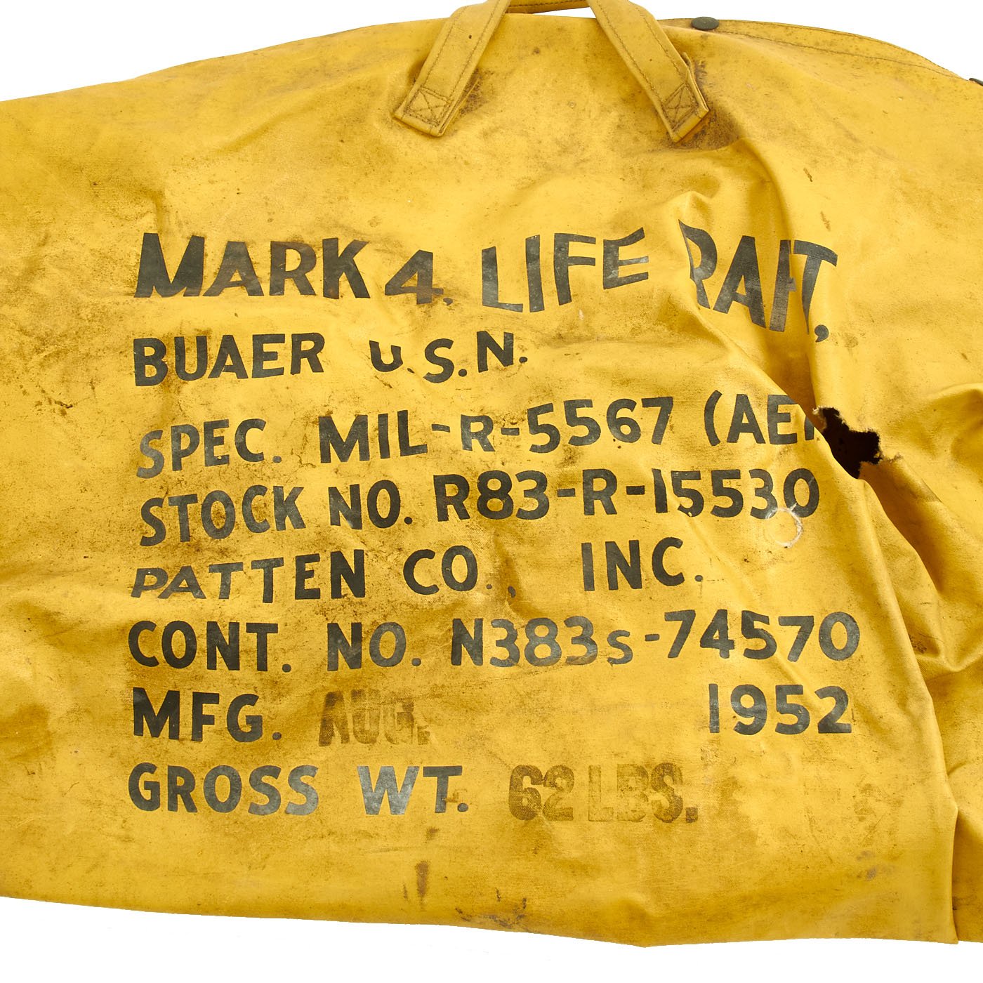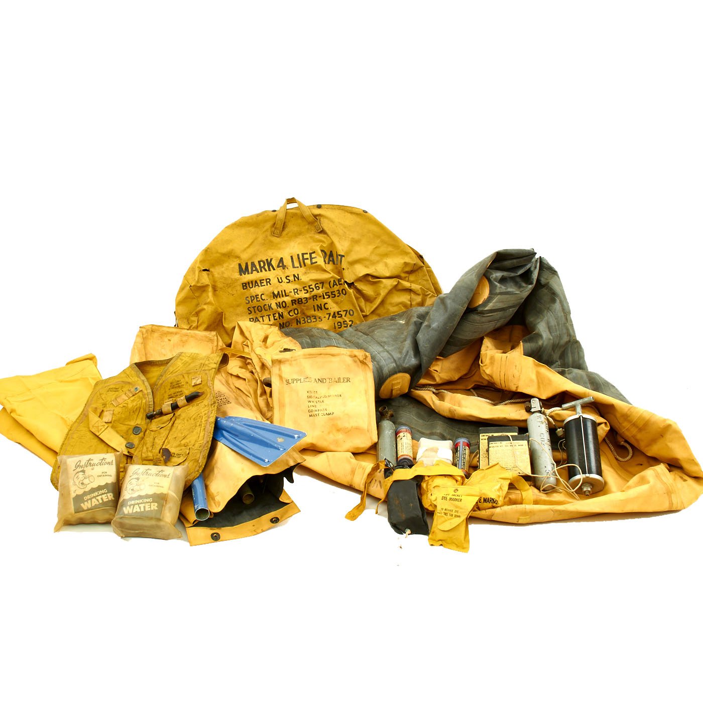 Original Item: Only One Available. This is a 1952 dated United States Department of the Navy specification number MIL-R-5567 "Raft, Pneumatic, Life - For aircraft use" offered in excellent condition with accessories, spare parts, flares, survival kits and more.