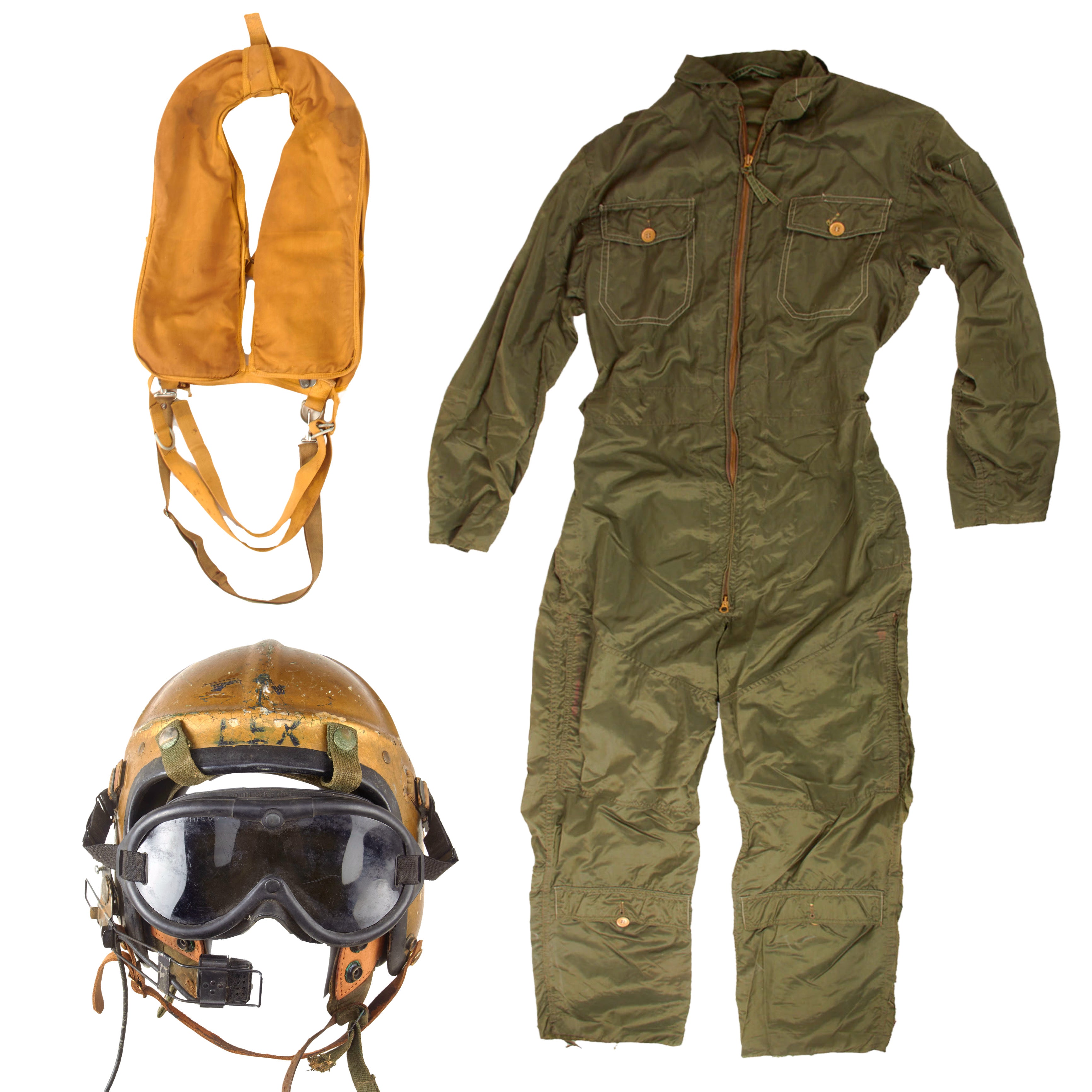 Original Items. Only One Group Available. This is a great set of equipment that would make for an outstanding mannequin display depicting a Korean War U.S. Navy Pilot. The set consists of the H4 Helmet with the interior helmet and goggles, a lightweight nylon flight suit, and a “Mae West” style flotation vest.
