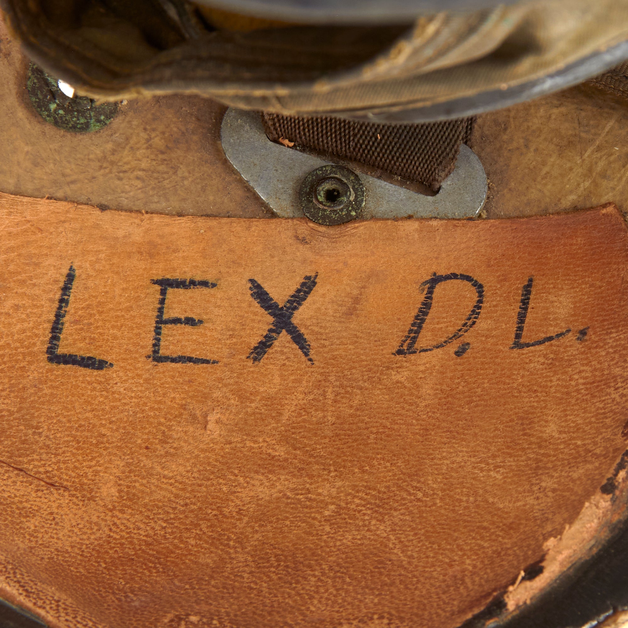 This H-4 retains the inner helmet and is in fair overall condition with a microphone, headphones in the inner helmet, and chinstrap. The paint of the helmet is heavily worn and the Navy Pilot’s wings to the front are almost gone. The Rochester Optical USN B-8 goggles are in great condition. The interior shows heavy wear but this helmet will still look great for display. The helmet is named LEX in multiple places. One of the snap straps for the inner helmet is broken off, but is now snapped on and hanging.