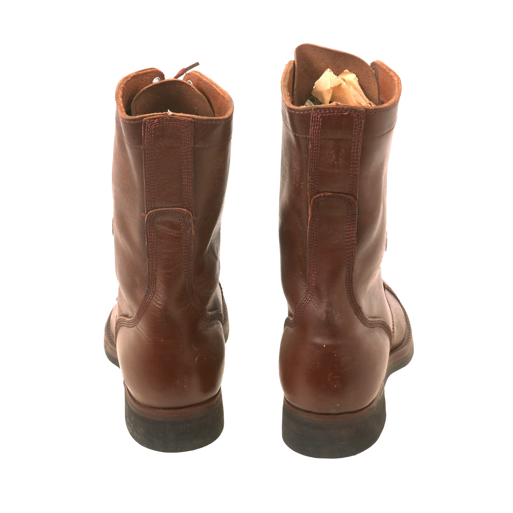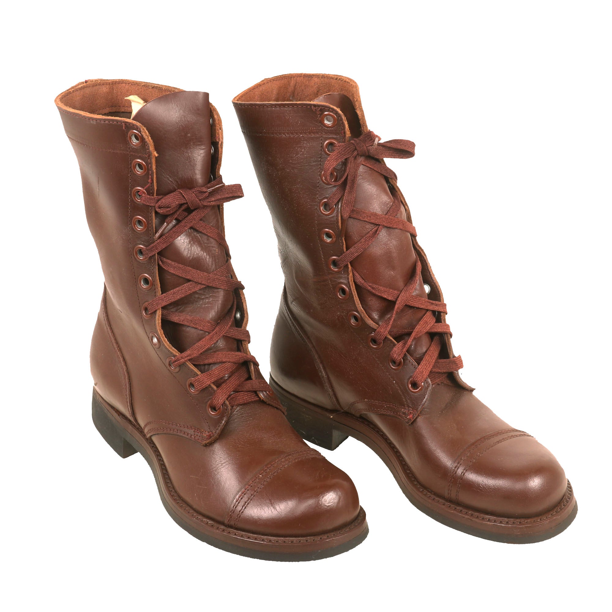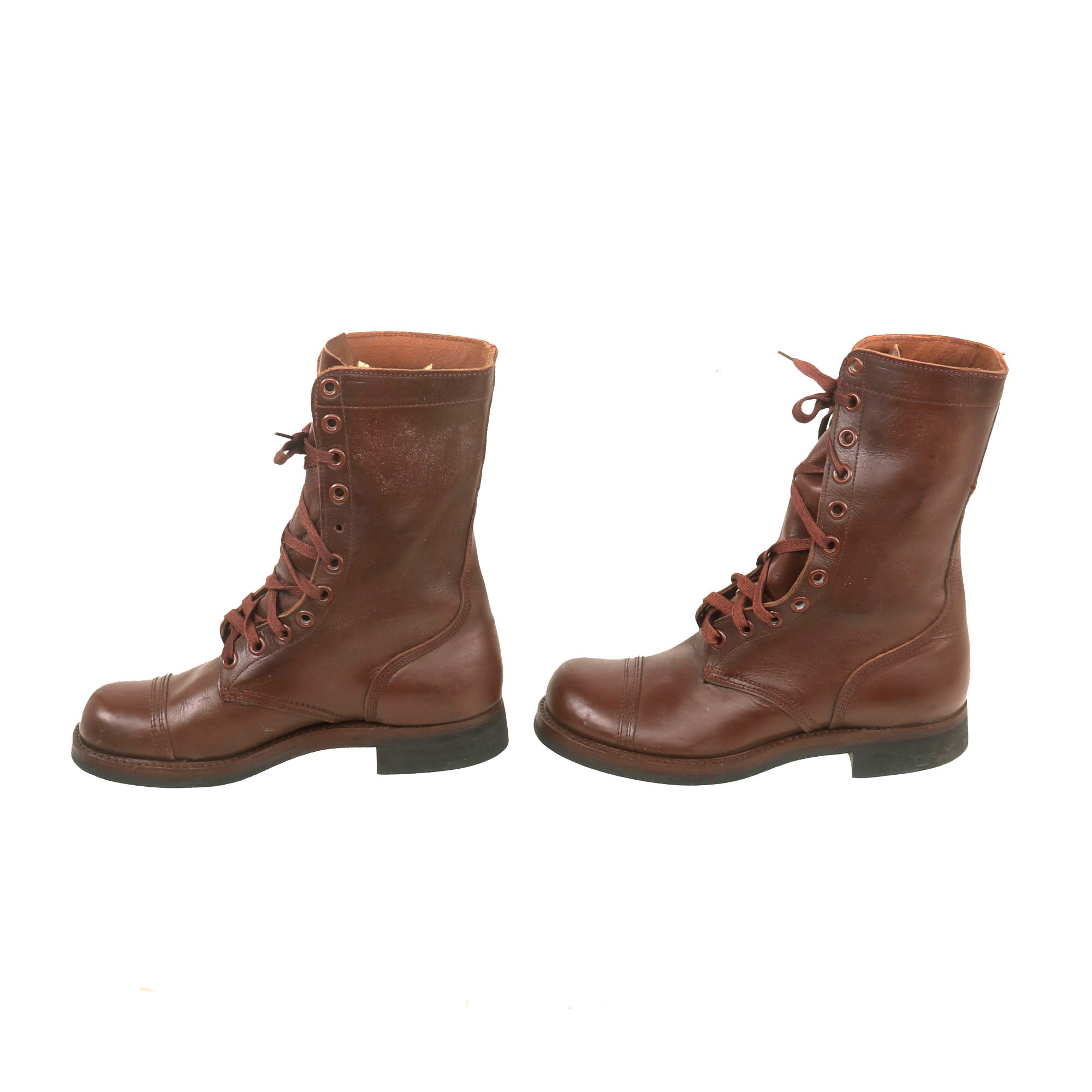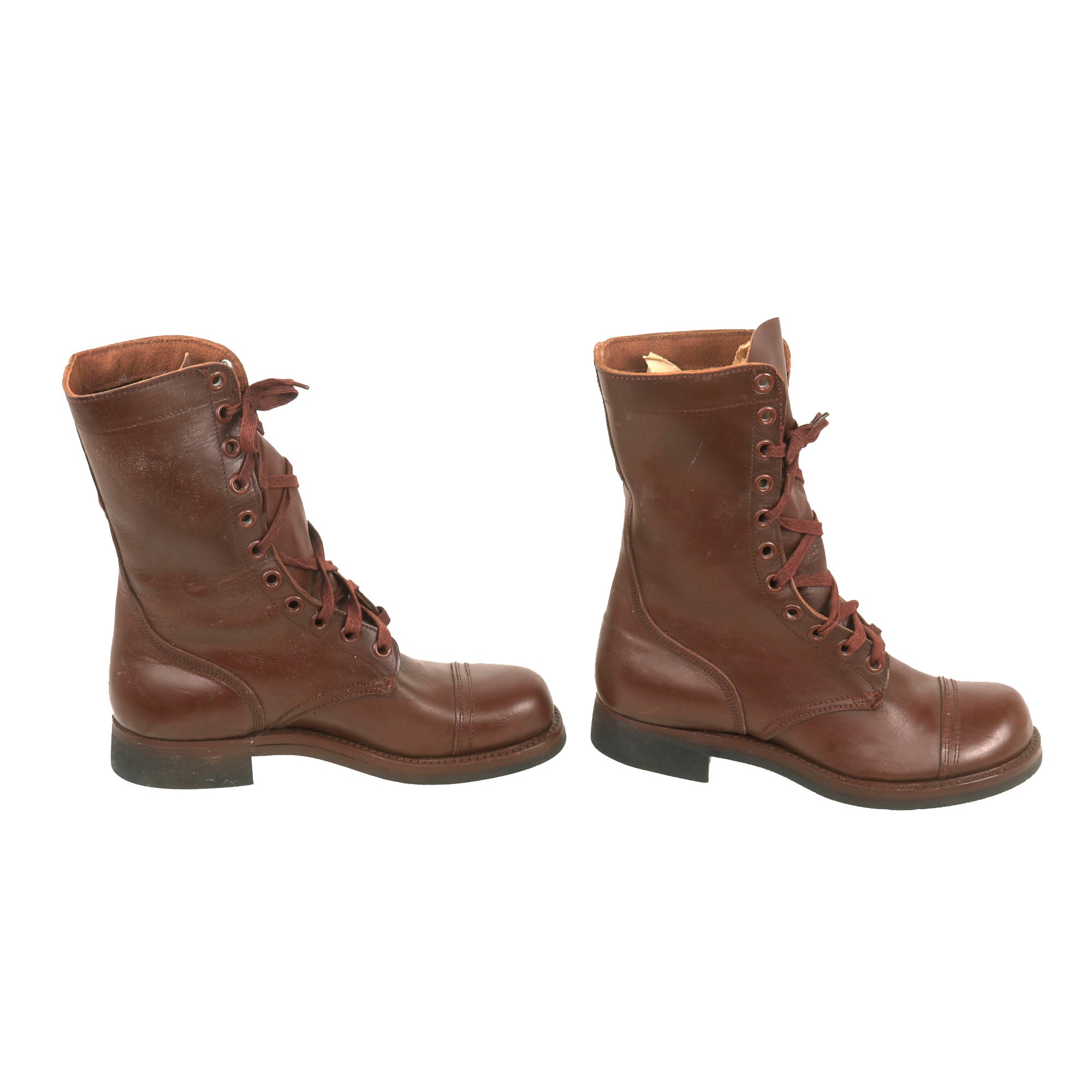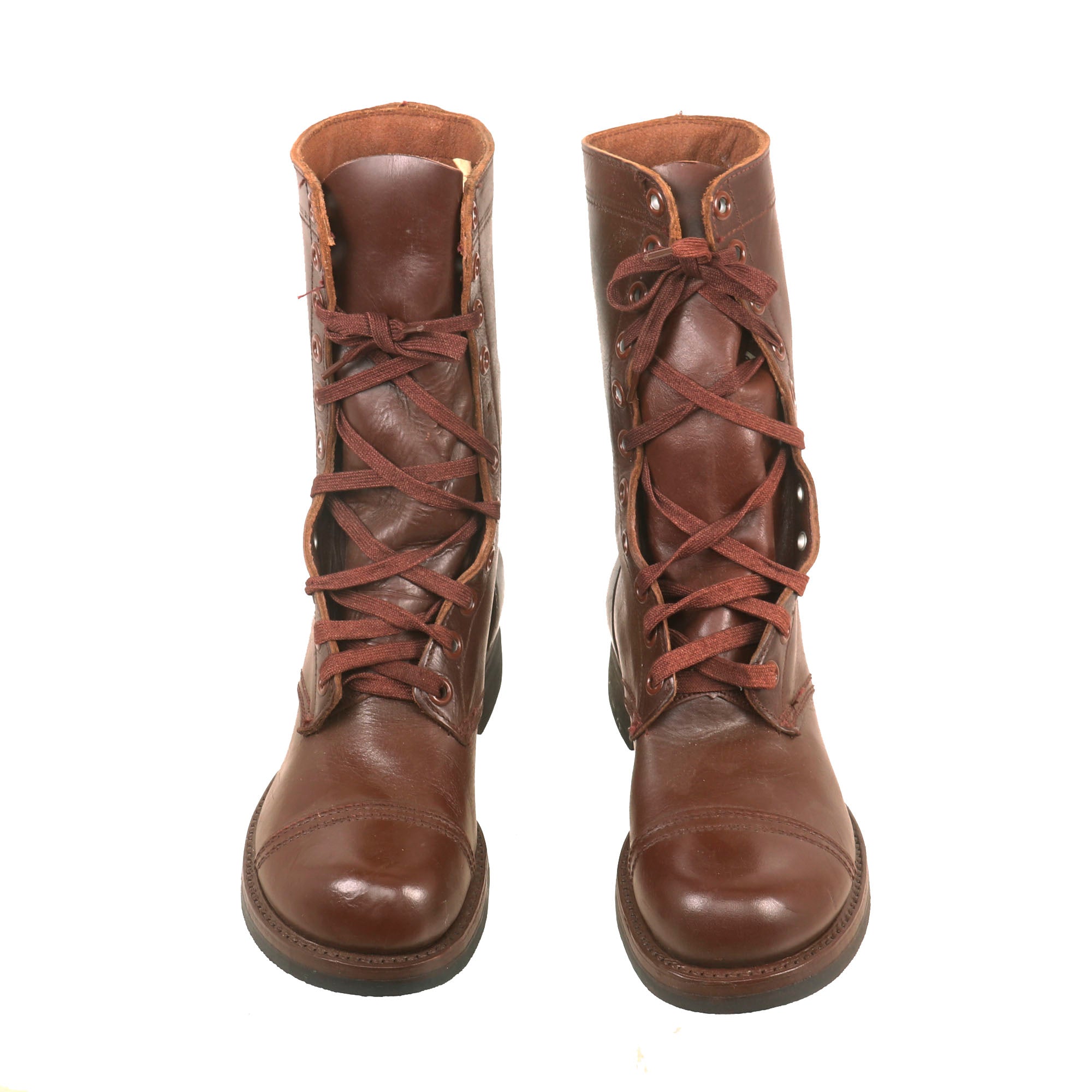 Original Item: Only One Pair Available. This is an excellent condition, nearly unissued pair of Korean War Era M1945 Russet Combat Boots in size 11 as marked on the inside and top exterior. These are very popular on the market, as they are almost identical to the WWII US paratrooper jump boots. They are non-steel toed with rubber nailed soles and rubber heels, and have eleven eyelet holes, as compared to the twelve seen on WWII Paratrooper boots.