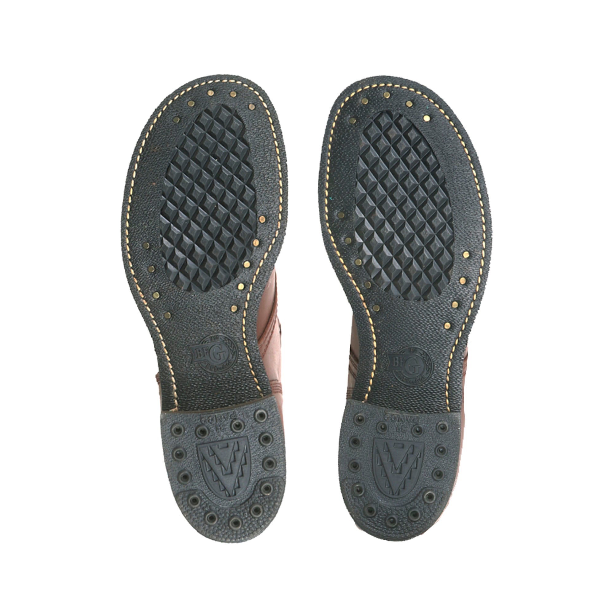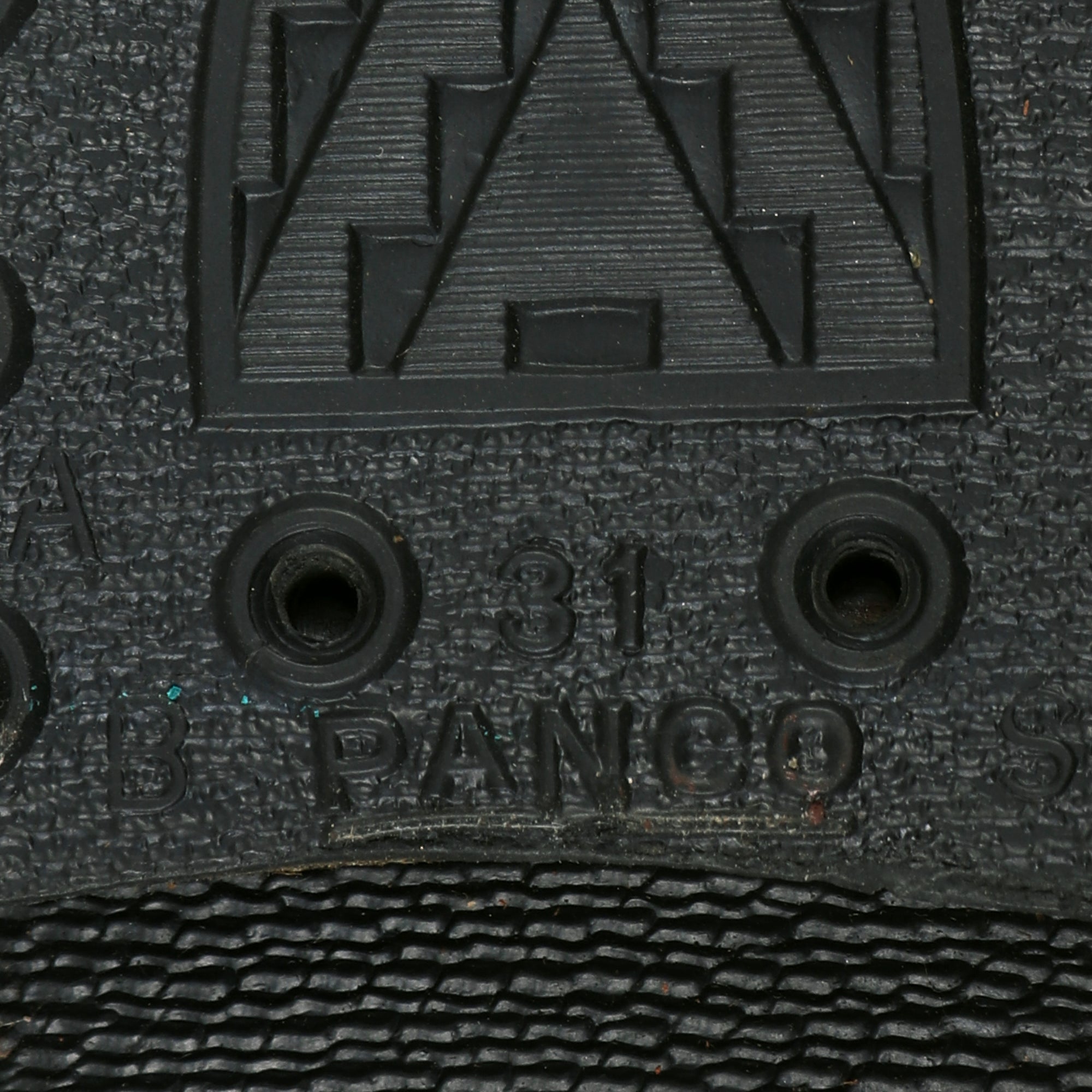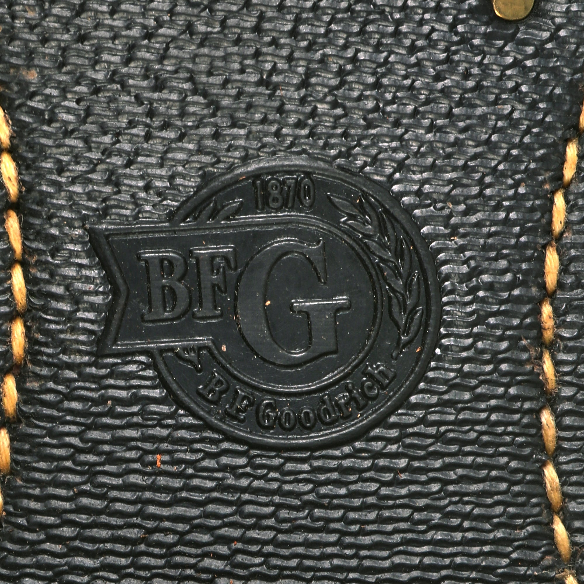 The markings on the inside of the boots are very worn, but we can barely make out a date of 1953 and the size, 11. There was likely a manufacturer’s mark but it’s now too faded. The soles of the boots have correct one piece rubber soles and heel pieces by B.F. Goodrich, with the correct logos and clipped corners on the front of the heels.