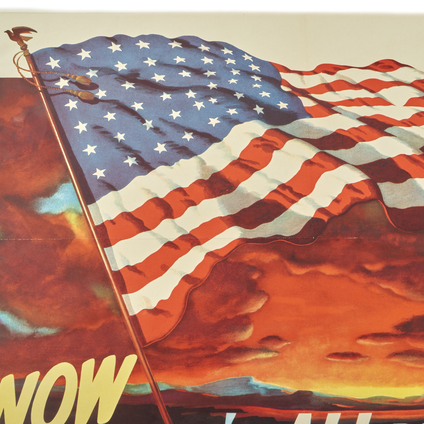 This 18 ½” x 26” poster with artwork by Garry Orr was printed in 1950 and features a lovely American flag flying in front of a beautiful sunset. The text at the bottom features the following message: