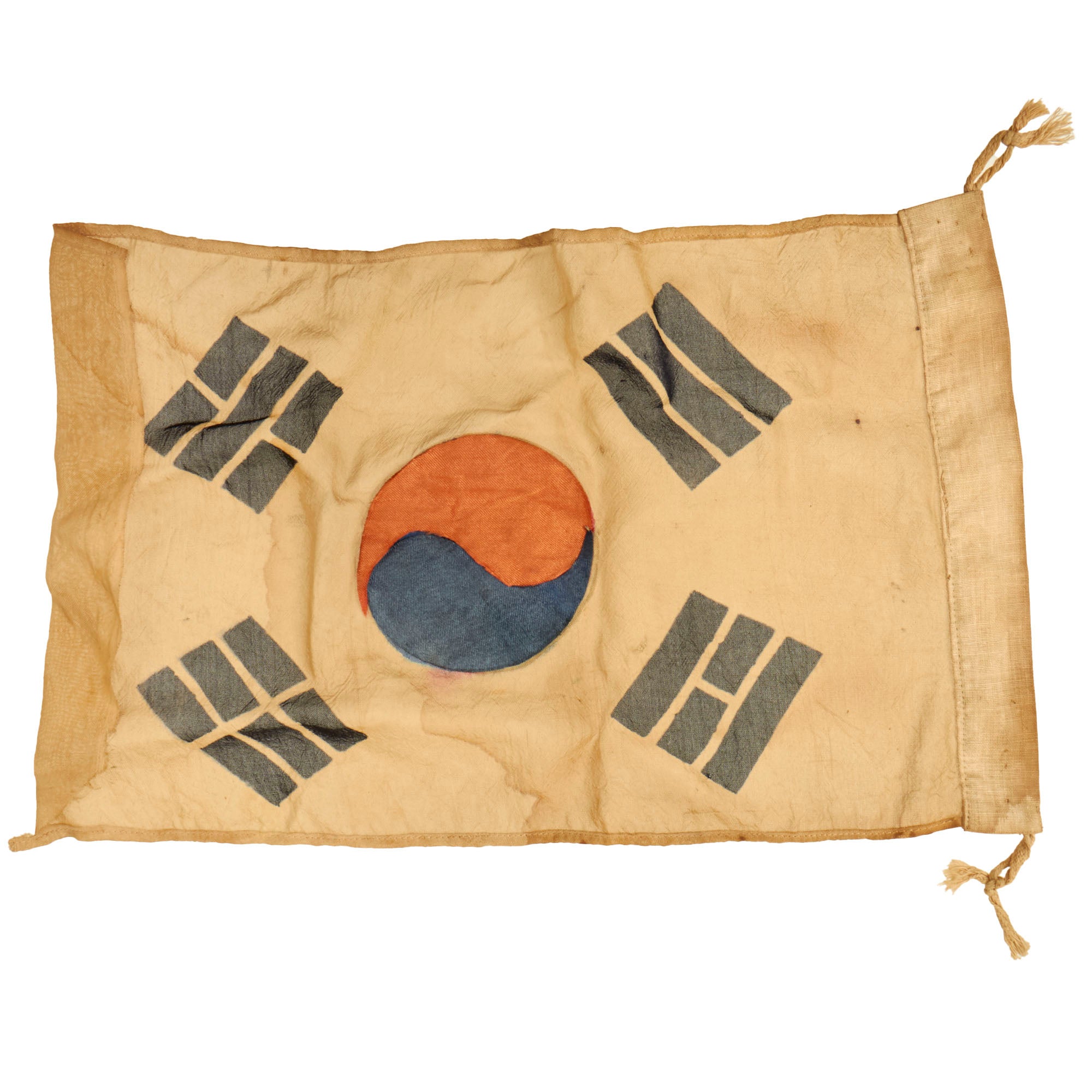 Original Item. Only One Available. This is a great small-sized South Korean souvenir flag likely brought home to the United States by a GI. The flag measures 8½ x 14 inches and has a header with two small strings for hanging. This is a multi-piece construction with the red & blue circle being two separate stitched pieces.