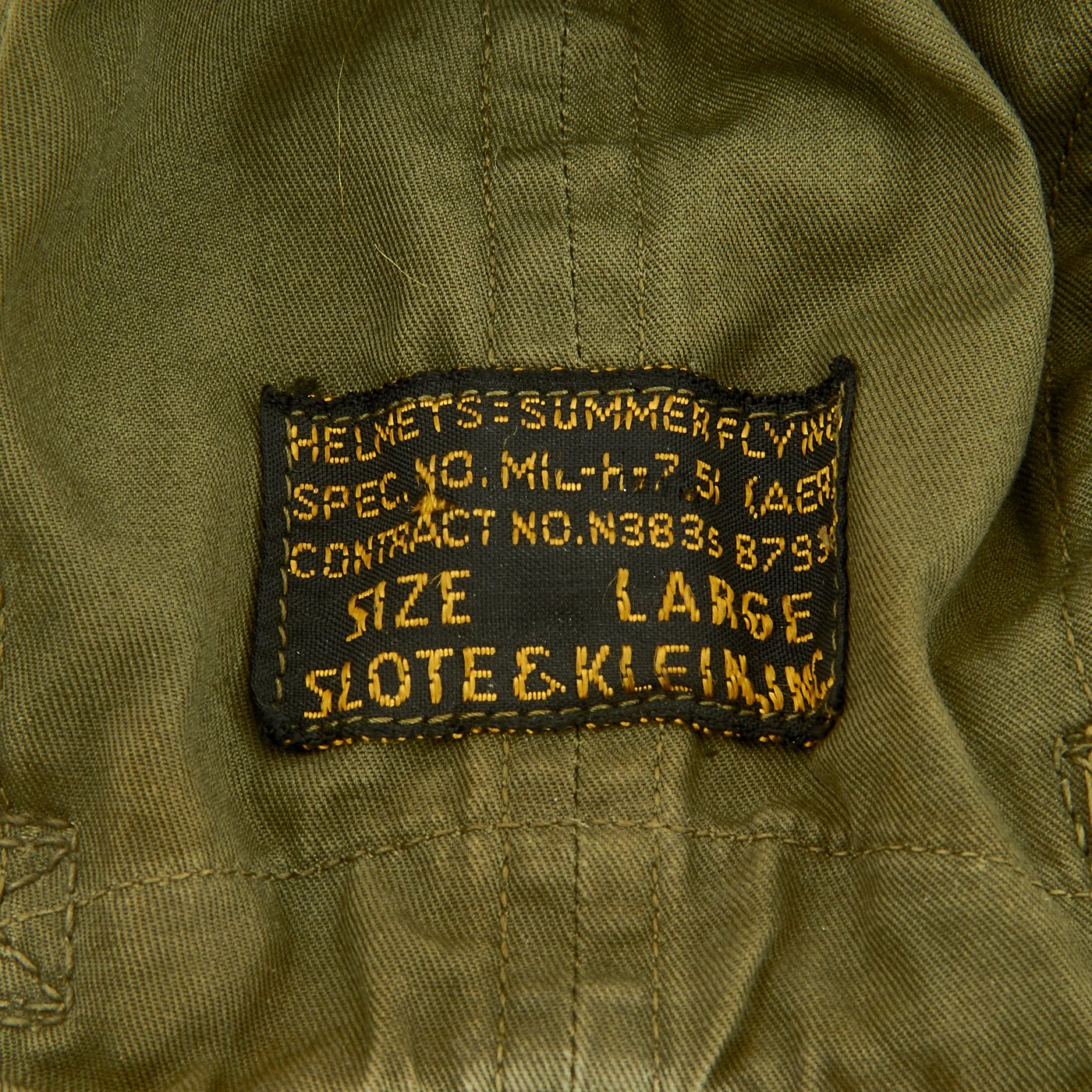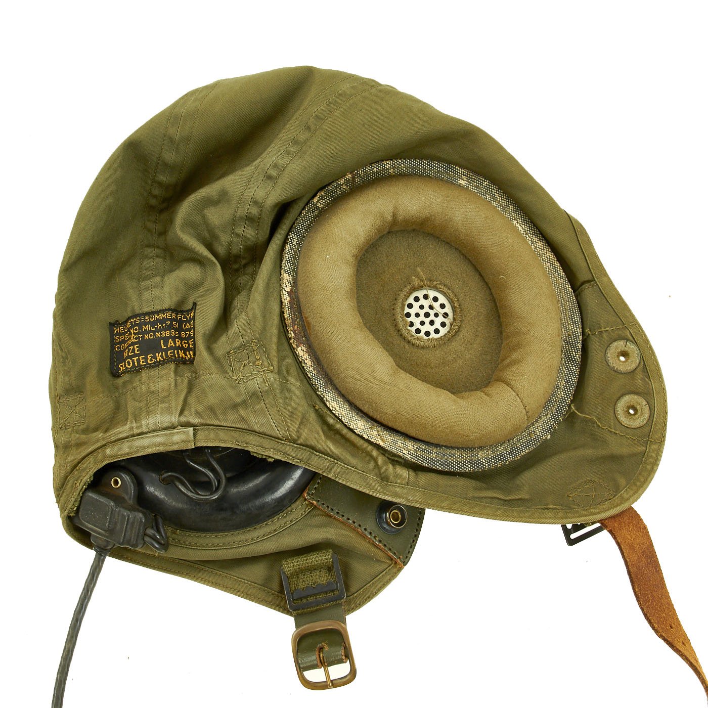 - Original Item: Only One Available. Vintage late 40’s 50’s US Army / Air Force Pilot Summer Flying Helmet with avionics. Tag reads: Summer Flying, Spec. MIL-H-7151 (AER) Contract No. N383s – 87931 Size Large, Slote & Klein Inc.