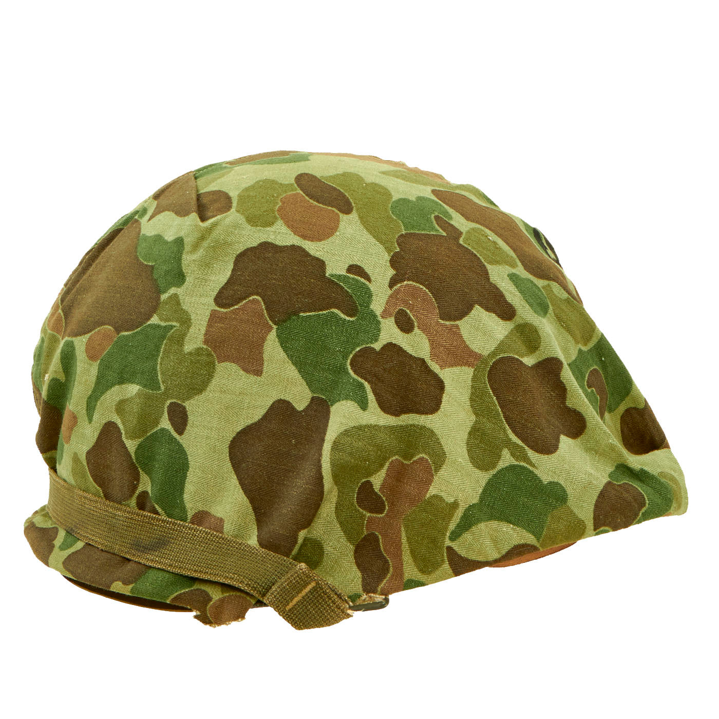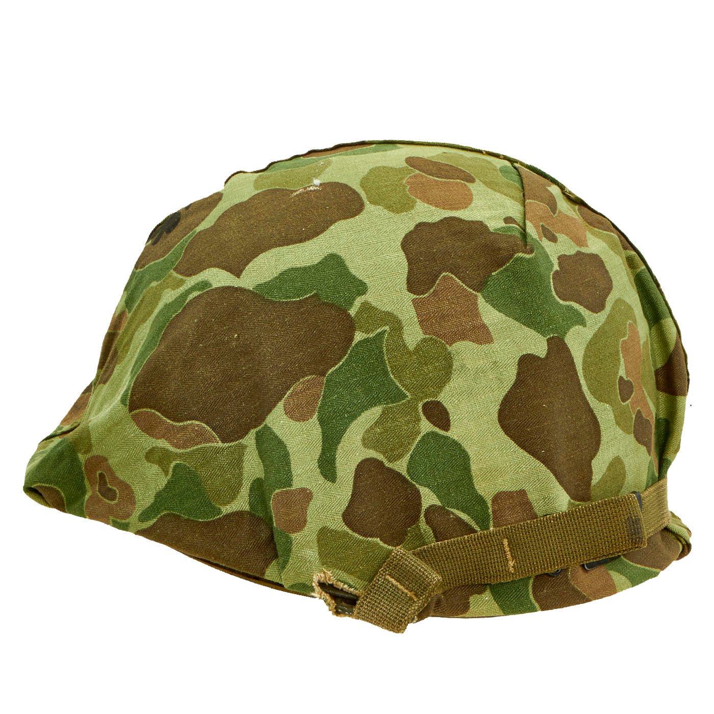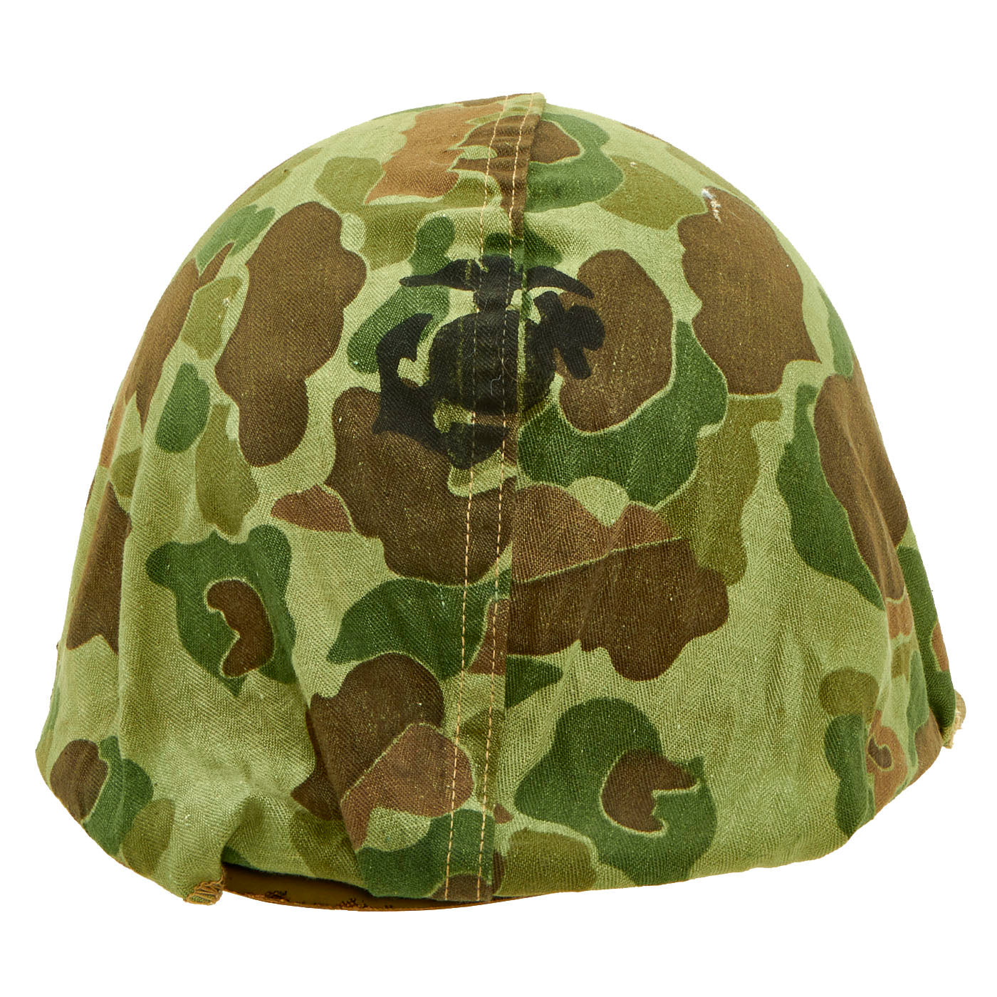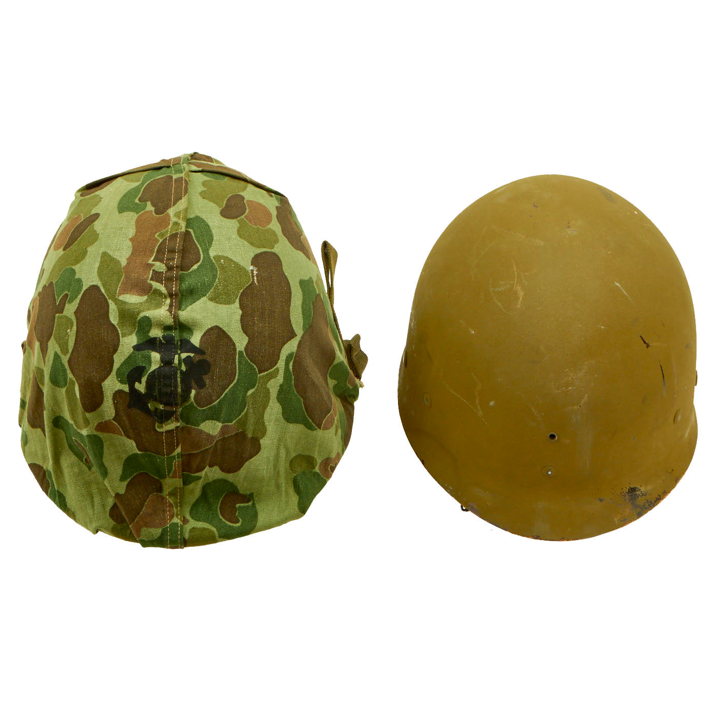 Original Item: Only One Available. This is a very nice example of a Korean War Era U.S. Marine Corps Issue M1 Helmet as used during the Korean War Era and into the early Vietnam Conflict. The shell is a late WWII Produced M1 Helmet, with a front seam swivel bale made by Schleuter. The Helmet comes with an excellent condition U.S. Marine Corps Reversible Camouflage Cover with one of the flaps cut off. The helmet is complete with a late issue, Korean War Era, "High Pressure" liner and a possible replacement leather chinstrap. The complete set is in issued condition, it does show signs of honest wear, storage age, and handling over the decades.