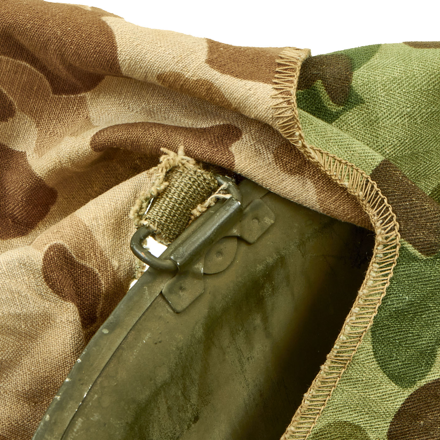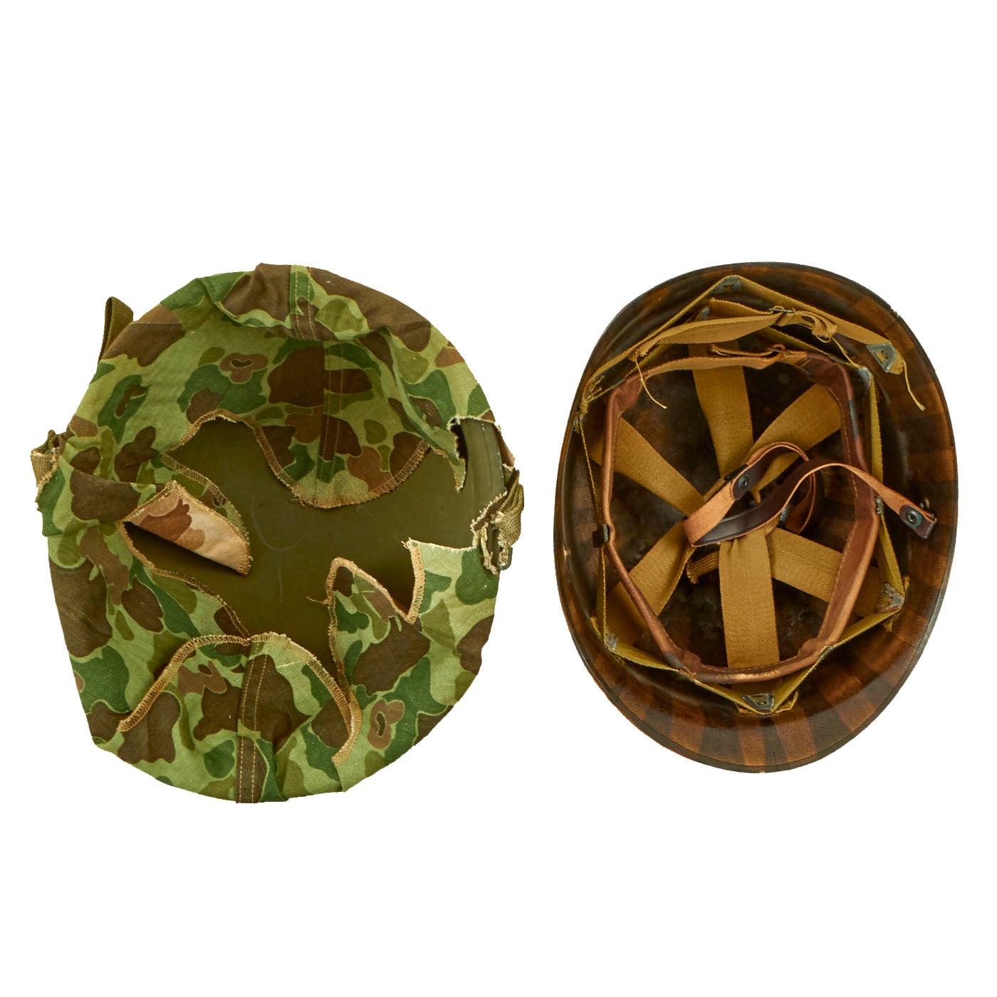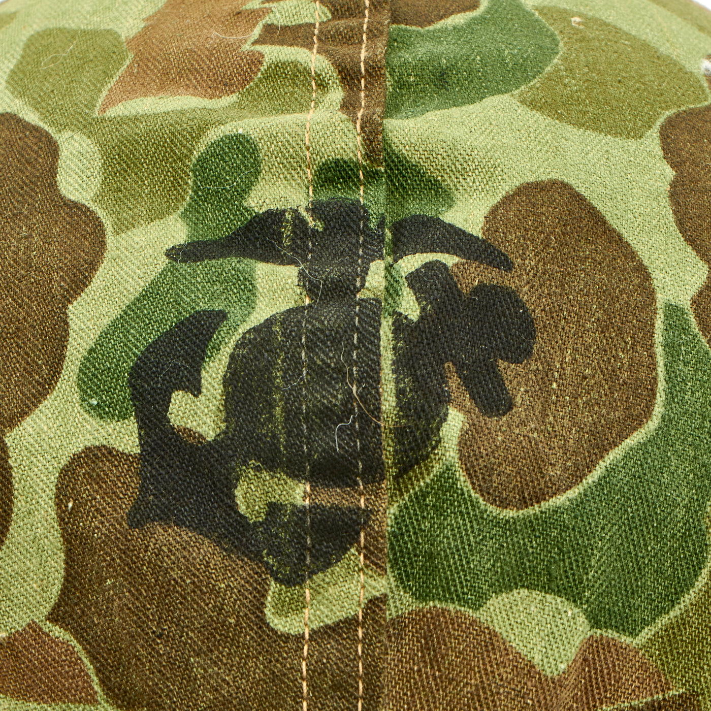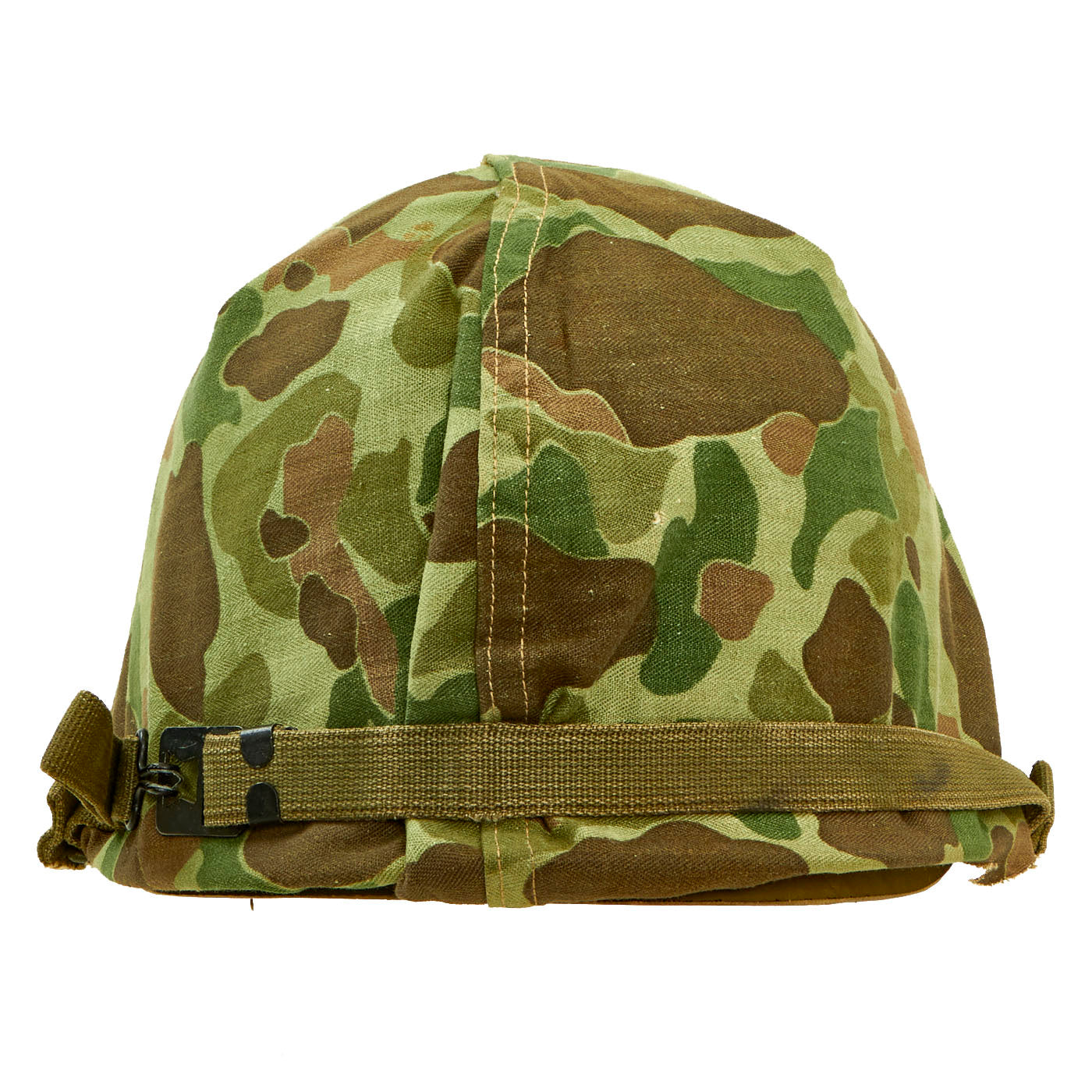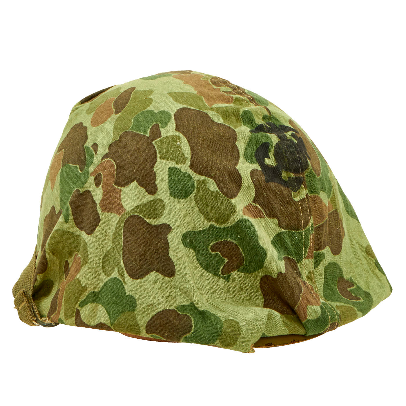 Original Item: Only One Available. This is a very nice example of a Korean War Era U.S. Marine Corps Issue M1 Helmet as used during the Korean War Era and into the early Vietnam Conflict. The shell is a late WWII Produced M1 Helmet, with a front seam swivel bale made by Schleuter. The Helmet comes with an excellent condition U.S. Marine Corps Reversible Camouflage Cover with one of the flaps cut off. The helmet is complete with a late issue, Korean War Era, "High Pressure" liner and a possible replacement leather chinstrap. The complete set is in issued condition, it does show signs of honest wear, storage age, and handling over the decades.