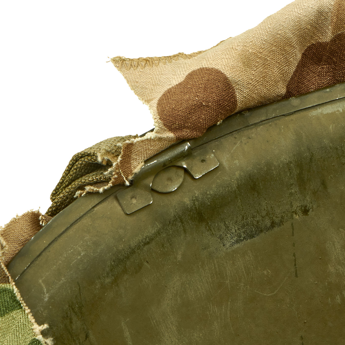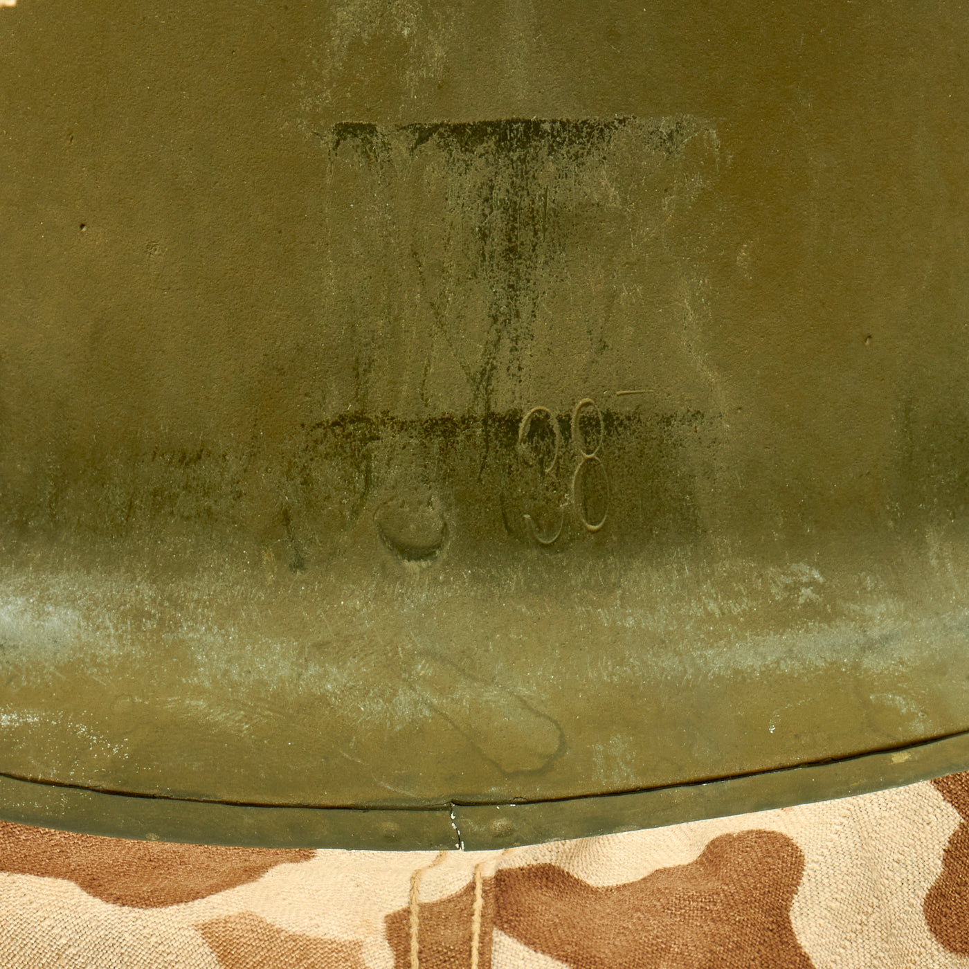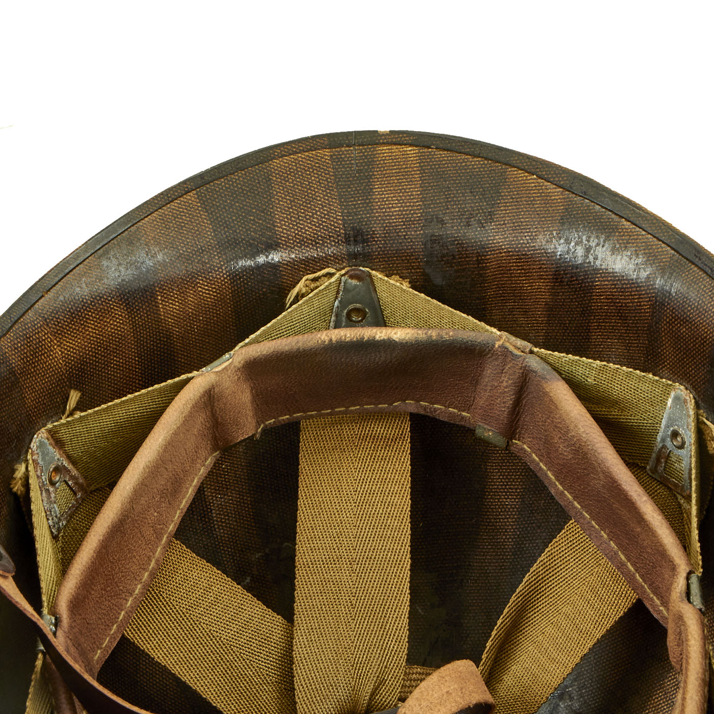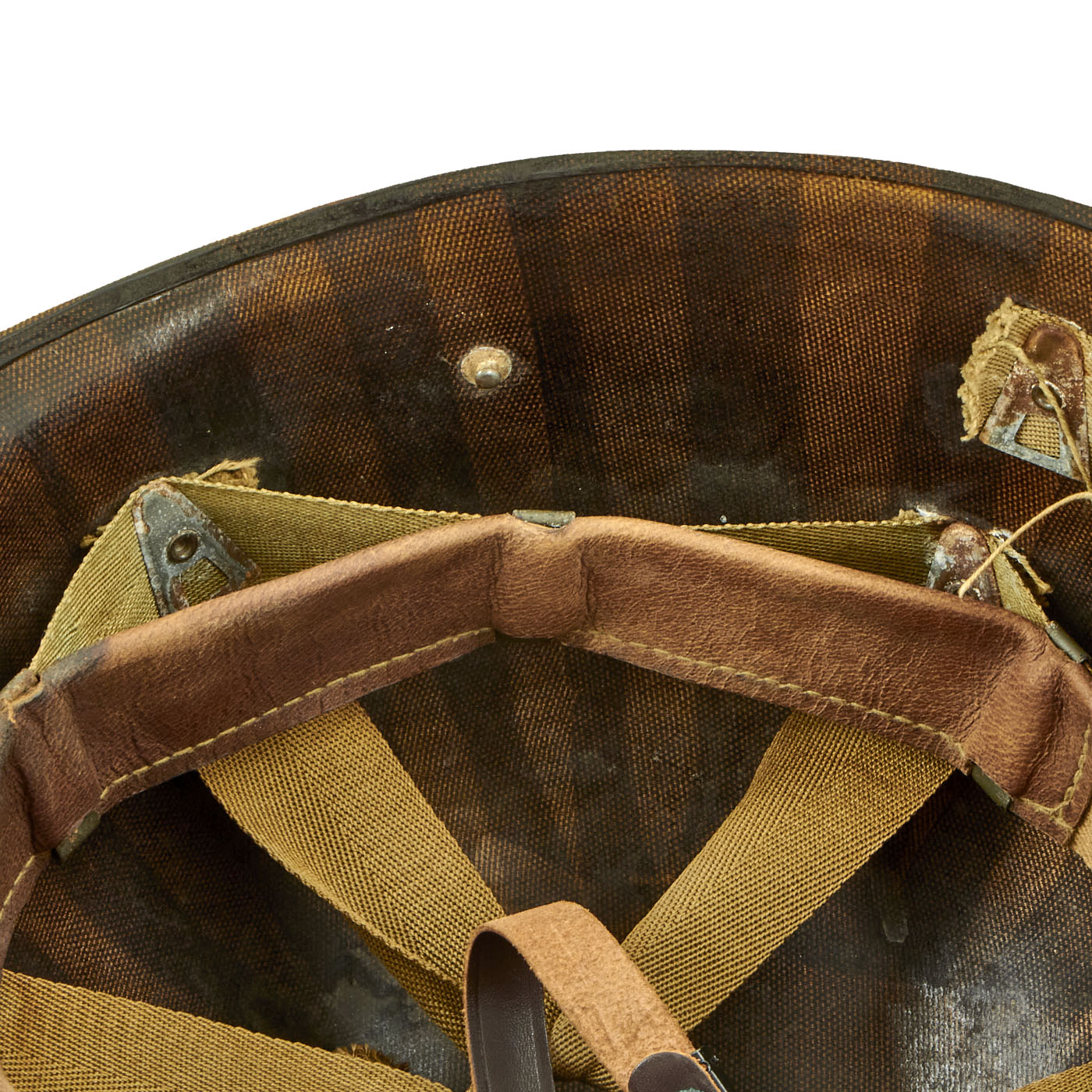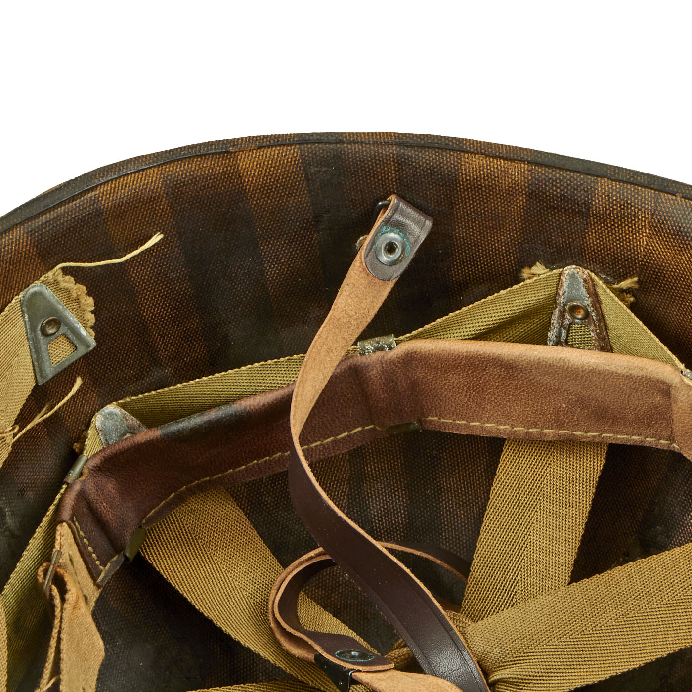 The liner exhibits an excellent amount of original paint, with clean OD7 Olive Drab Webbing secured by “A”-Washers. The sweatband date cannot be found. The nape strap is khaki and is adjustable which dates to late-WWII. As typical for a helmet of this era, it is a mix of parts from various dates.