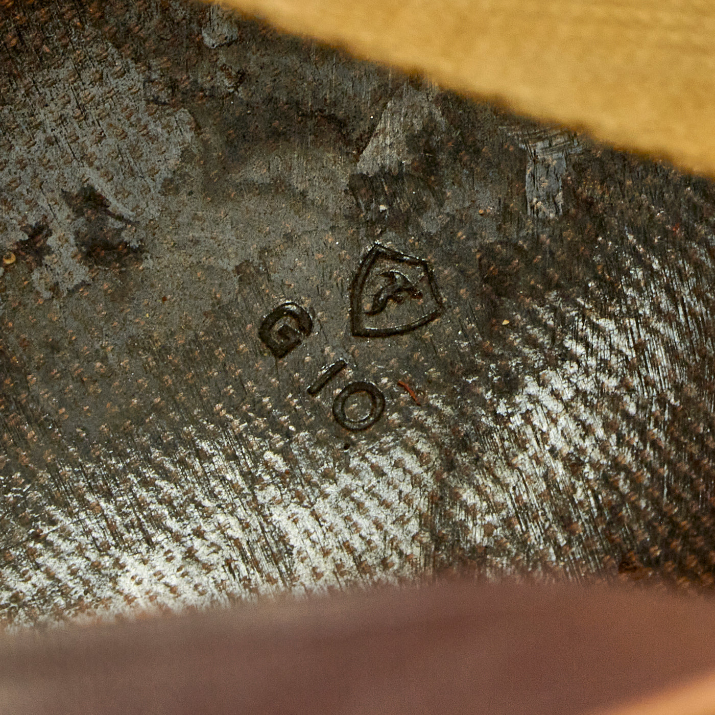 The early M-1 helmet shells had a set of fixed (static) chinstrap loops called "bales" and a stainless steel rim. These rims were both rust resistant and had "non-magnetic qualities" that reduced the chance of error readings when placed around certain sensitive equipment (such as a compass). In October 1943, issues with the fixed bales breaking off resulted in a change to the "swivel bales" that this helmet has. In 1944, to deal with paint wearing off the very shiny stainless steel rim, the material was changed to manganese steel in October, and then the seam moved to the rear in November.