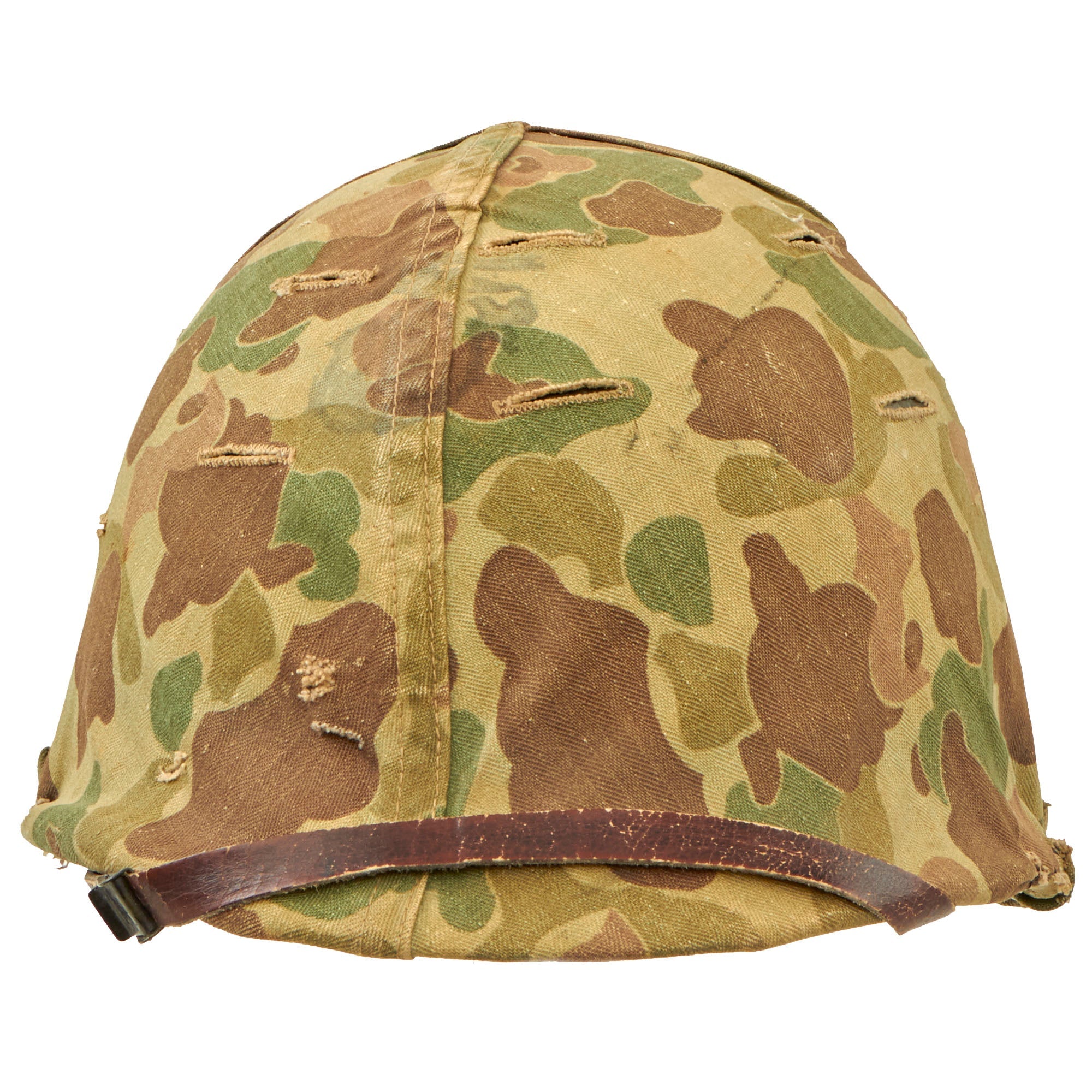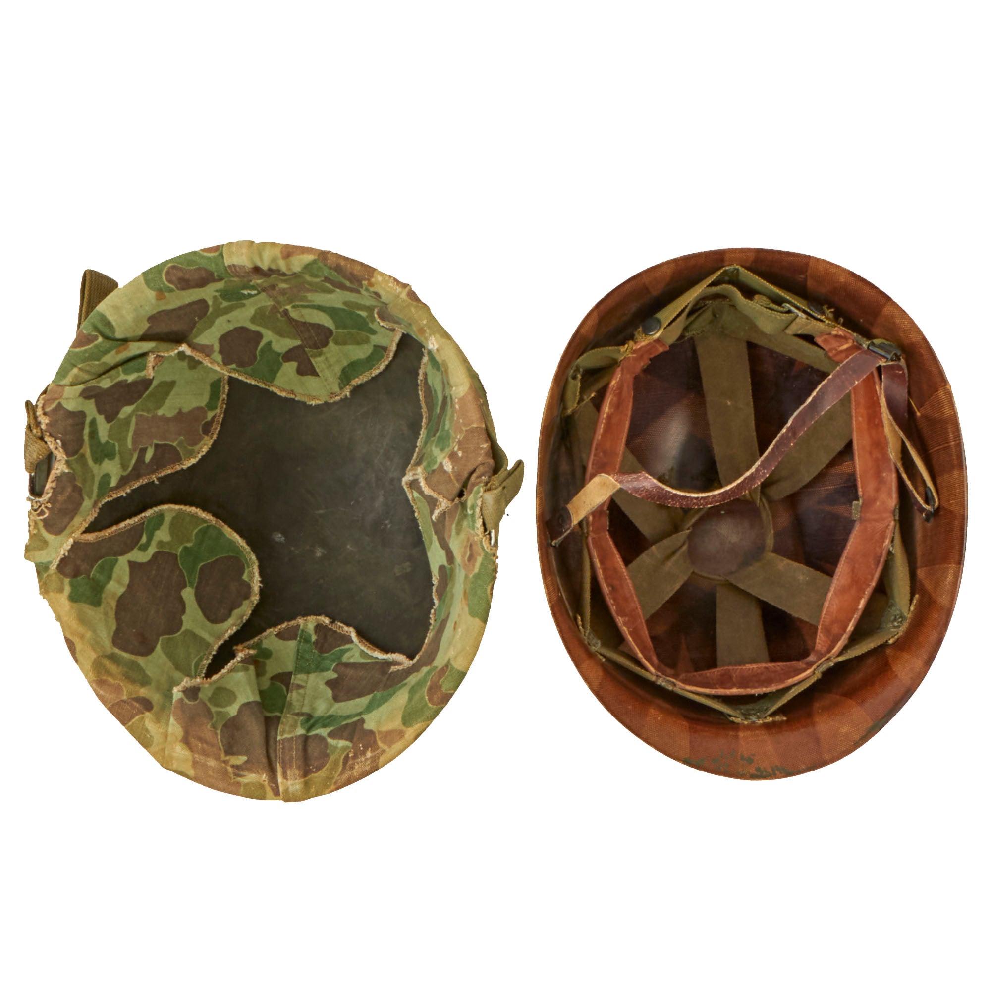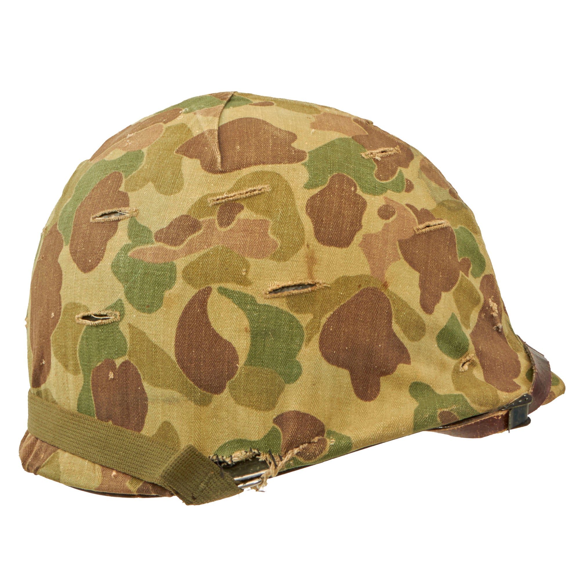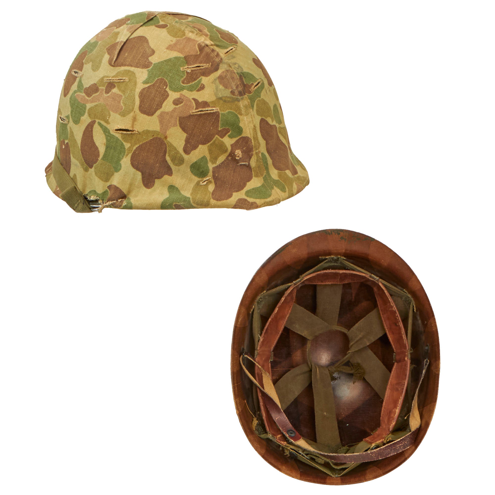 The Helmet comes with a great service worn condition 1953 dated U.S. Marine Corps Reversible Camouflage Cover, which still has a stamped EGA on the front which was done during the Korean War and not WWII. One of the inner flaps still has a faint manufacturer stamp: