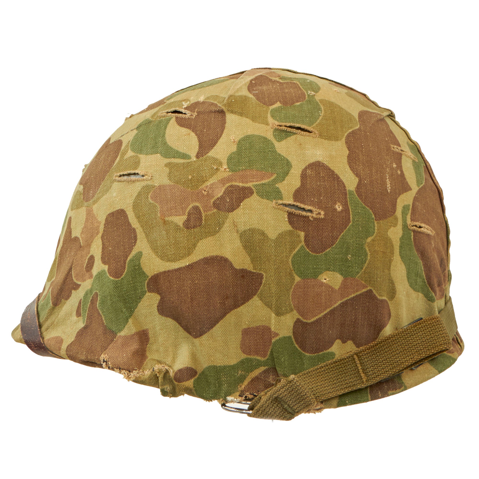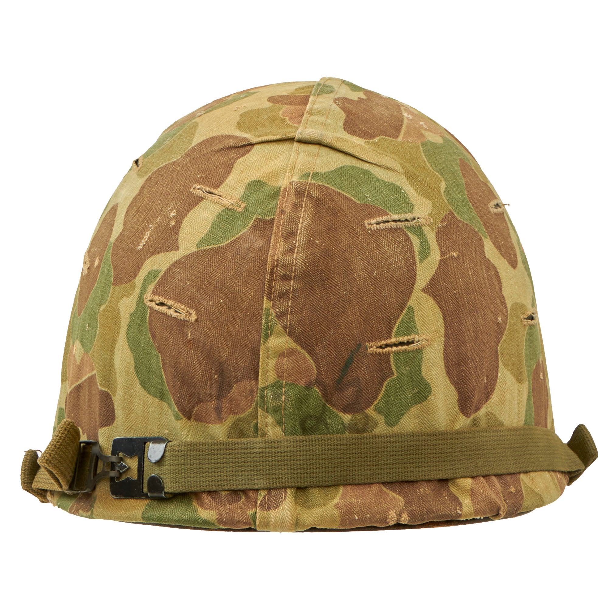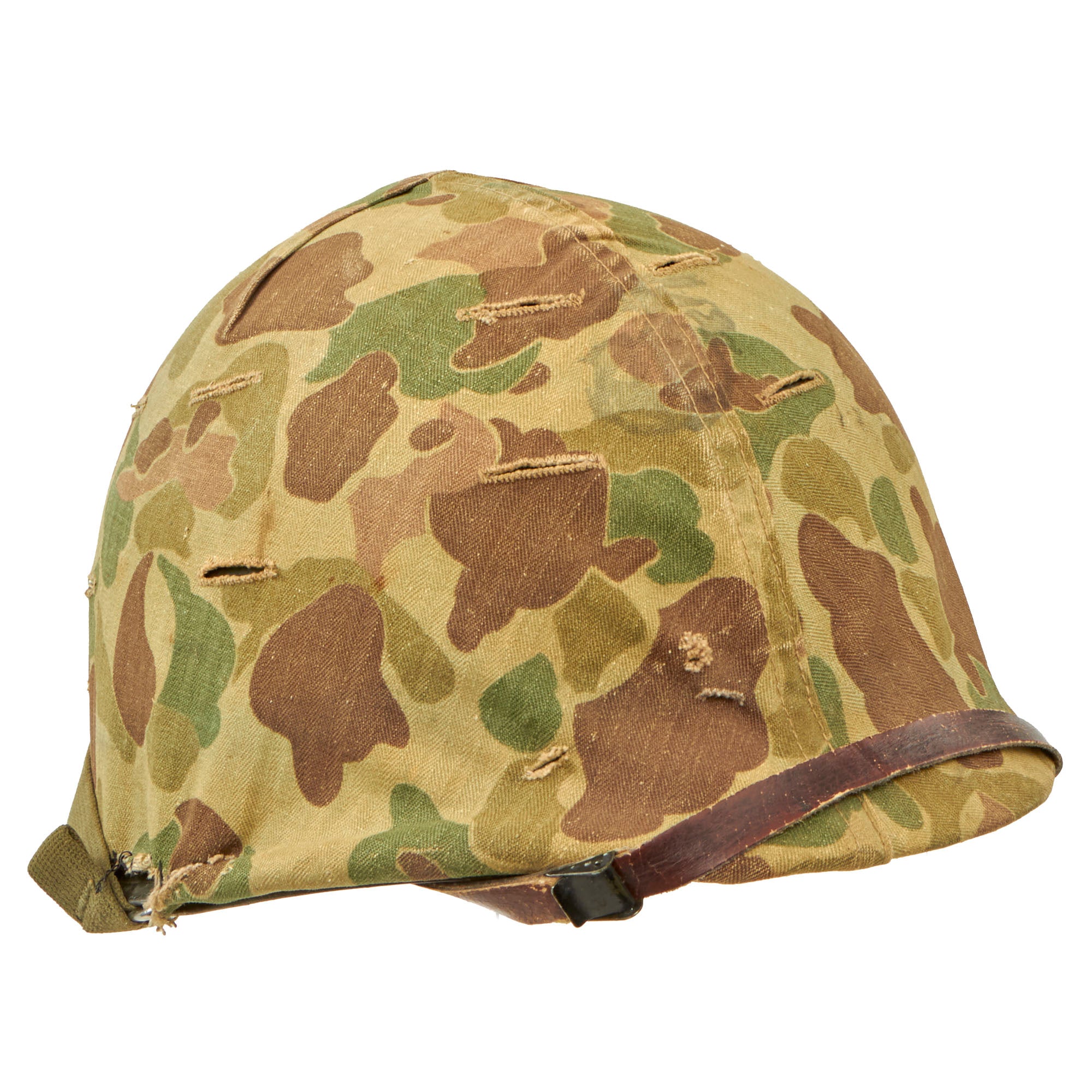The Helmet comes with a great service worn condition 1953 dated U.S. Marine Corps Reversible Camouflage Cover, which still has a stamped EGA on the front which was done during the Korean War and not WWII. One of the inner flaps still has a faint manufacturer stamp: