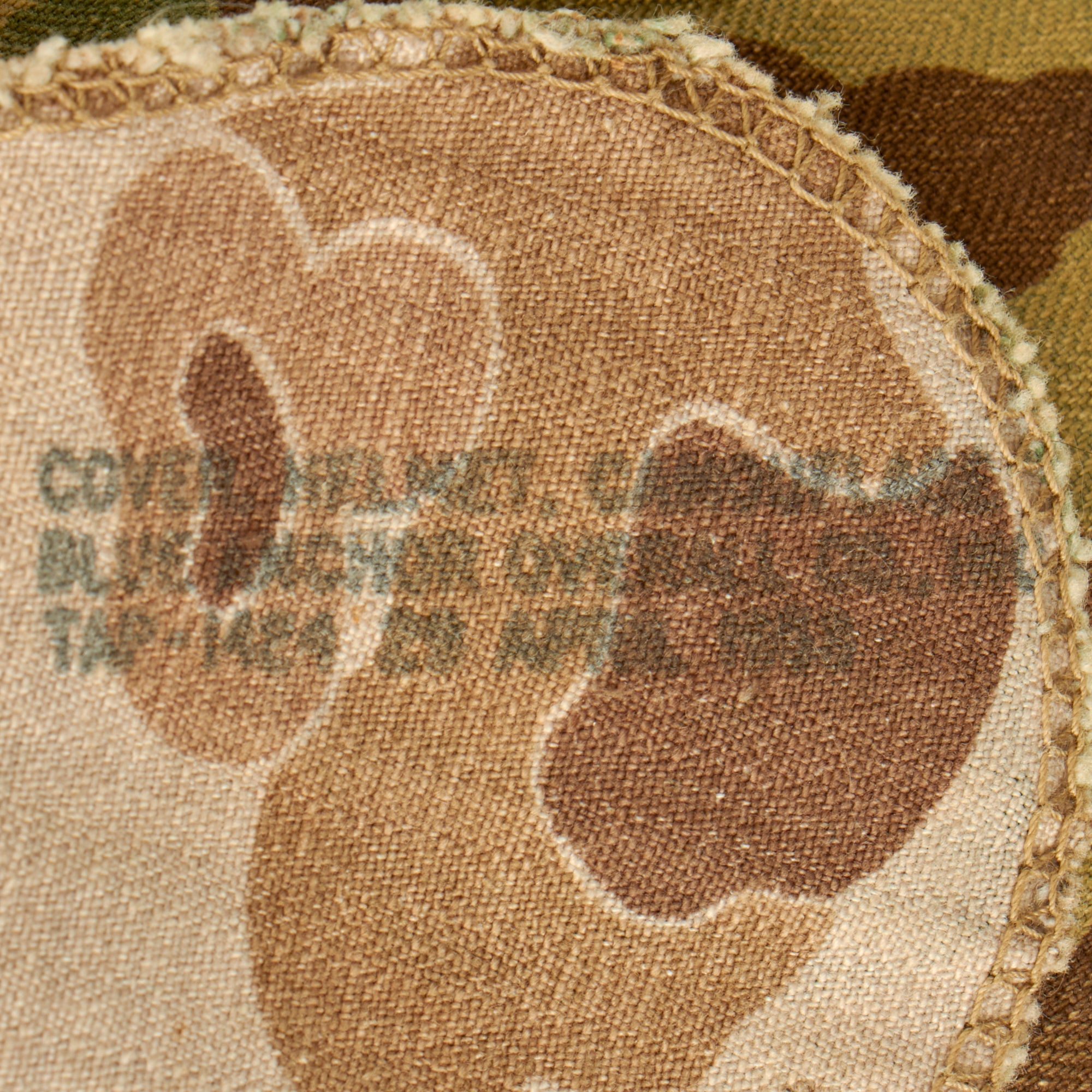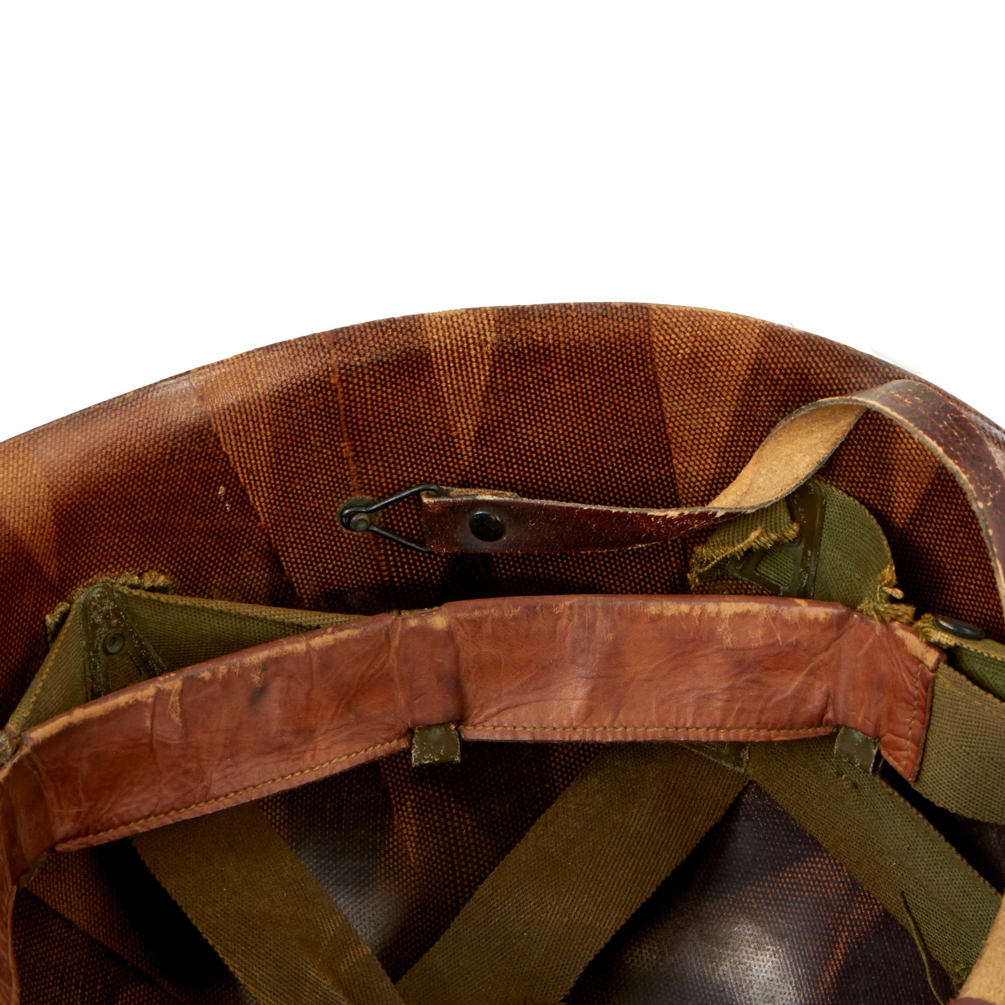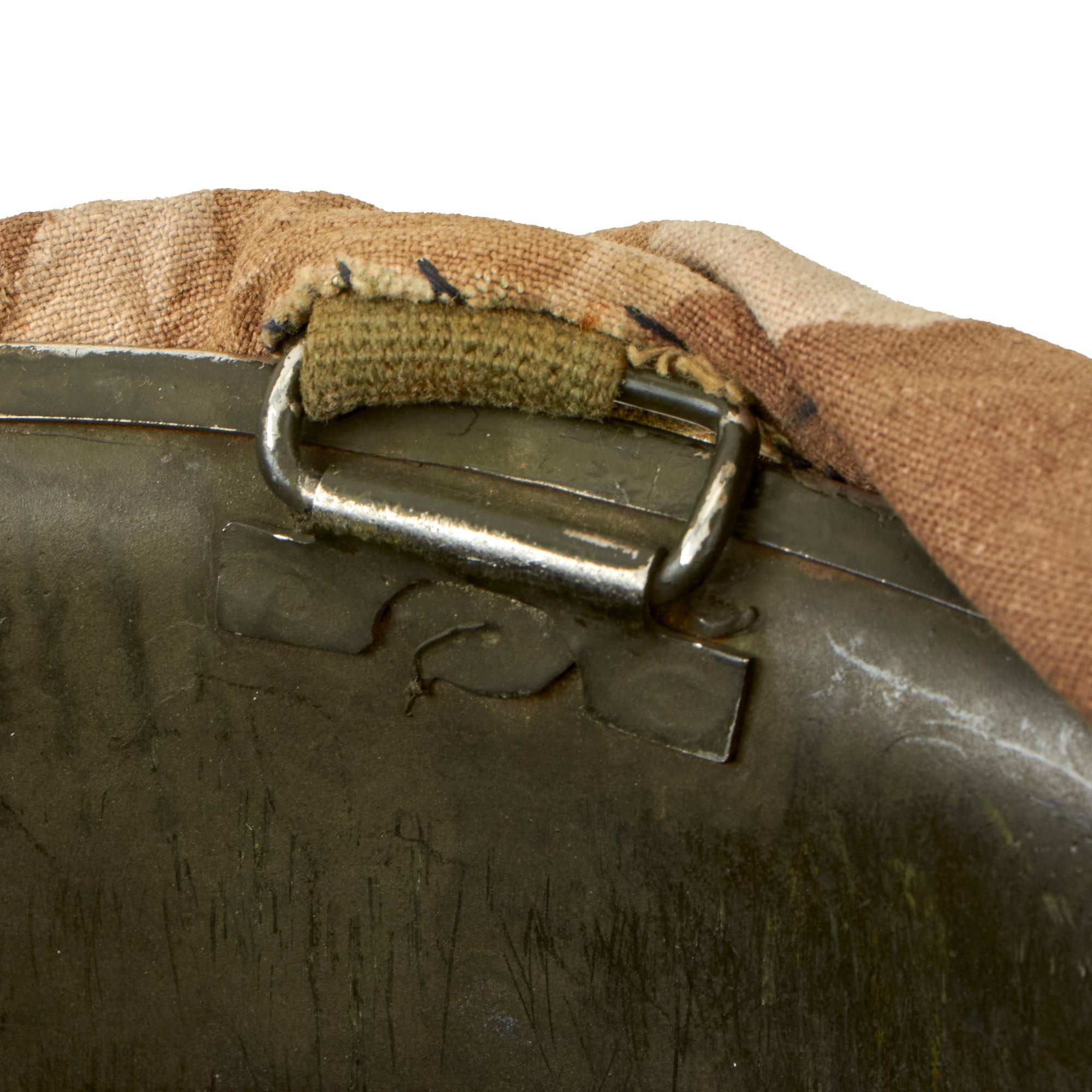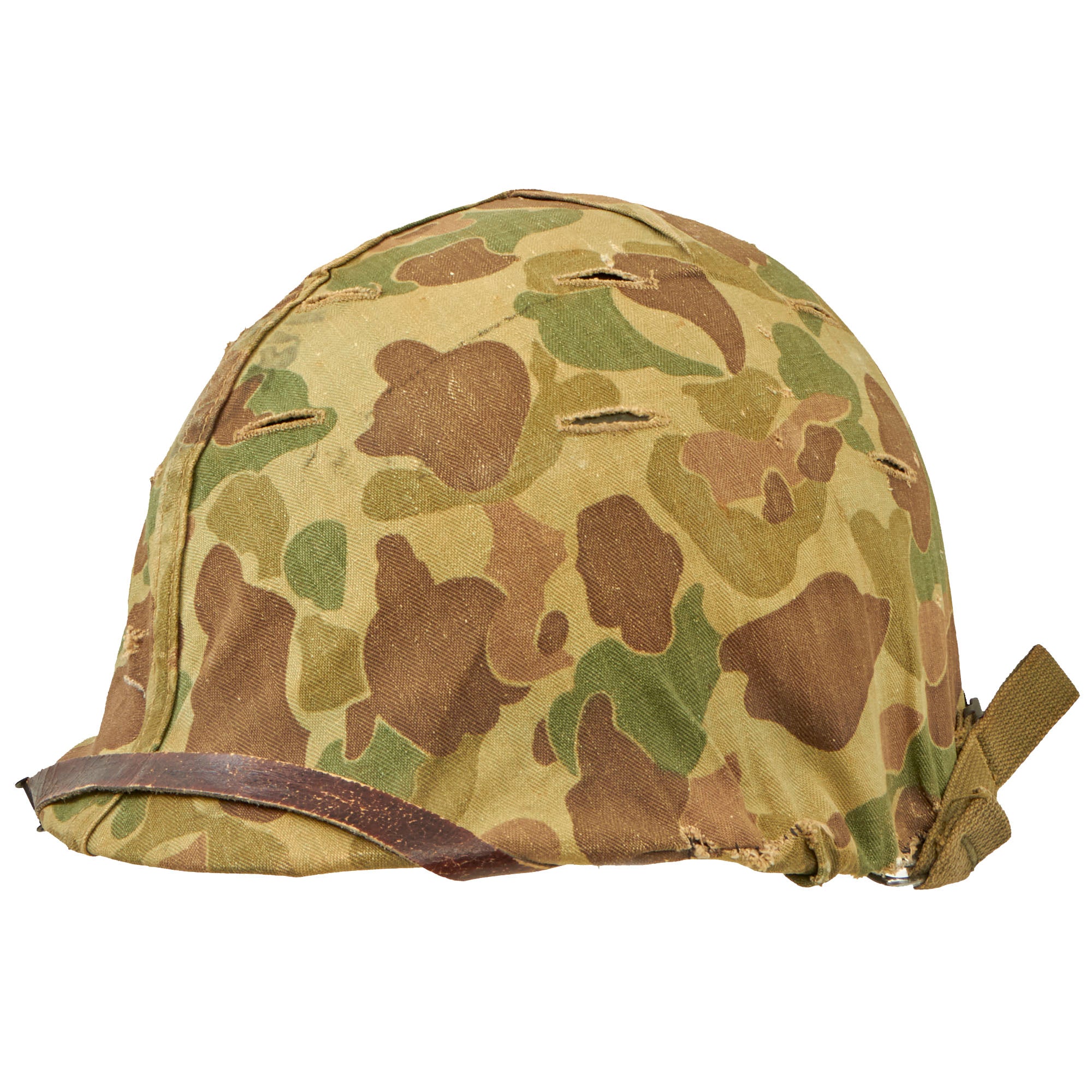 The Helmet comes with a great service worn condition 1953 dated U.S. Marine Corps Reversible Camouflage Cover, which still has a stamped EGA on the front which was done during the Korean War and not WWII. One of the inner flaps still has a faint manufacturer stamp:
