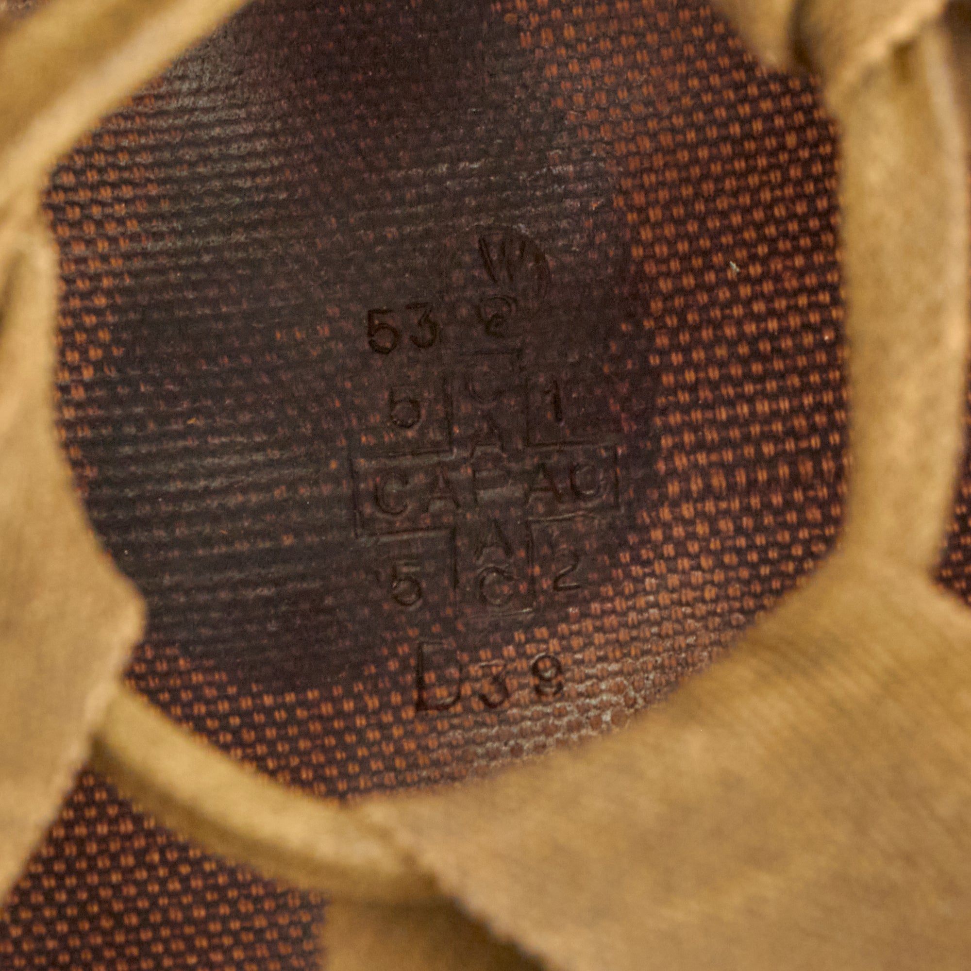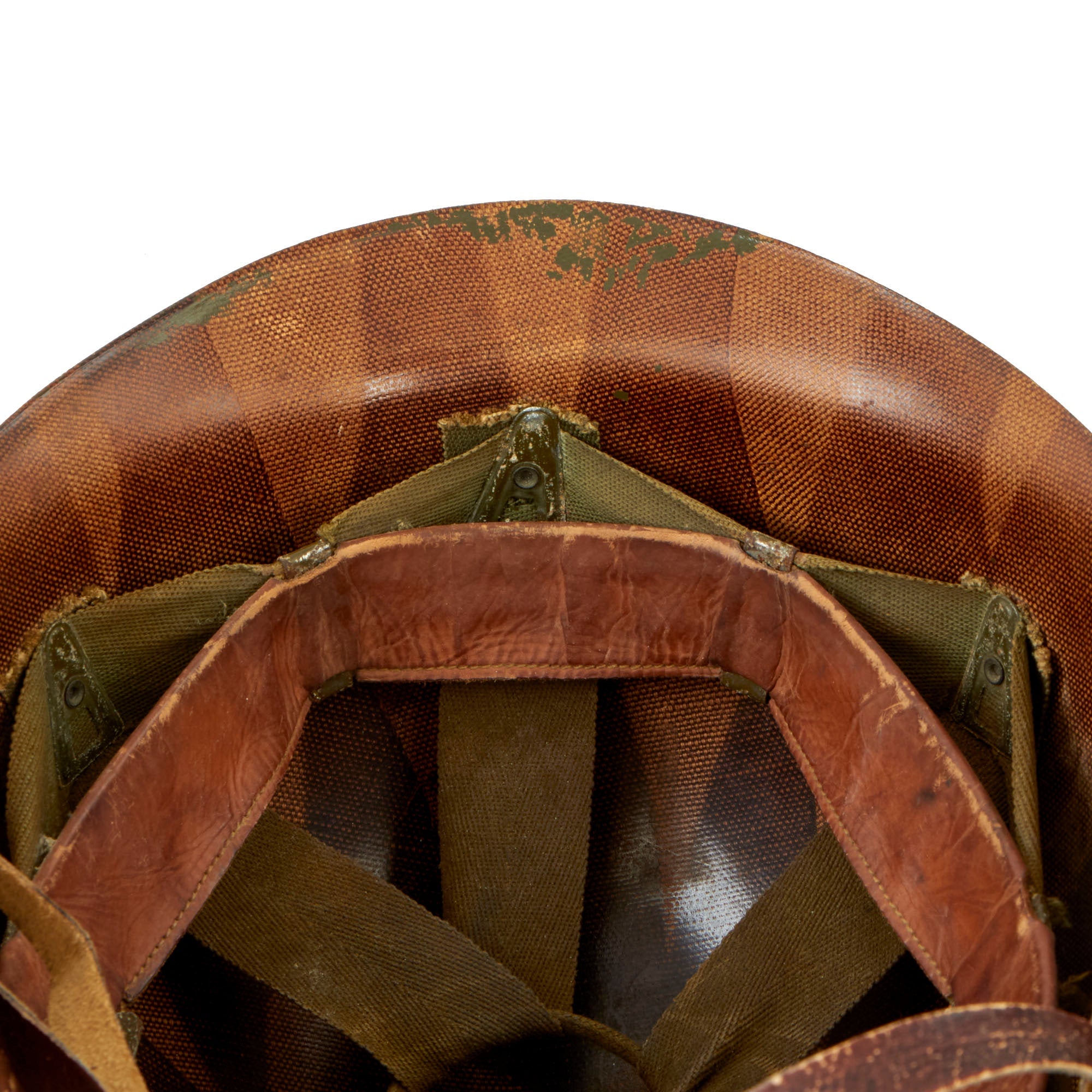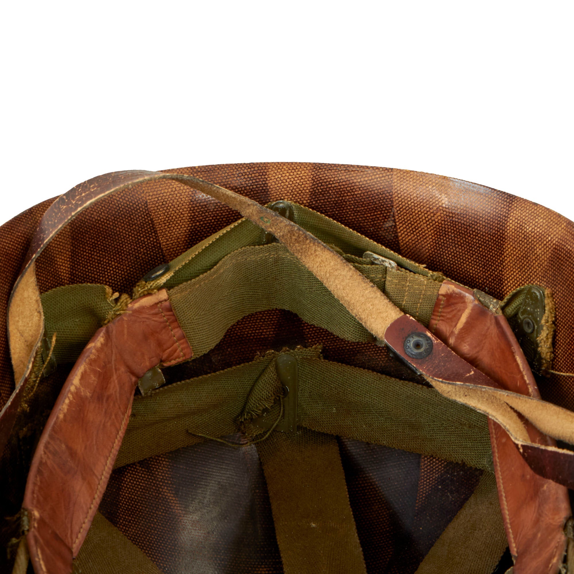 The helmet is complete with a late issue, Korean War Era, "High Pressure" liner and leather chinstrap, with a CAPAC stamp on the crown over the Westinghouse logo. The liner has retained nearly all original paint. The interior has clean OD7 Olive Drab HBT Webbing secured by blacked “A”-Washers, which show some oxidation. The sweatband, nape strap, and chin strap are present and in mostly solid condition.