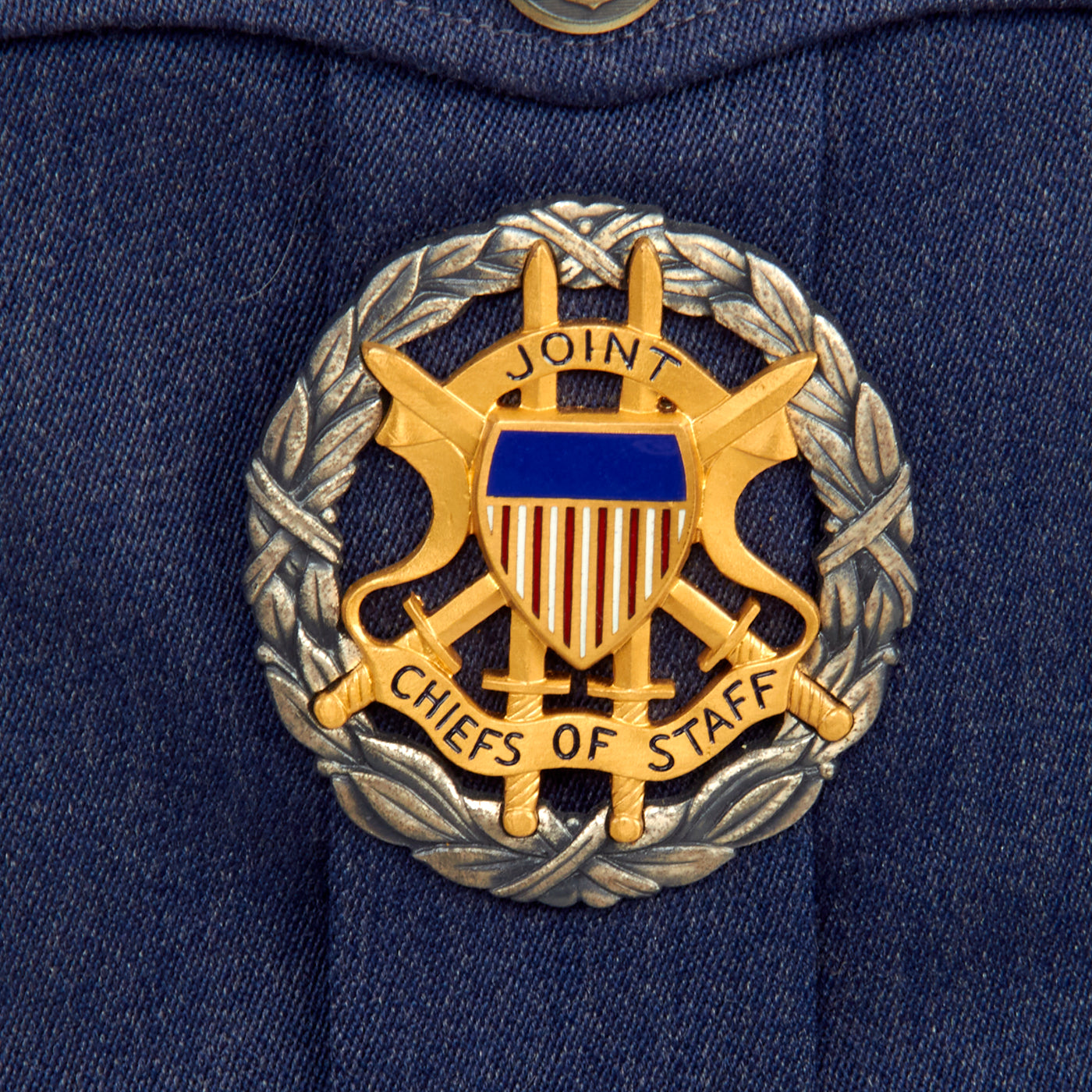 - Service Dress Uniform and Pants Dated 1959: This is a lovely uniform set that belonged to Evans. The uniform features a beautiful array of ribbons which shows service from the Korean War into the Vietnam War. The lower left breast has a beautiful Joint Chief of Staff insignia.