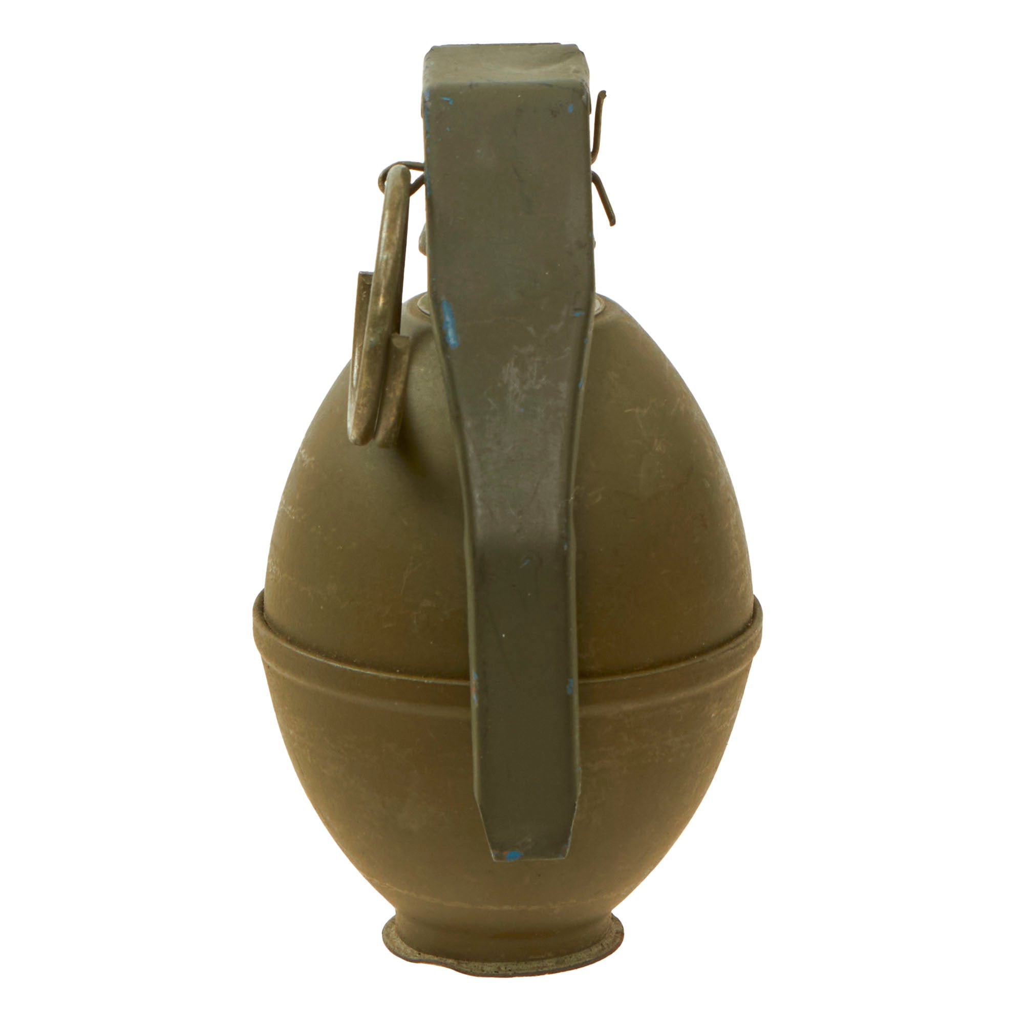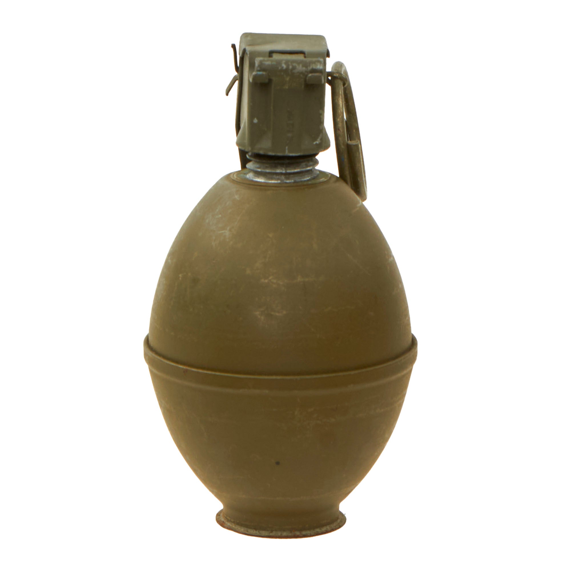 Original Item: Only One Available. Totally inert and demilitarized according to BATF guidelines with hollow body and inert fuse. This grenade cannot be converted to an explosive device and is not available for export.This is a hard to find Korean War or Vietnam War Era M26 "Lemon" grenade offered in good condition. The only condition issue is that the fuze does not screw into the grenade but does sit well for display purposes. It may be the incorrect fuze type. Otherwise the grenade is in great shape. Looking through the bottom shows the concentric fragmentation rings, a thing of beauty.The M26 is a fragmentation hand grenade made by the United States. The M26 is a fragmentation grenade developed by the United States military. It entered service around 1952 and was used in combat during the Korean War. Its distinct lemon shape led it to being nicknamed the "lemon grenade".Fragmentation is enhanced by a special pre-notched fragmentation coil that lies along the inside of the grenade's body. This coil had a circular cross-section in the M26 grenade and an improved square cross-section in the M26A1 and later designs.The M26 was developed as a result of studies on the Mk 2. Unlike its previous counterpart, its M204A1 fuse creates no tell-tale smoke or sparks when ignited and its powder train is almost silent while it burns down. Its Composition B filler was considered safer than the flaked or granular TNT filling used in the Mk 2.The M26 series was created after World War II to meet criticisms of the Mk 2. The original M26 replaced the Mk 2 Fragmentation Grenade as Army standard issue in Korea.Massive World War II production left the Mk 2 as limited standard issue with the US Army and US Marines throughout the 1960s and the US Navy until the 1970s. The M26A1 / M61 was the primary fragmentation grenade used by American forces in the Vietnam War.The M26 series (M26/M61/M57) was replaced by the M33 series grenade (M33/M67) at the end of the Vietnam War.
