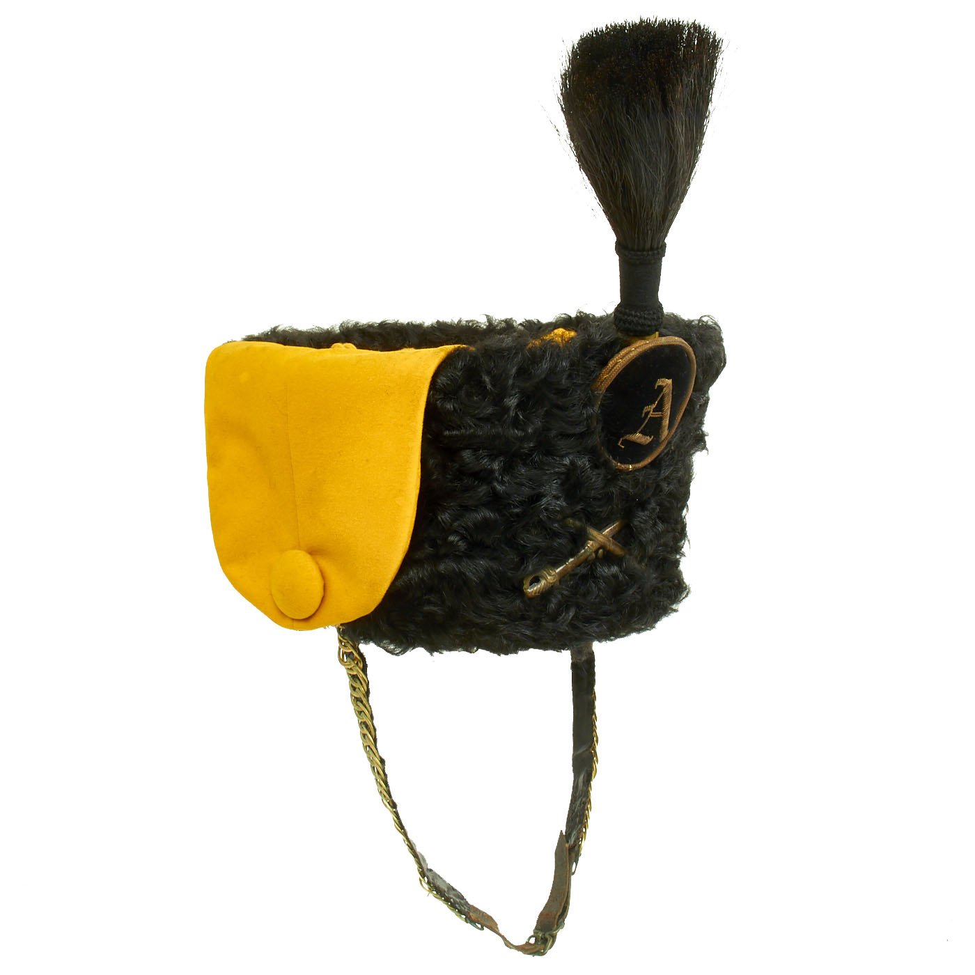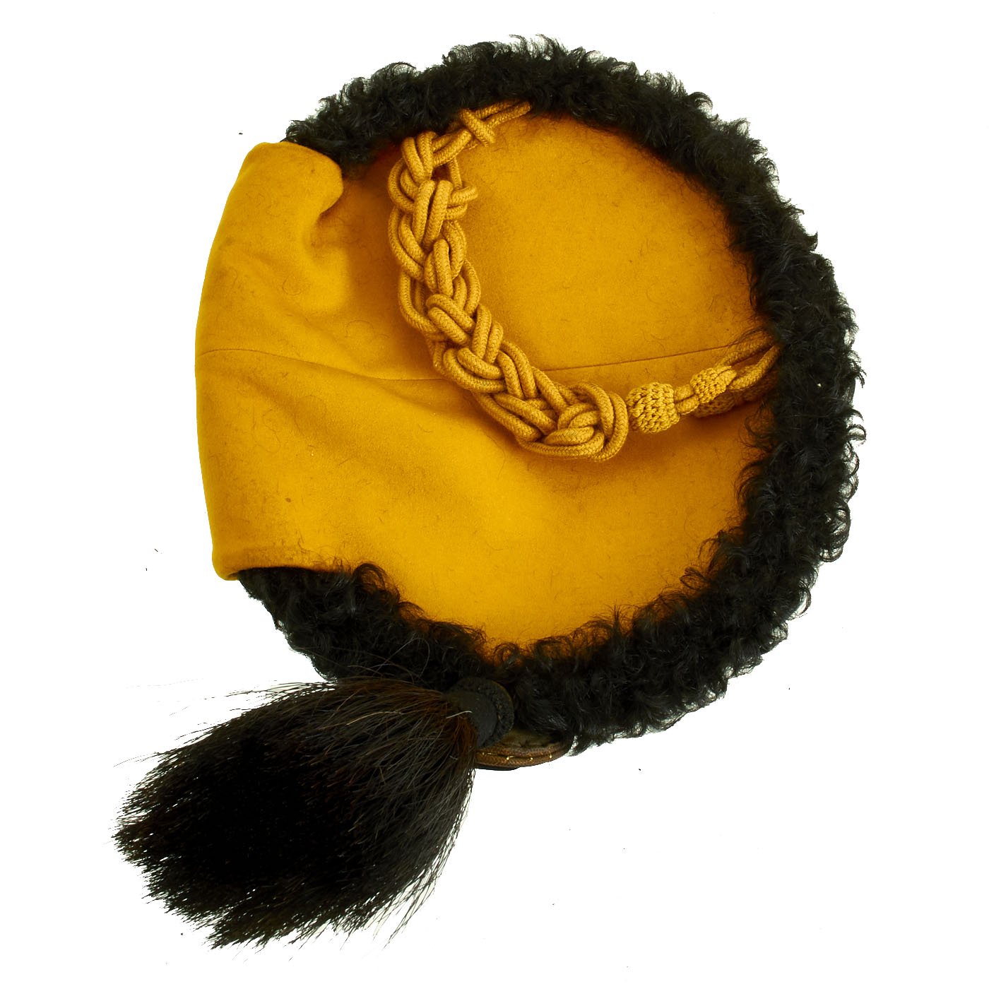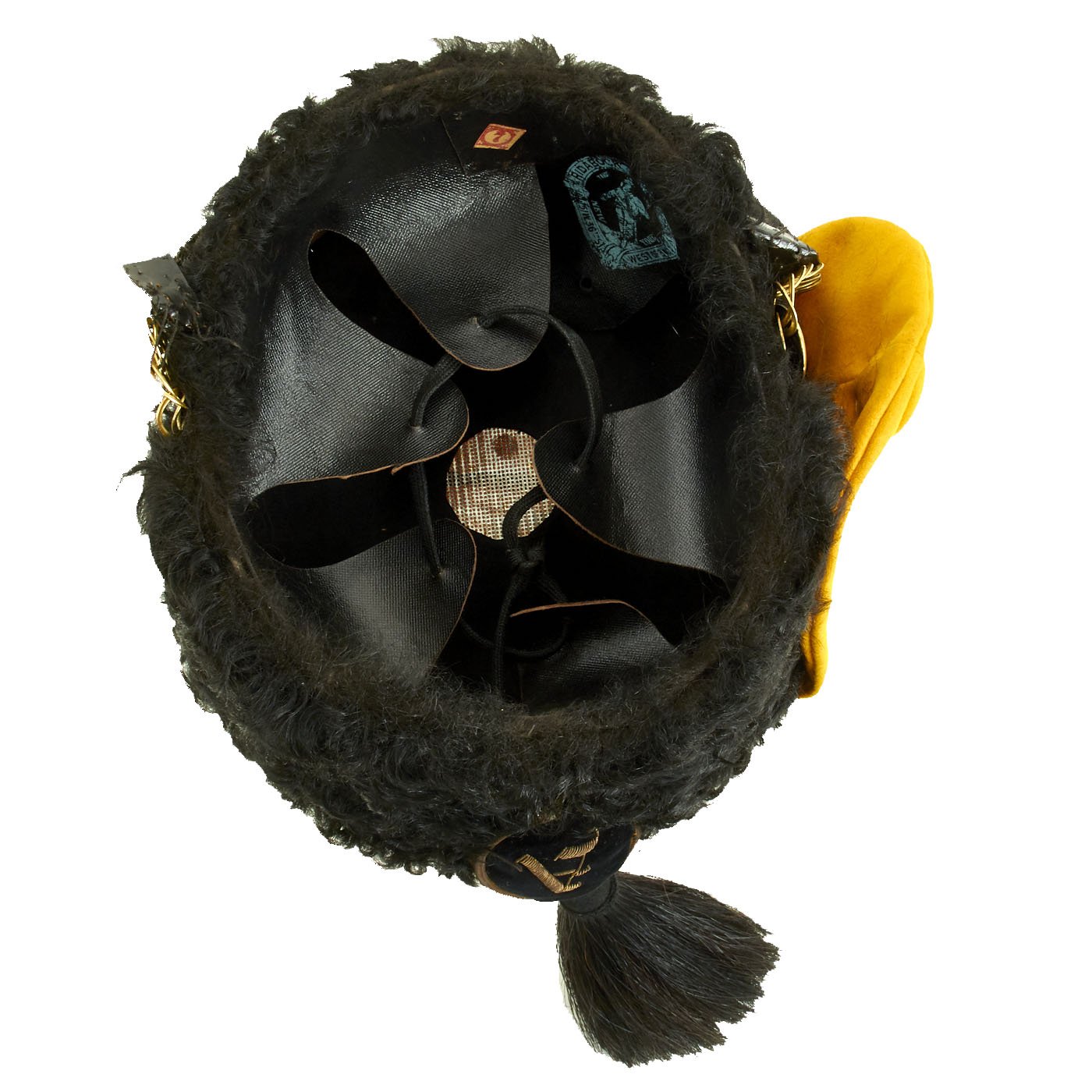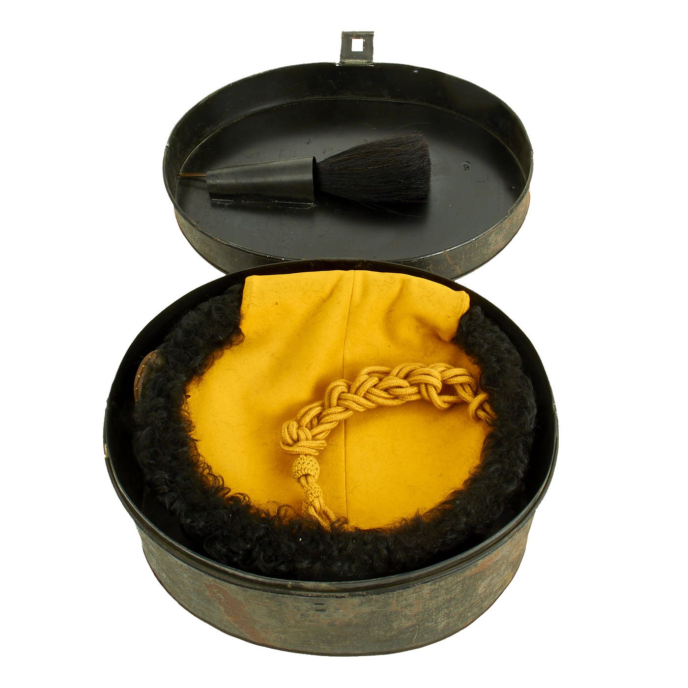 This is a bell crown busby with black astrakhan fur and yellow wool top with point folded over and secured with a button on right side. Gilded metal crossed saber insignia and black velvet-covered oval device with embroidered "A" attached in front; brass scale chin strap with black leather backing secured at either side by a gilded metal button embossed with crossed sabers; leather half-lining with cord lacing. Interior features a full leather liner and maker label from the Ridabock & Company of NY. Also included is a black horsehair plume along with tin transport storage case also marked to Ridabock. Offered in overall excellent condition. A less complete example of this incredibly rare busby can be found in the collection of the New York Historical Society located at this link.