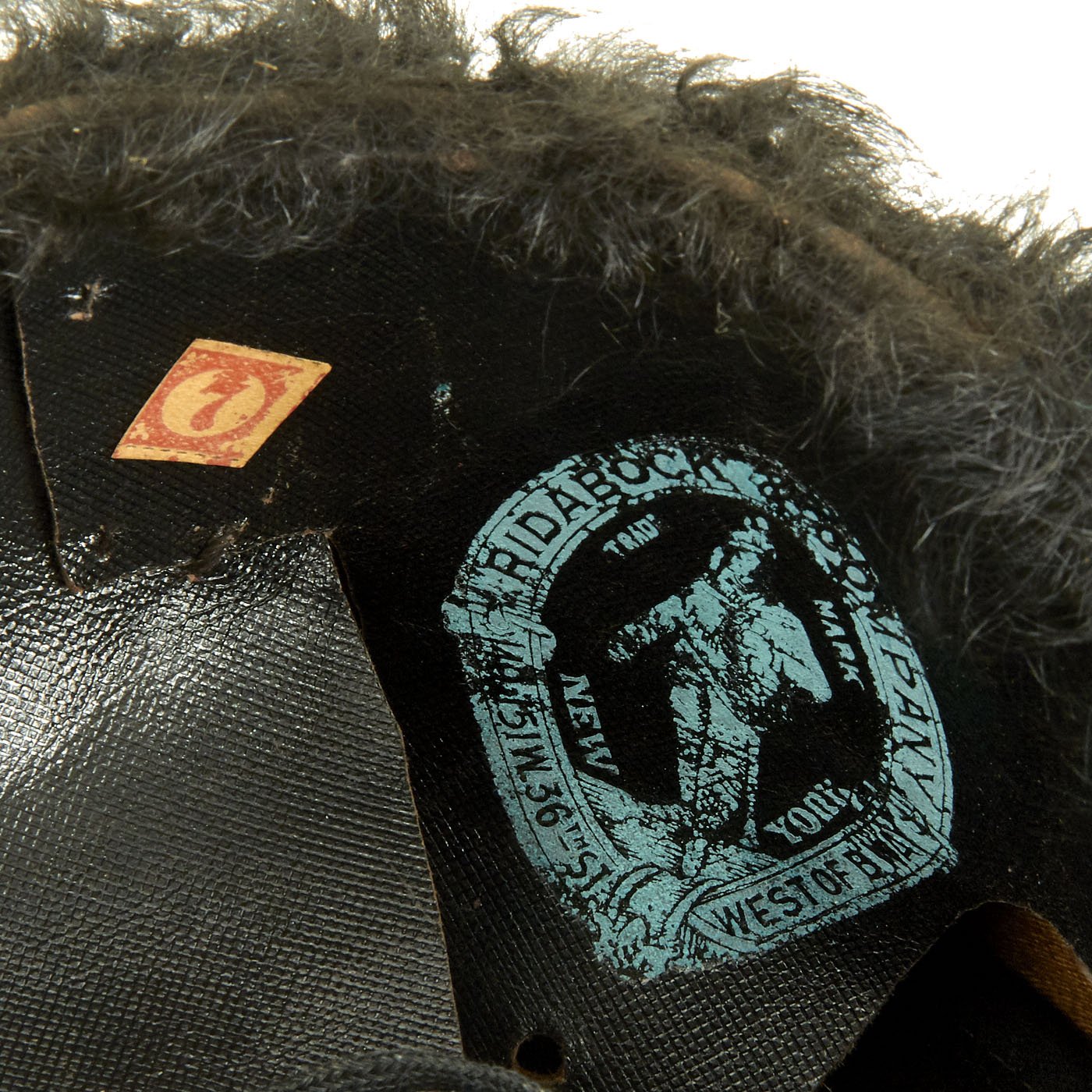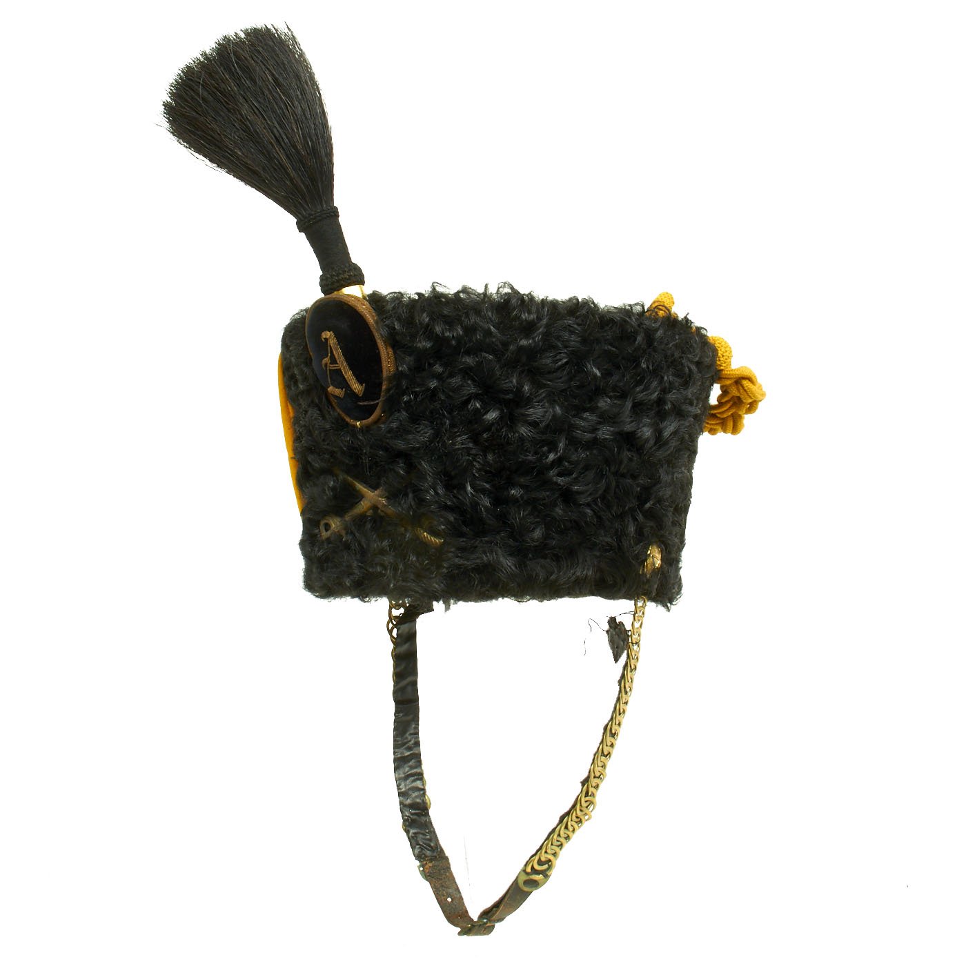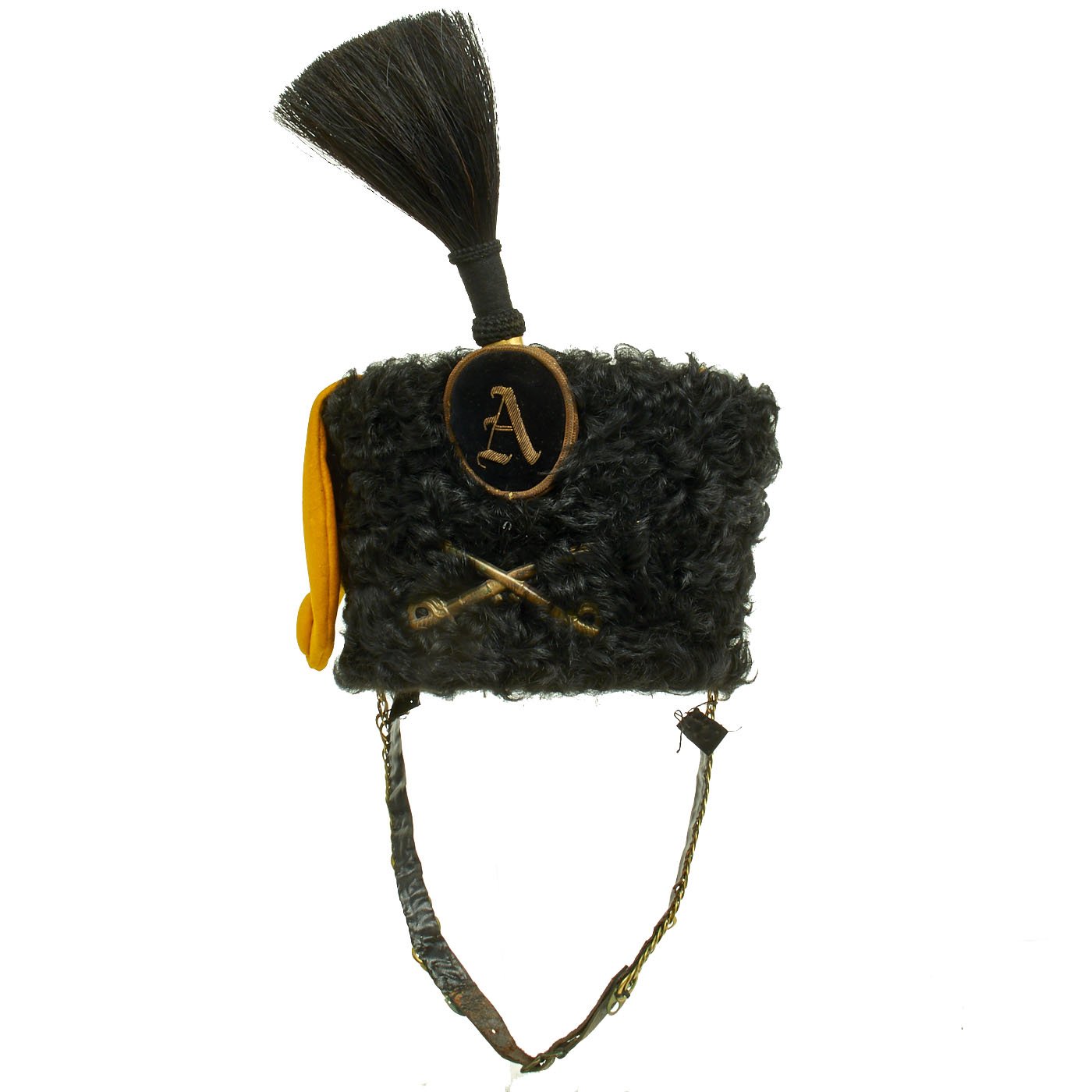 This is a bell crown busby with black astrakhan fur and yellow wool top with point folded over and secured with a button on right side. Gilded metal crossed saber insignia and black velvet-covered oval device with embroidered "A" attached in front; brass scale chin strap with black leather backing secured at either side by a gilded metal button embossed with crossed sabers; leather half-lining with cord lacing. Interior features a full leather liner and maker label from the Ridabock & Company of NY. Also included is a black horsehair plume along with tin transport storage case also marked to Ridabock. Offered in overall excellent condition. A less complete example of this incredibly rare busby can be found in the collection of the New York Historical Society located at this link.