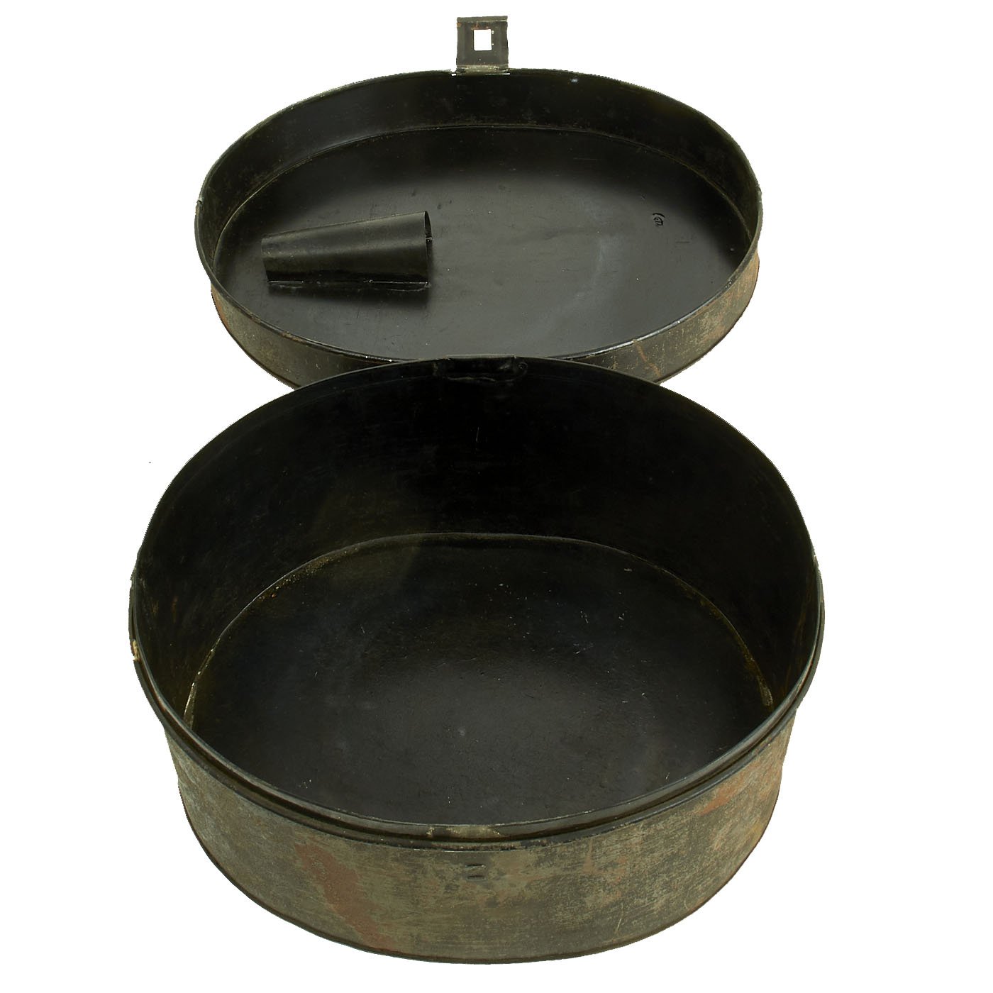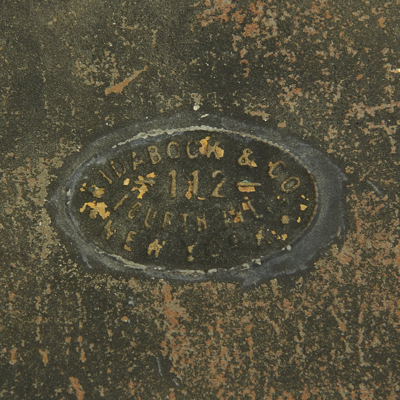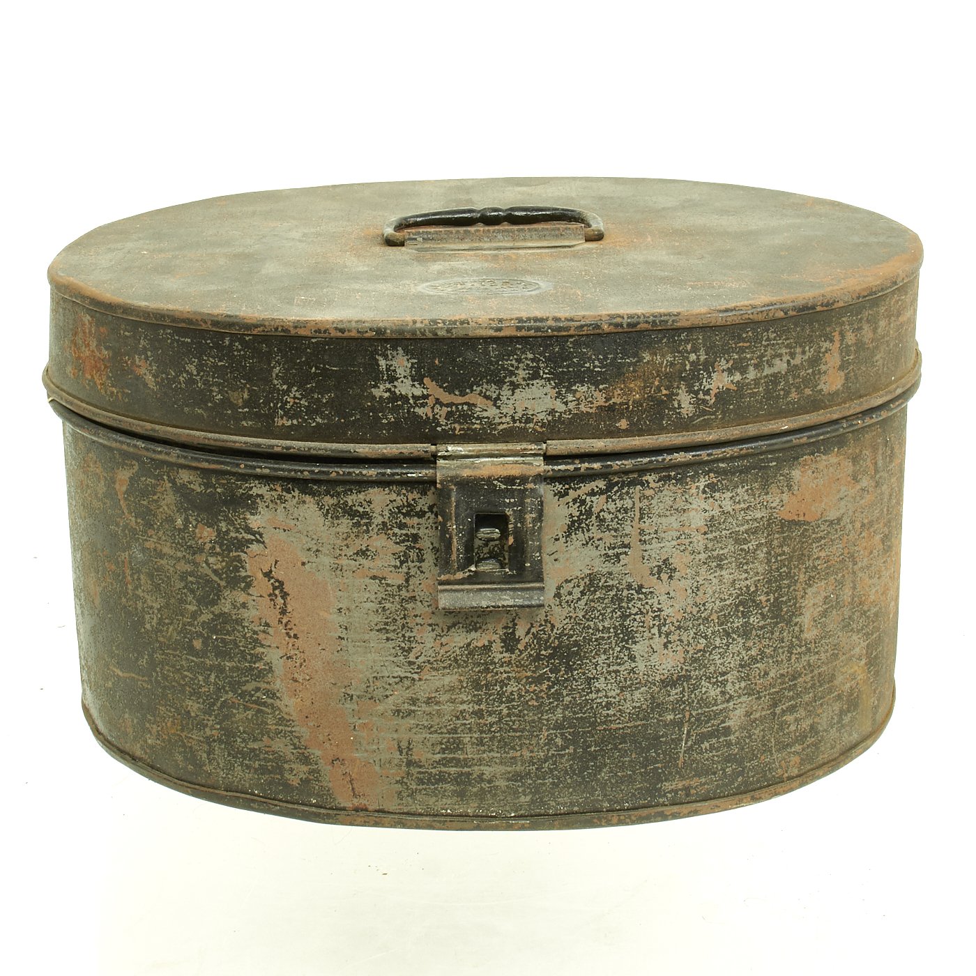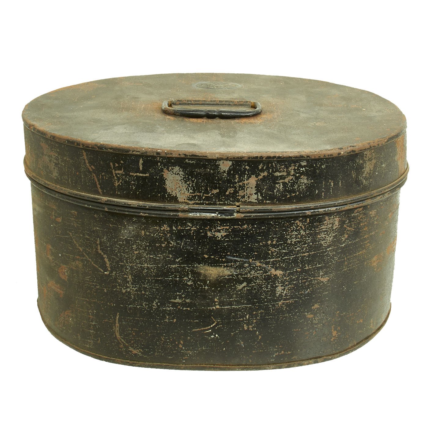 This is a bell crown busby with black astrakhan fur and yellow wool top with point folded over and secured with a button on right side. Gilded metal crossed saber insignia and black velvet-covered oval device with embroidered "A" attached in front; brass scale chin strap with black leather backing secured at either side by a gilded metal button embossed with crossed sabers; leather half-lining with cord lacing. Interior features a full leather liner and maker label from the Ridabock & Company of NY. Also included is a black horsehair plume along with tin transport storage case also marked to Ridabock. Offered in overall excellent condition. A less complete example of this incredibly rare busby can be found in the collection of the New York Historical Society located at this link.