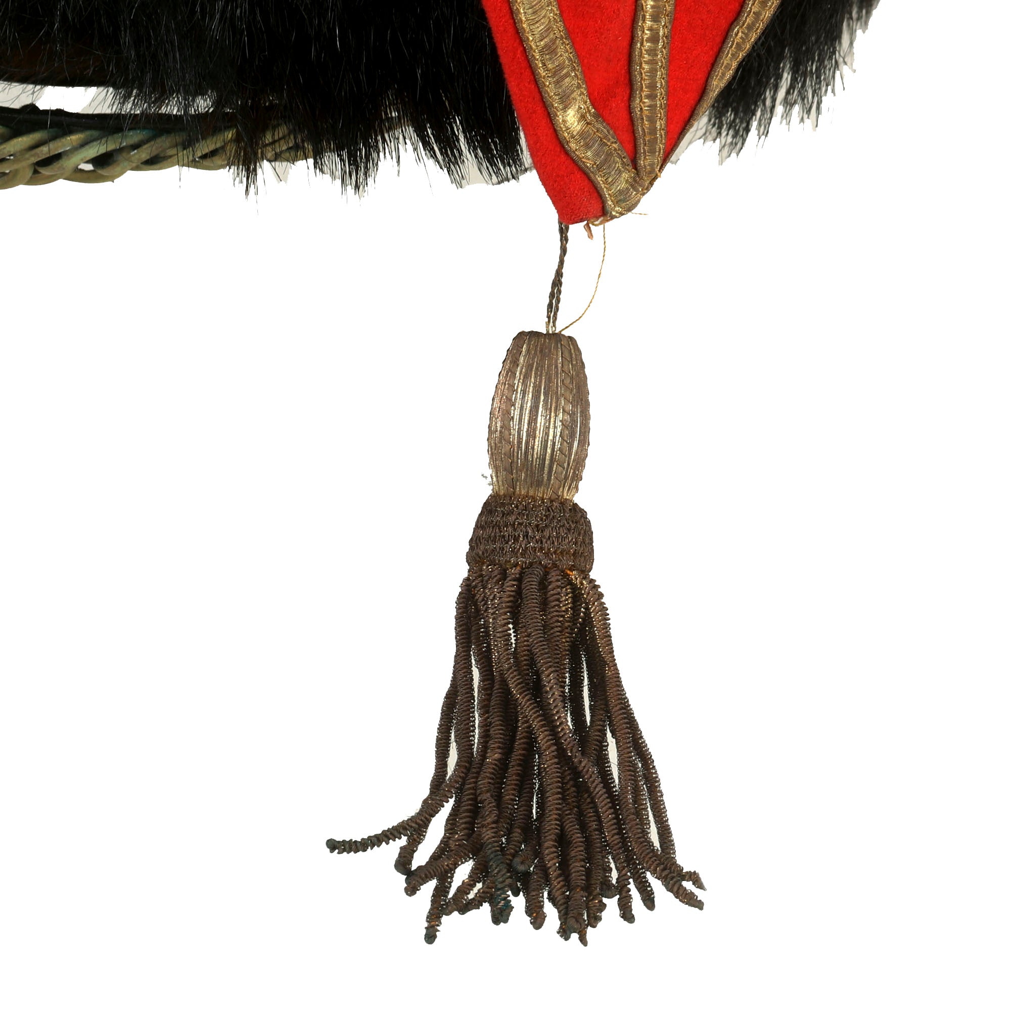The cap is a tremendous example which still retains its interior structure. The plume is still intact at the top, as is the red cloth which hangs off of one side. The two bullion tassels are still in great shape as well. The original lining is intact but the string that tied the tongues together is gone. The front visor is well retained as well. The chinstrap is still intact with the chinscales fully integrated. A great example.