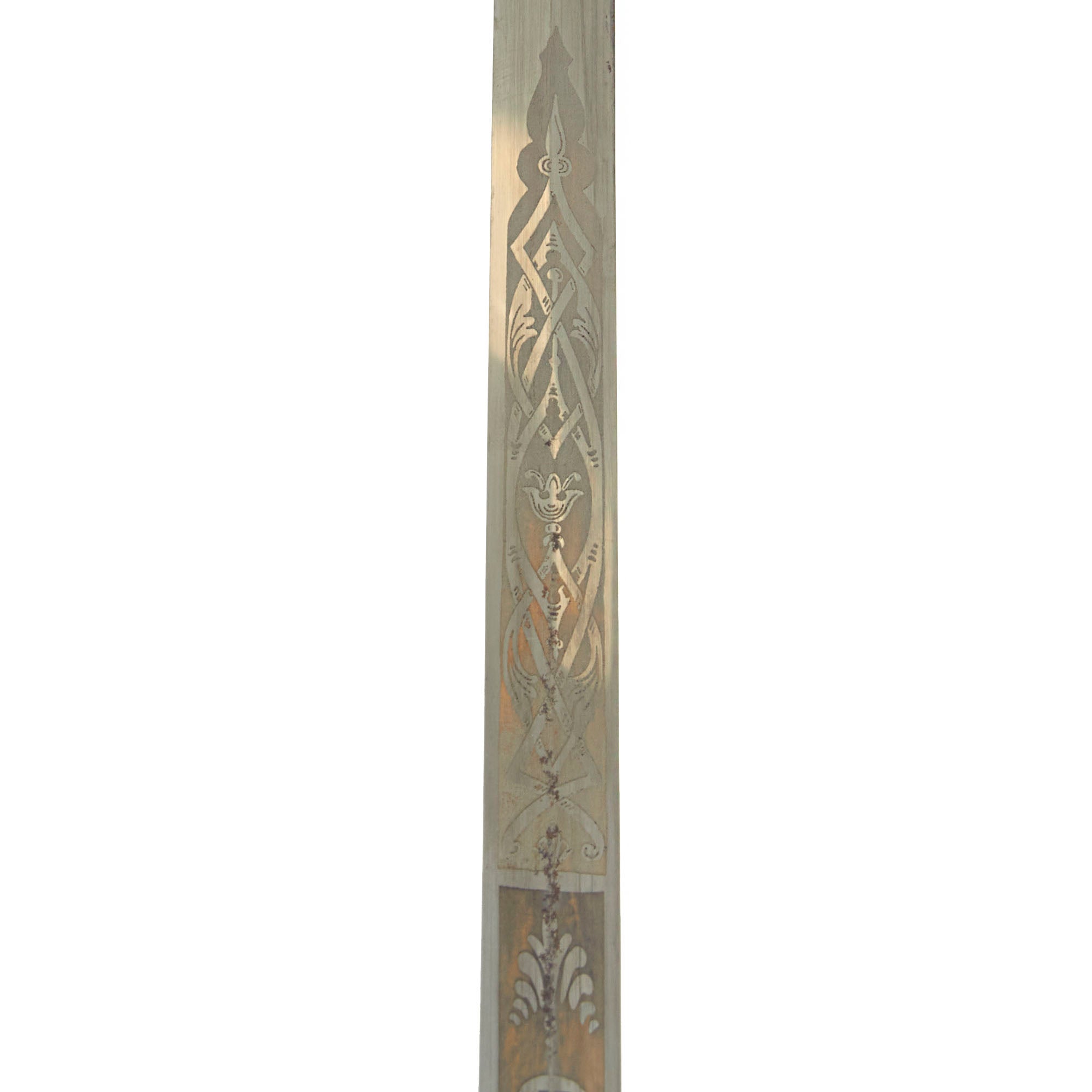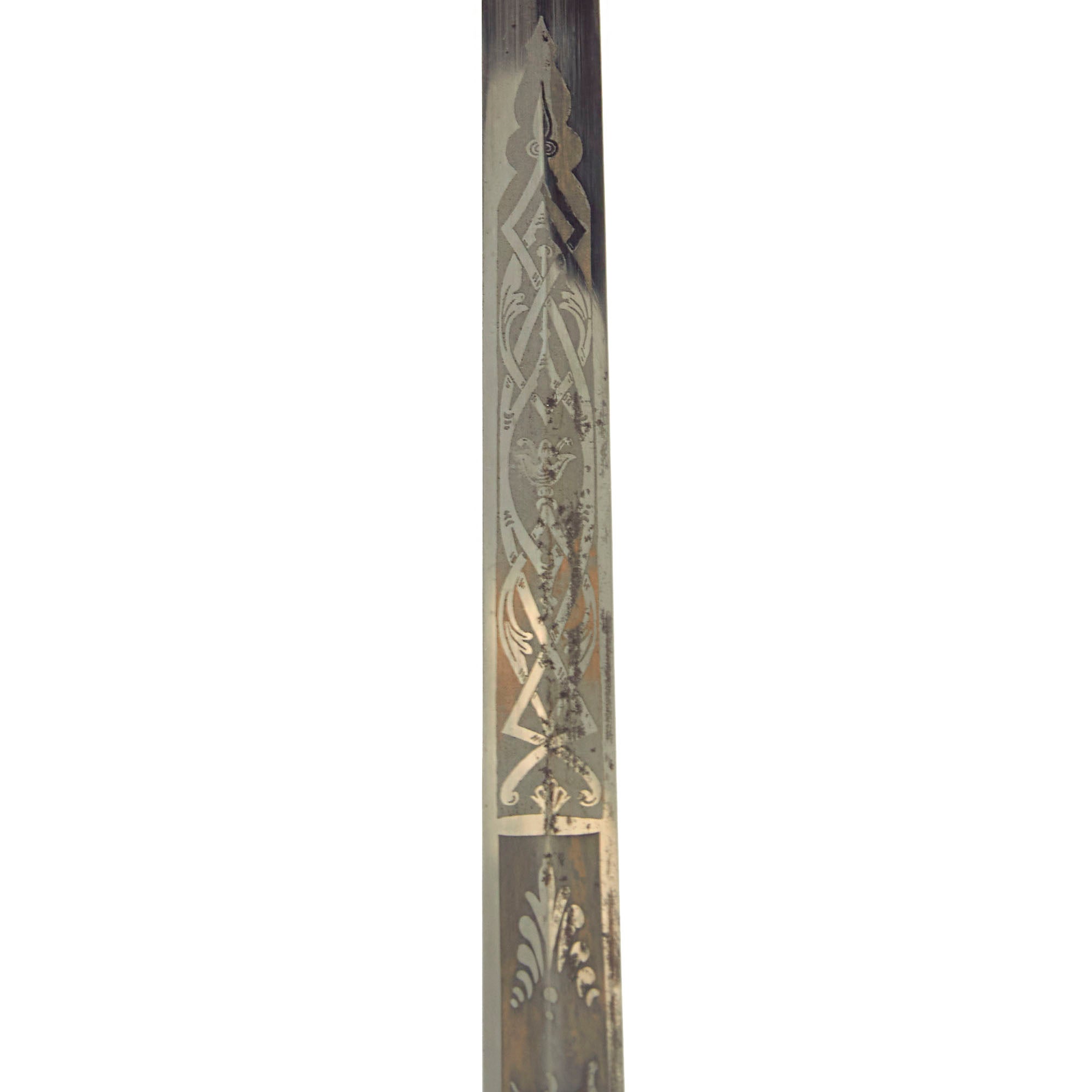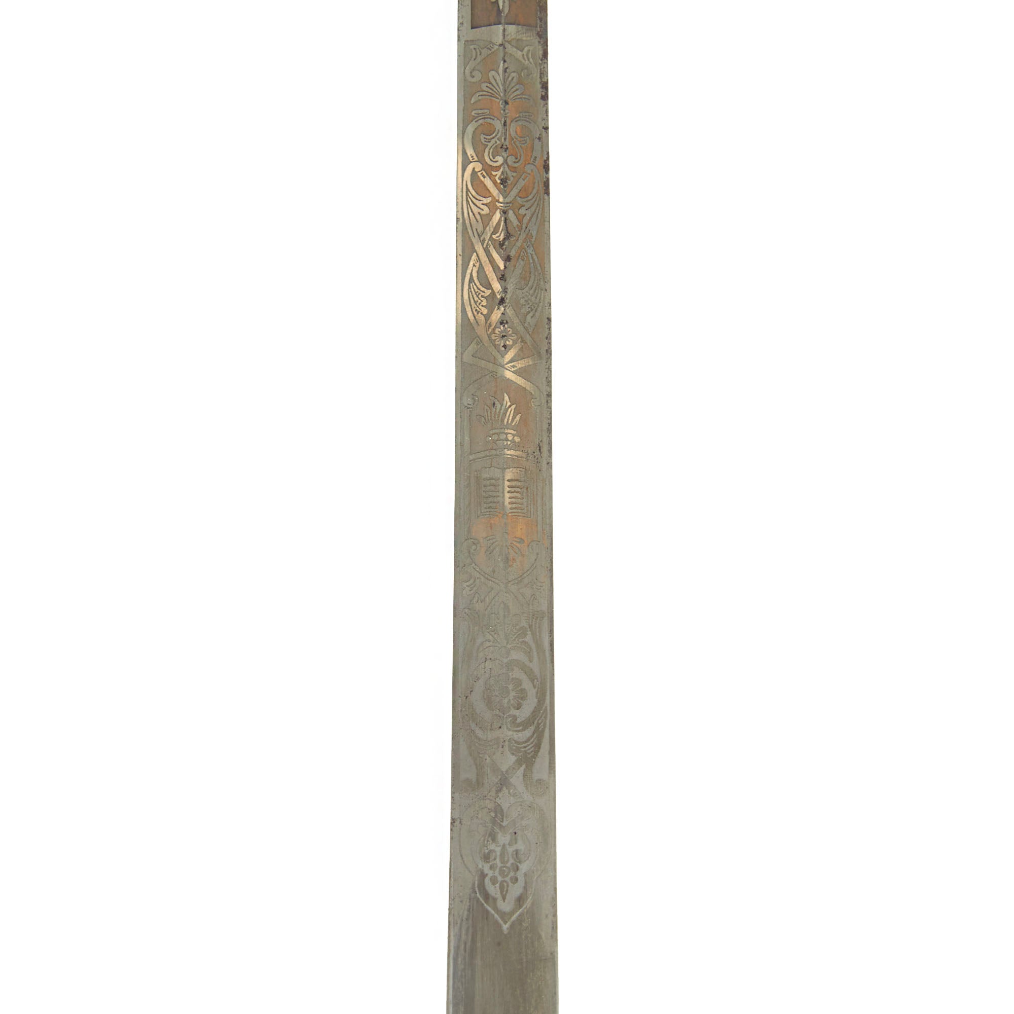 Fraternal swords are most easily identified by the ornate, yet useless nature of their construction. Although this also describes many officer's swords, the nature of their decoration sets them apart. The pommels, hilts and scabbards are often exquisitely detailed with forms relating to their society, and the blades are often etched for most of their length. Common etched motifs include knights, middle-east scenes, Samson, and military displays, though this sword is merely just designs etched. The blades are usually straight, always unsharpened, and are quite flexible just like this one.
