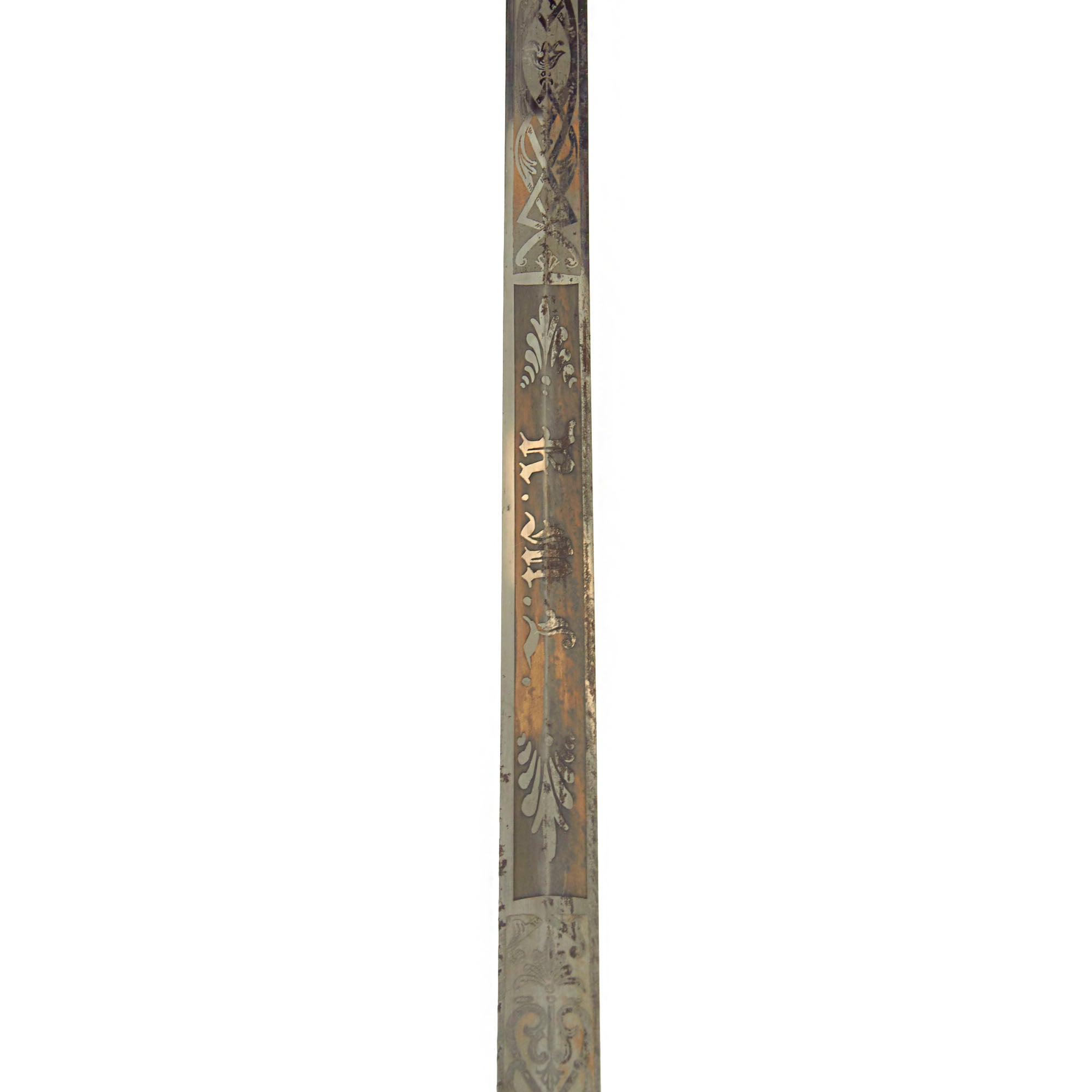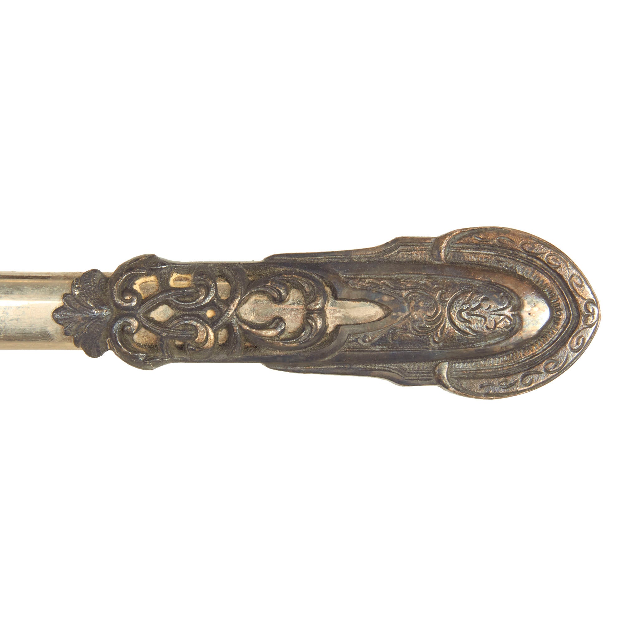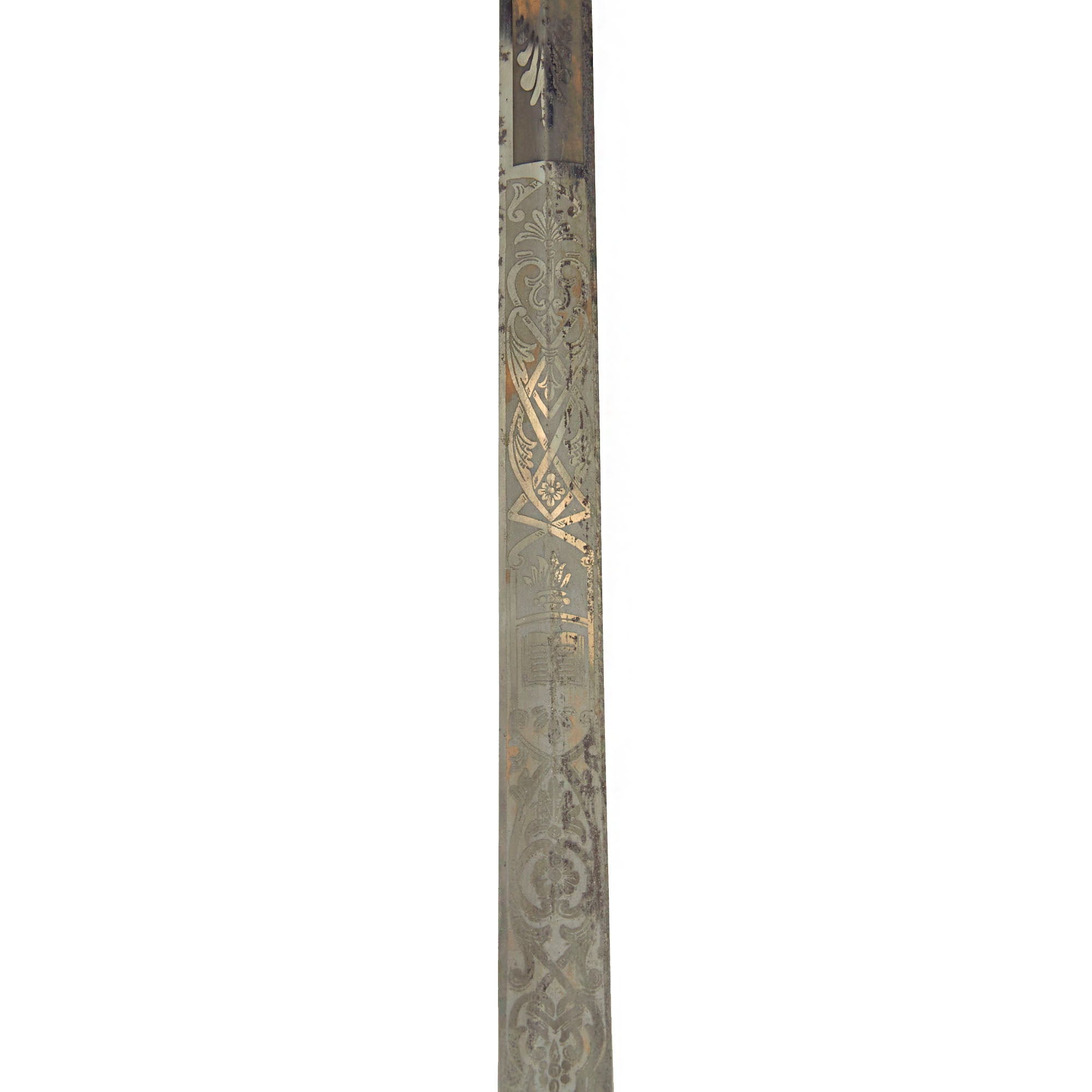 Fraternal swords are most easily identified by the ornate, yet useless nature of their construction. Although this also describes many officer's swords, the nature of their decoration sets them apart. The pommels, hilts and scabbards are often exquisitely detailed with forms relating to their society, and the blades are often etched for most of their length. Common etched motifs include knights, middle-east scenes, Samson, and military displays, though this sword is merely just designs etched. The blades are usually straight, always unsharpened, and are quite flexible just like this one.