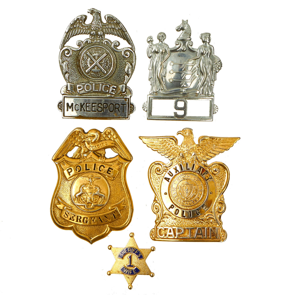 Original Items: Only One Lot of 5 Available. A badge is a device or accessory, often containing the insignia of an organization, which is presented or displayed to indicate some feat of service, a special accomplishment, a symbol of authority granted by taking an oath (e.g., police and fire), a sign of legitimate employment or student status, or as a simple means of identification. They are also used in advertising, publicity, and for branding purposes. Police badges date back to medieval times when knights wore a coat of arms representing their allegiances and loyalty.
