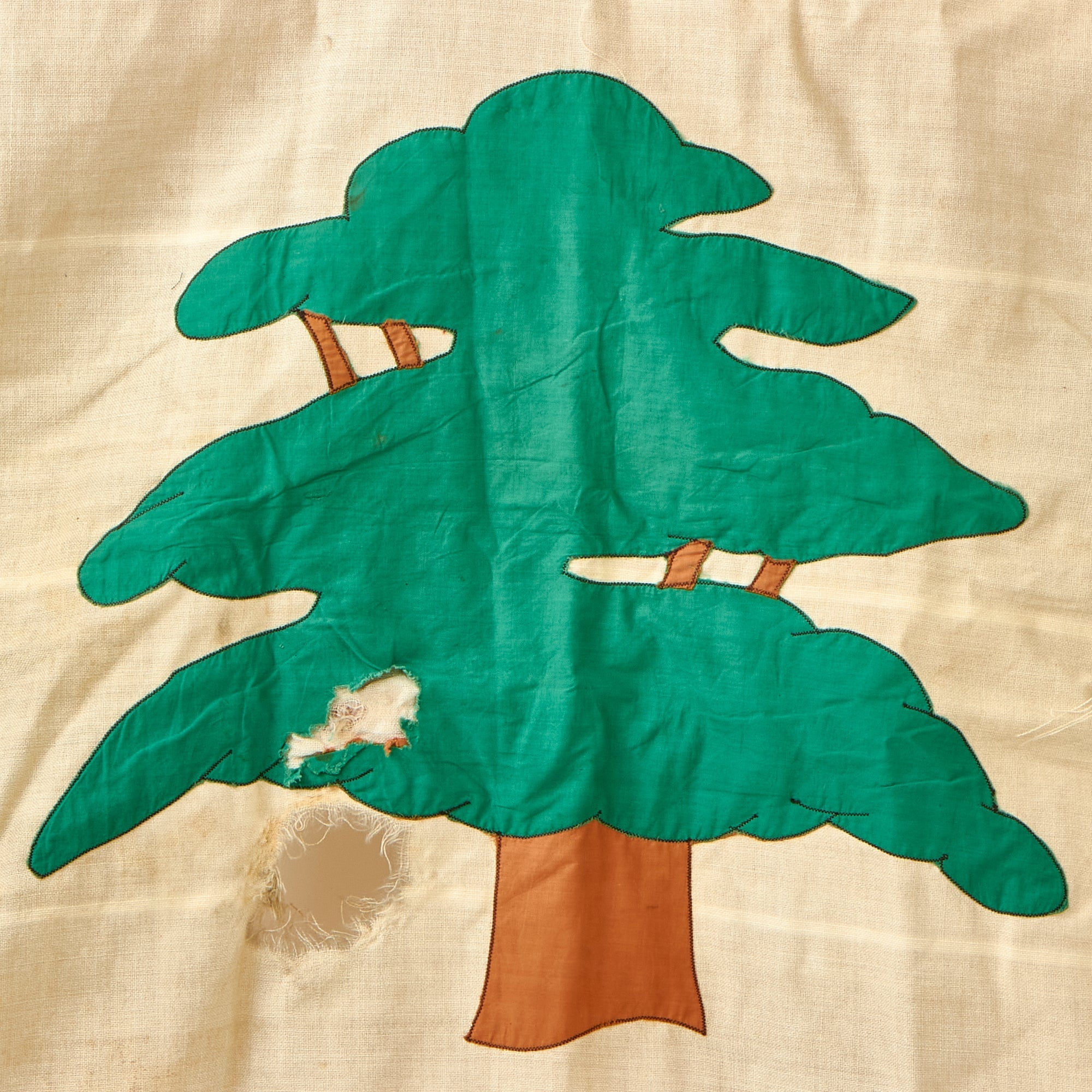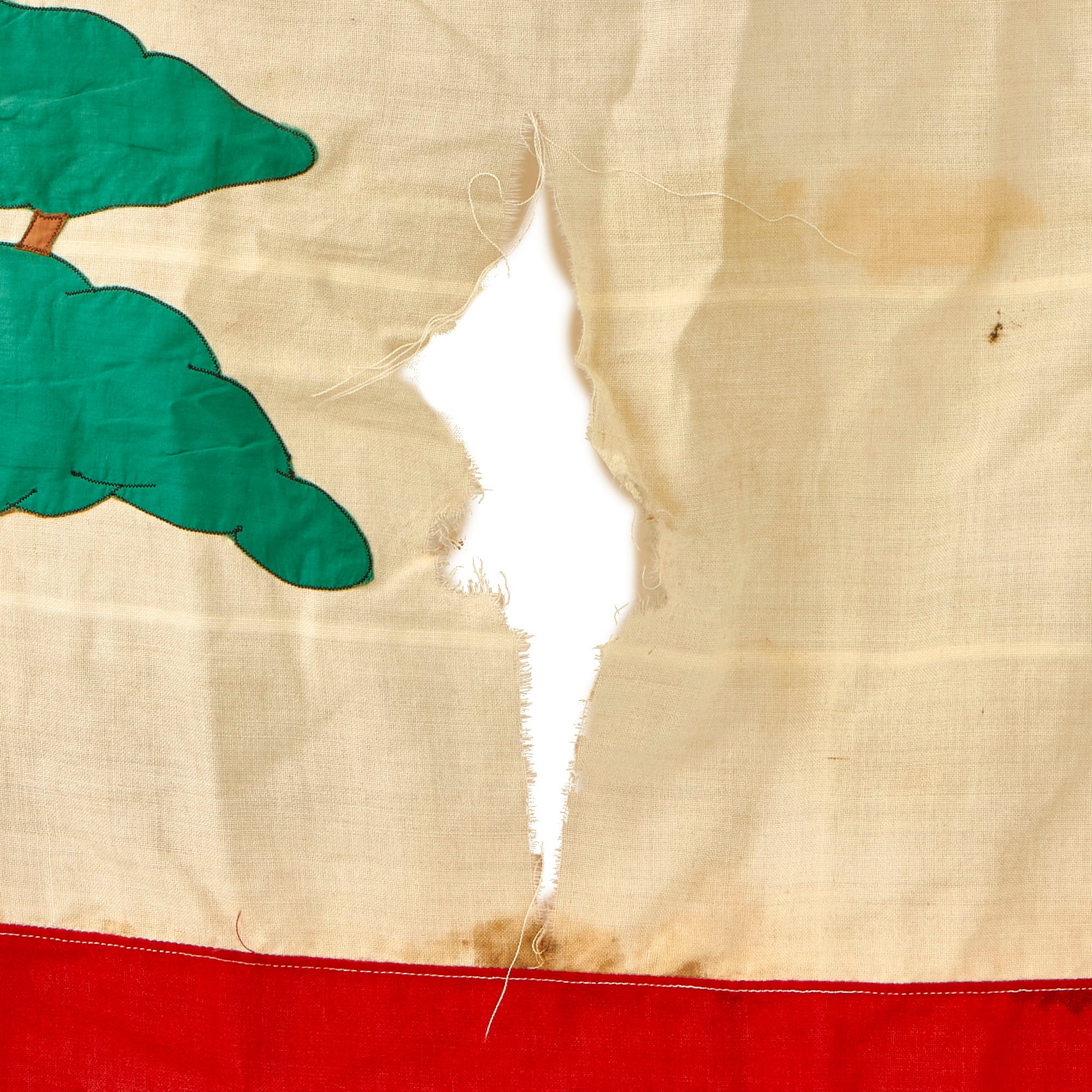 The flag measures 75” x 50” with the condition reflecting that of an object that was damaged in an explosion. The national flag of Lebanon is formed of two horizontal red stripes enveloping a horizontal white stripe. The white stripe is twice the height (width) of the red ones (ratio 1:2:1)—a Spanish fess. The green cedar (Lebanon cedar) in the middle touches each of the red stripes and its width is one third of the width of the flag.