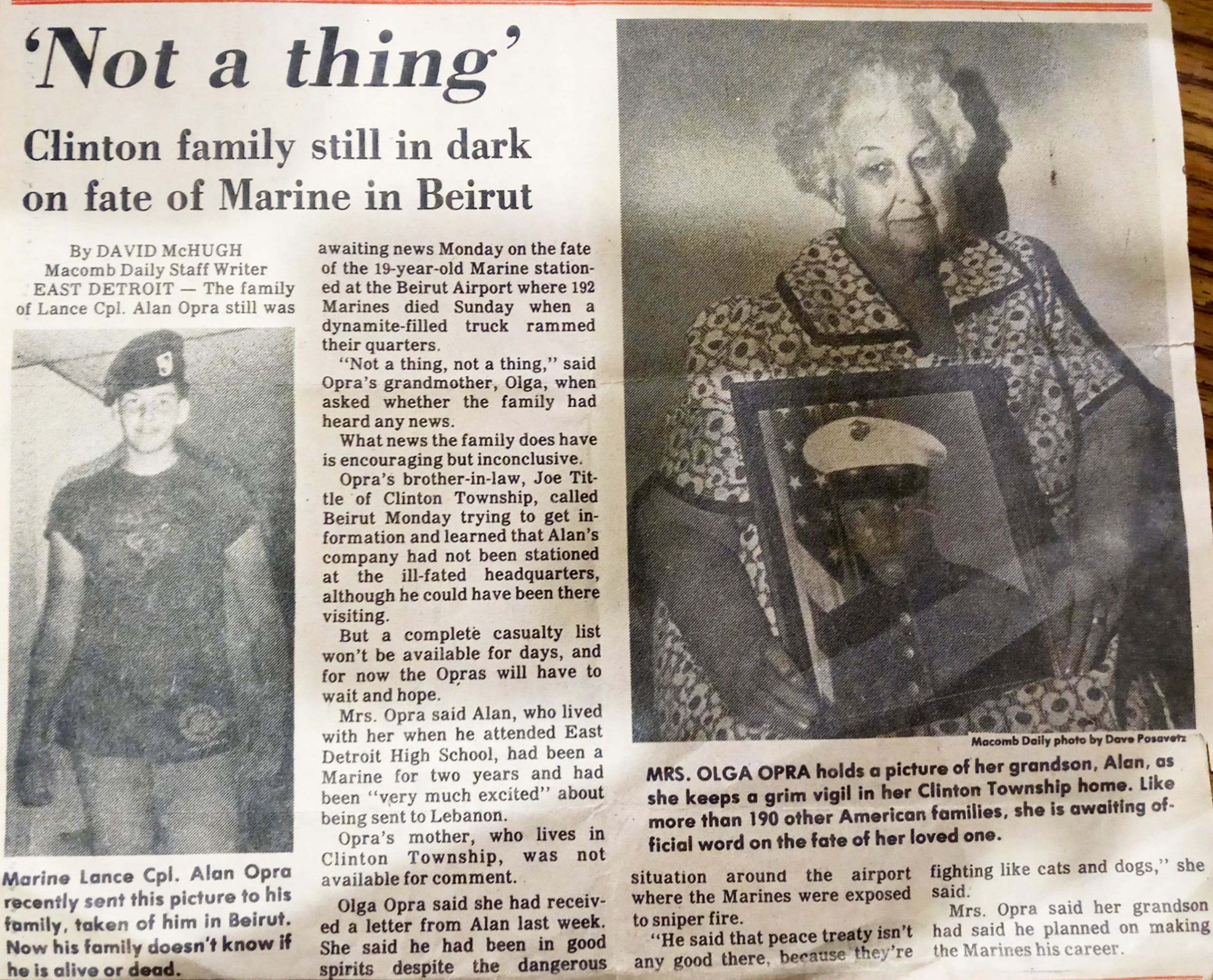 Also included with the flag are color copies of Lcpl Opra in Dress Blue Uniform, reunion (holding a modern Lebanese flag), and a 1983 newspaper article from his hometown paper. A very humbling flag that comes more than ready for further research and display.