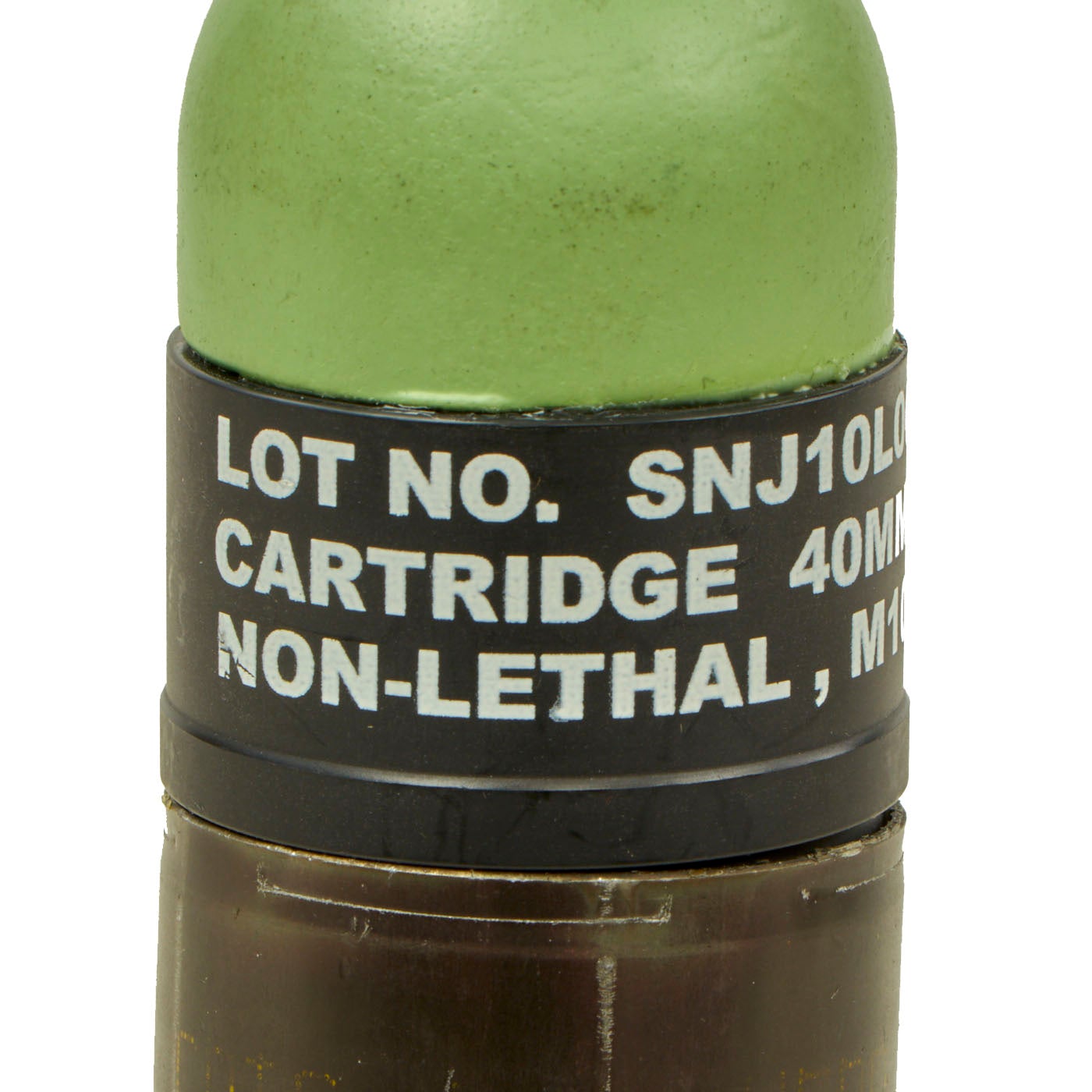 M1006 40mm Non-Lethal (Sponge Grenade) Cartridge: The M1006 is used to incapacitate personnel without penetrating the person's body. It is used for riot control, policing and peacekeeping situations. This round is most effective against individually selected targets (point round). Do not skip fire this round! Round becomes unpredictable upon striking the ground. The cartridge is a fixed round of ammunition consisting of a projectile assembly and a cartridge case assembly. The projectile has a foam rubber nose and a high density plastic body. The projectile assembly is attached to the cartridge case by an adhesive. The cartridge case is a hollow bi-chambered plastic cylinder. Into the base of the cartridge case is pressed an aluminum insert which holds a brass 32 caliber case. The brass case holds the propellant and primer.