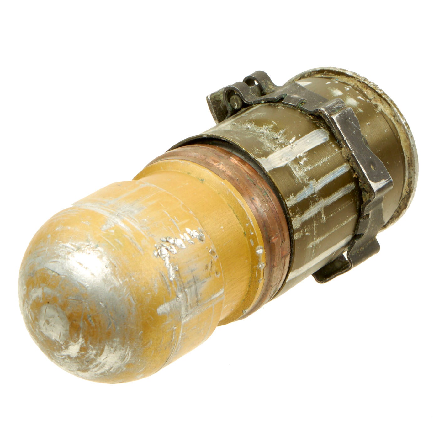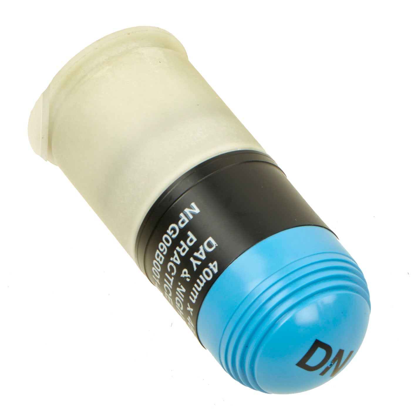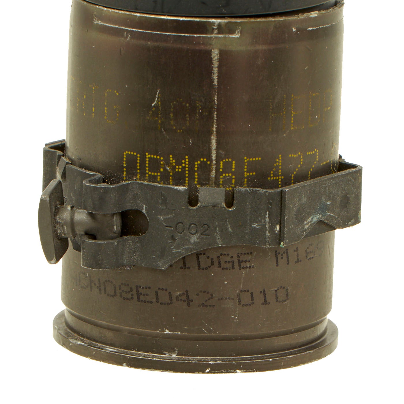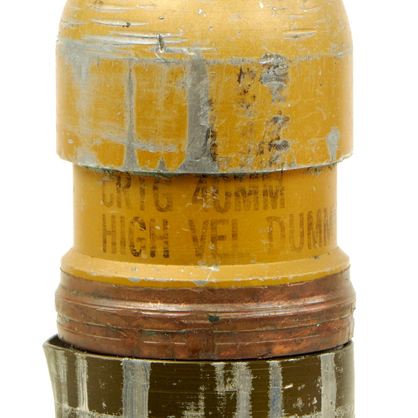 M433 40mm HEDP Dummy Round: The M433 cartridge is a dual purpose impact type round which is designed to penetrate at least two inches of steel armor at 0° angle of obliquity and inflict personnel casualties in the target area. This item is Code A, approved for service use. This is a training standard item used in both training and combat. The cartridge is a fixed round of ammunition consisting of a one-piece, aluminum projectile body with rotating band, and a cartridge case assembly. A hollow aluminum ogive is fitted to the front end of the projectile. A PIBD fuze assembly with an RDX spit-back charge and copper cone liner is fitted to the opening of the projectile cavity. The cavity is sealed by the fuze assembly and contains a high explosive shaped charge. The projectile assembly is press-fitted into the cartridge case assembly. The case is a hollow bi-chambered aluminum cylinder with a steel closing plug crimped into the opening of the annealed brass propellant cup assembly in the cartridge base. The propellant cup has vent holes in the sides, is sealed in the bottom by the closing plug, and contains the propelling charge. A percussion primer is crimped into the center of the closing plug. The propellant cup acts as a high-pressure chamber, and the upper hollow cavity in the case acts as a low-pressure chamber.