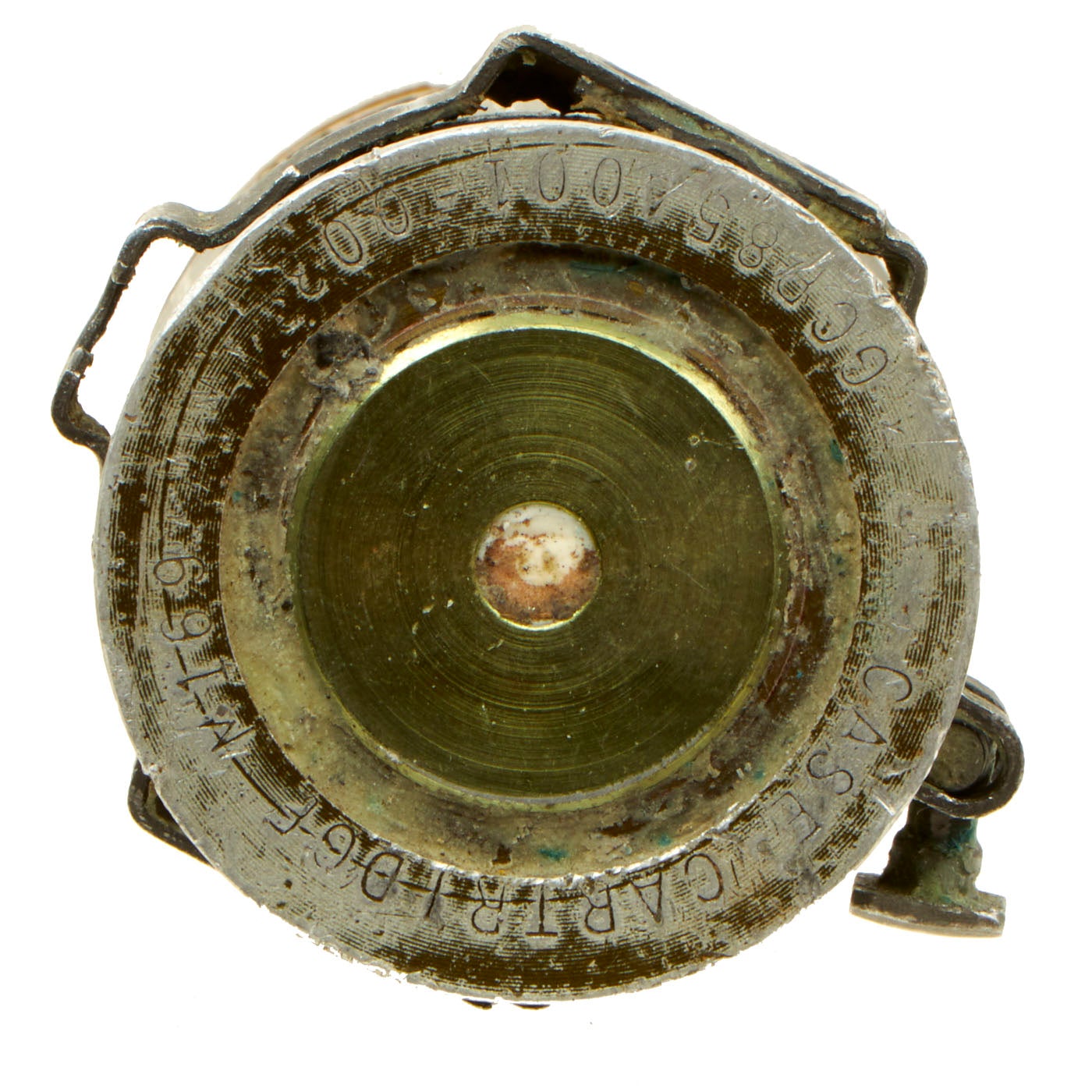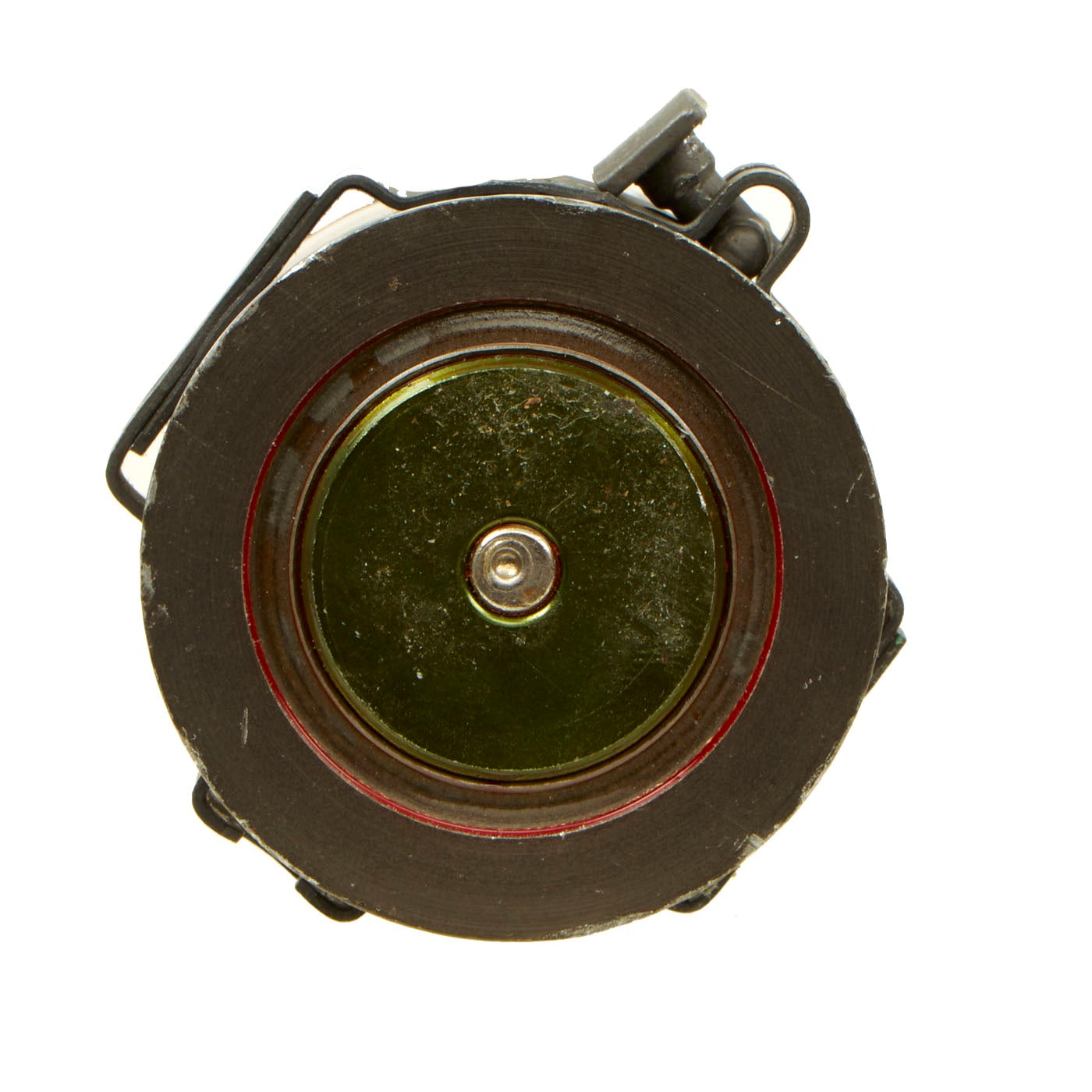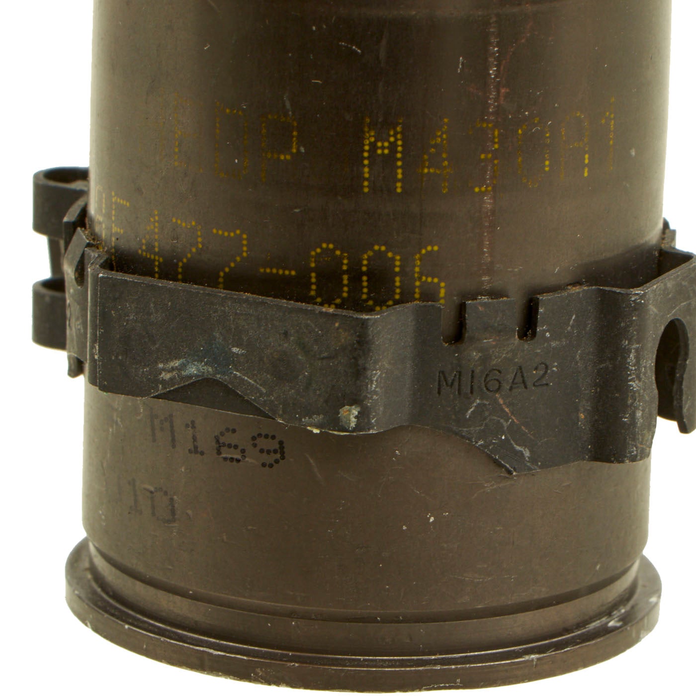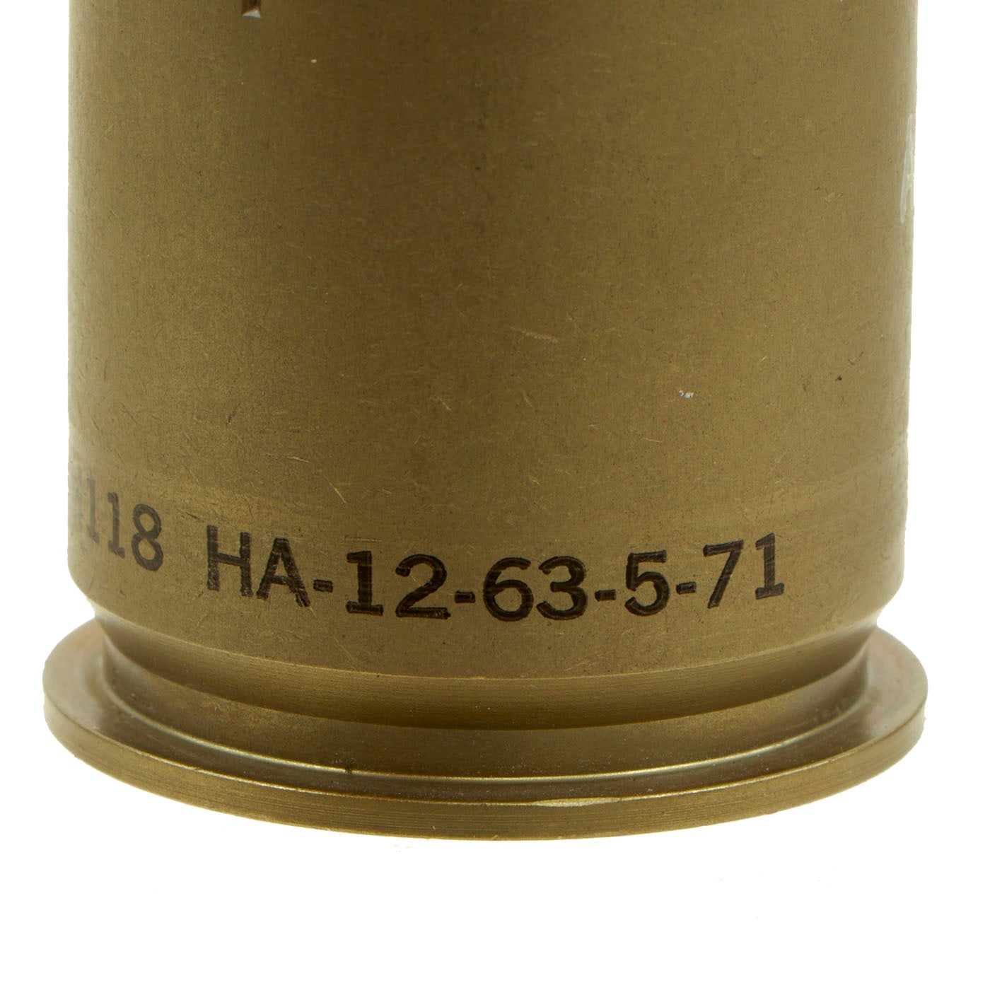 M433 40mm HEDP Dummy Round: The M433 cartridge is a dual purpose impact type round which is designed to penetrate at least two inches of steel armor at 0° angle of obliquity and inflict personnel casualties in the target area. This item is Code A, approved for service use. This is a training standard item used in both training and combat. The cartridge is a fixed round of ammunition consisting of a one-piece, aluminum projectile body with rotating band, and a cartridge case assembly. A hollow aluminum ogive is fitted to the front end of the projectile. A PIBD fuze assembly with an RDX spit-back charge and copper cone liner is fitted to the opening of the projectile cavity. The cavity is sealed by the fuze assembly and contains a high explosive shaped charge. The projectile assembly is press-fitted into the cartridge case assembly. The case is a hollow bi-chambered aluminum cylinder with a steel closing plug crimped into the opening of the annealed brass propellant cup assembly in the cartridge base. The propellant cup has vent holes in the sides, is sealed in the bottom by the closing plug, and contains the propelling charge. A percussion primer is crimped into the center of the closing plug. The propellant cup acts as a high-pressure chamber, and the upper hollow cavity in the case acts as a low-pressure chamber.