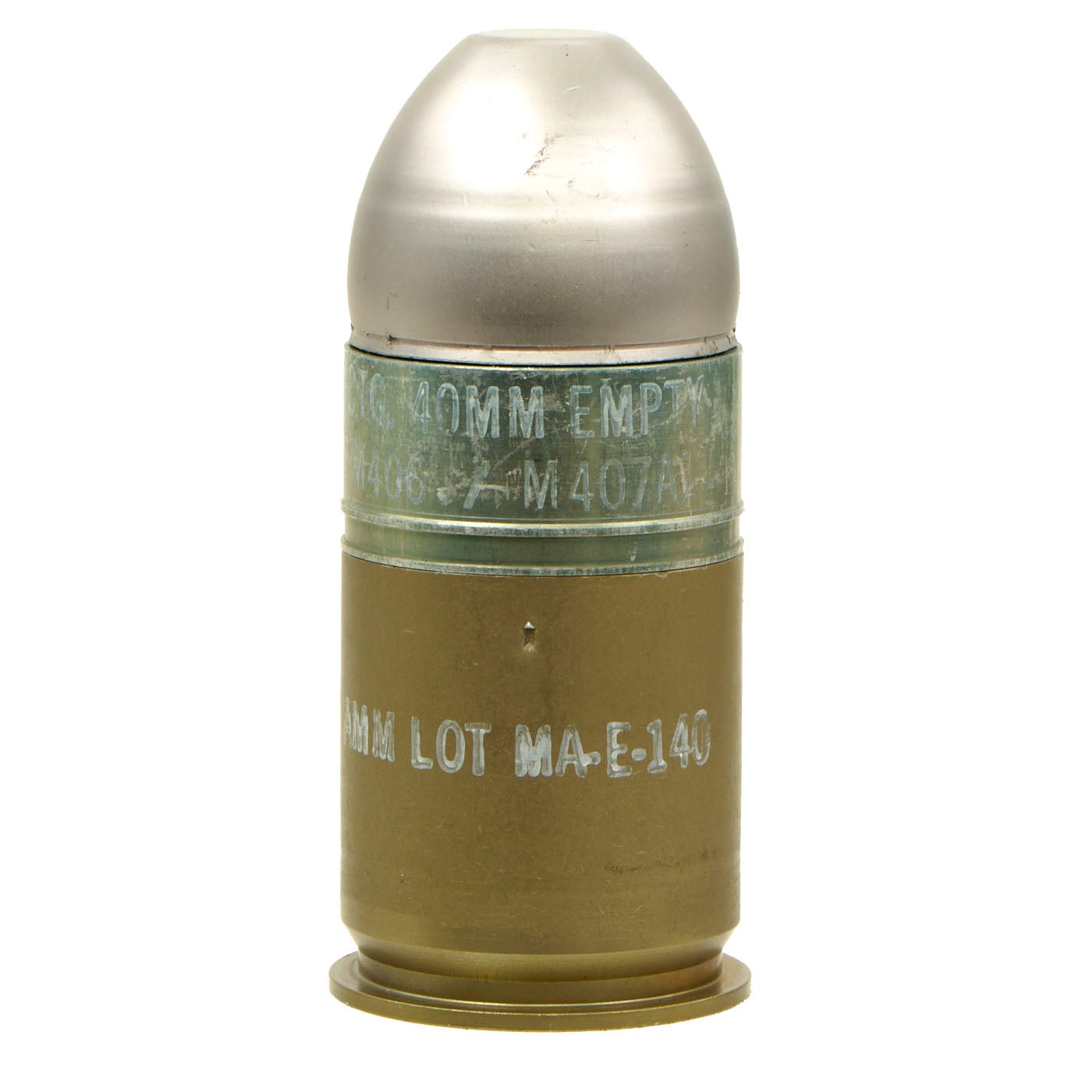 M407A1 40mm Practice Round: The M406 cartridge is a high explosive round designed to inflict personnel casualties using ground burst effect. This cartridge is a fixed round of ammunition consisting of an aluminum projectile body with a rotating band and a cartridge case assembly containing the propelling charge and percussion primer.