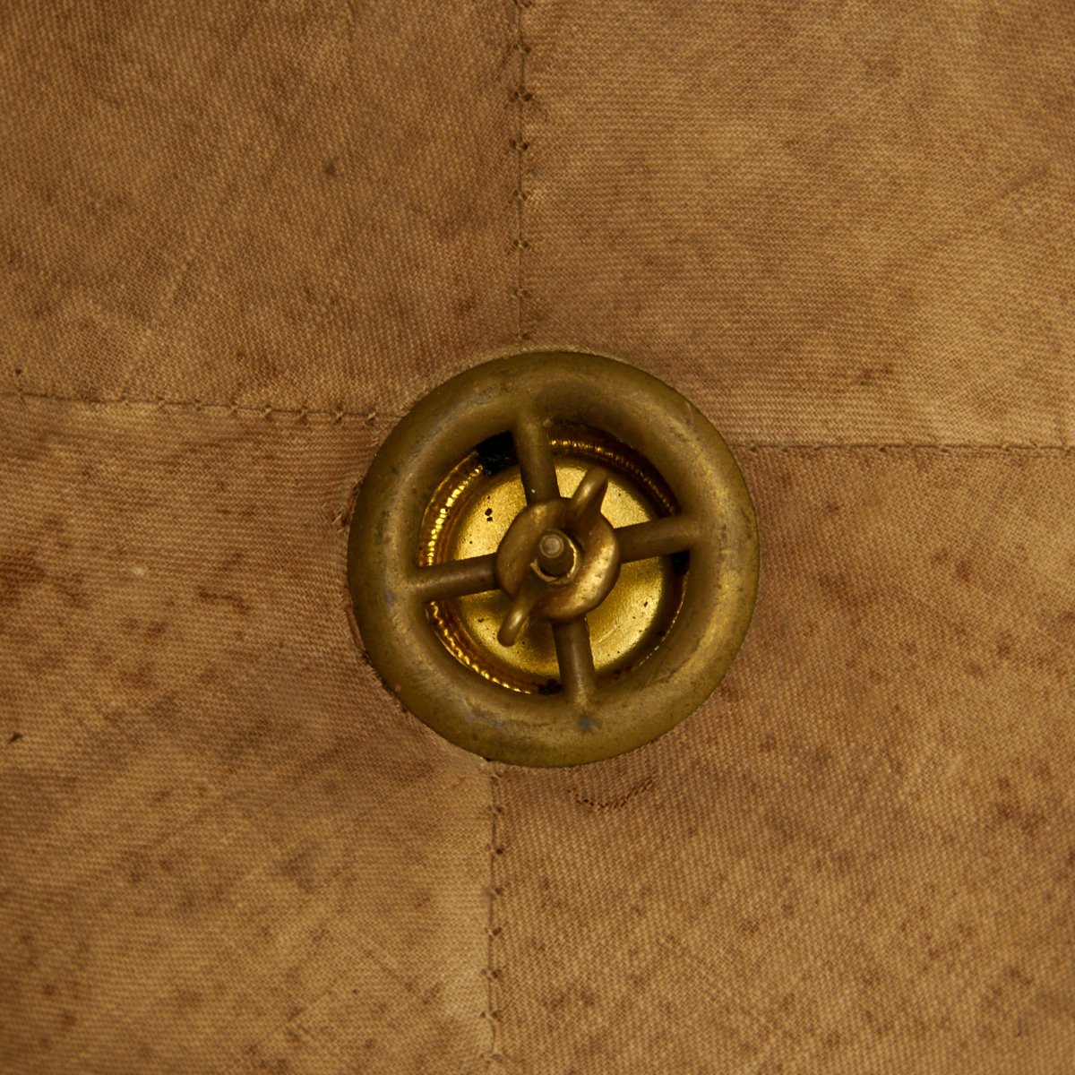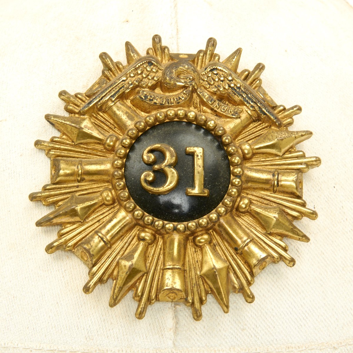 It has an elaborate helmet front plate (badge) depicting a stand of arms, lances and Cannons with the U.S. Eagle over a circle displaying the Regiments numeral of 31. It also still has the original paper size label marked 7 on the leather liner band, and the adjusting string is intact, making this an excellent example of this helmet.