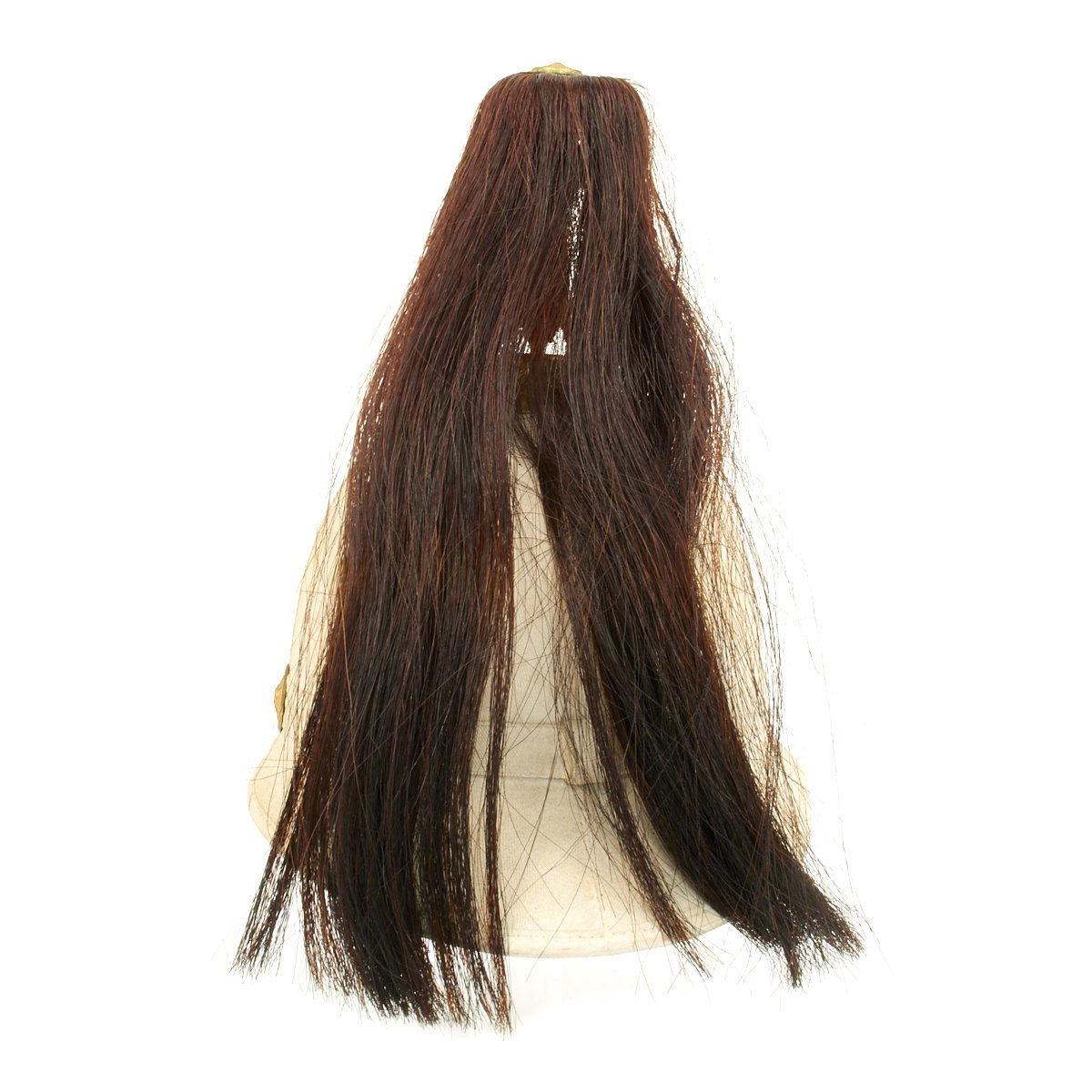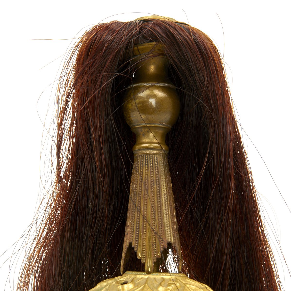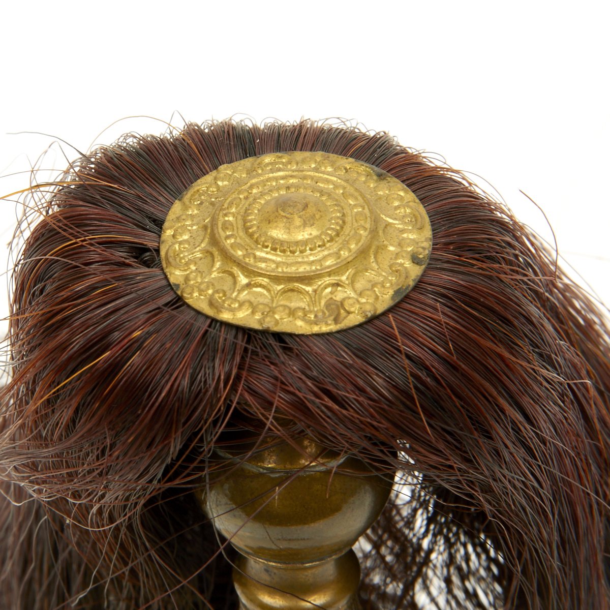 The top mount is also quite detailed with oak leaves surrounding a central circle where the horse tail plume spike is attached. The side buttons on each side over the ear show crossed rifles, indicating that this was an infantry regiment.