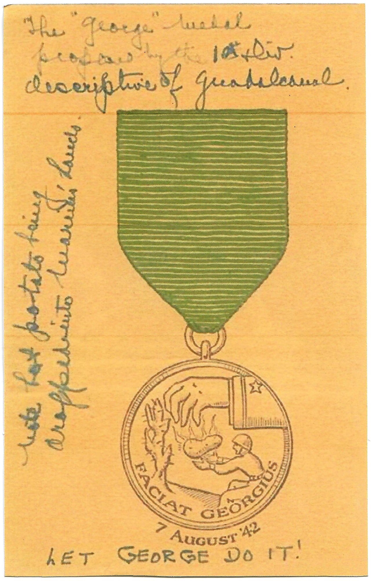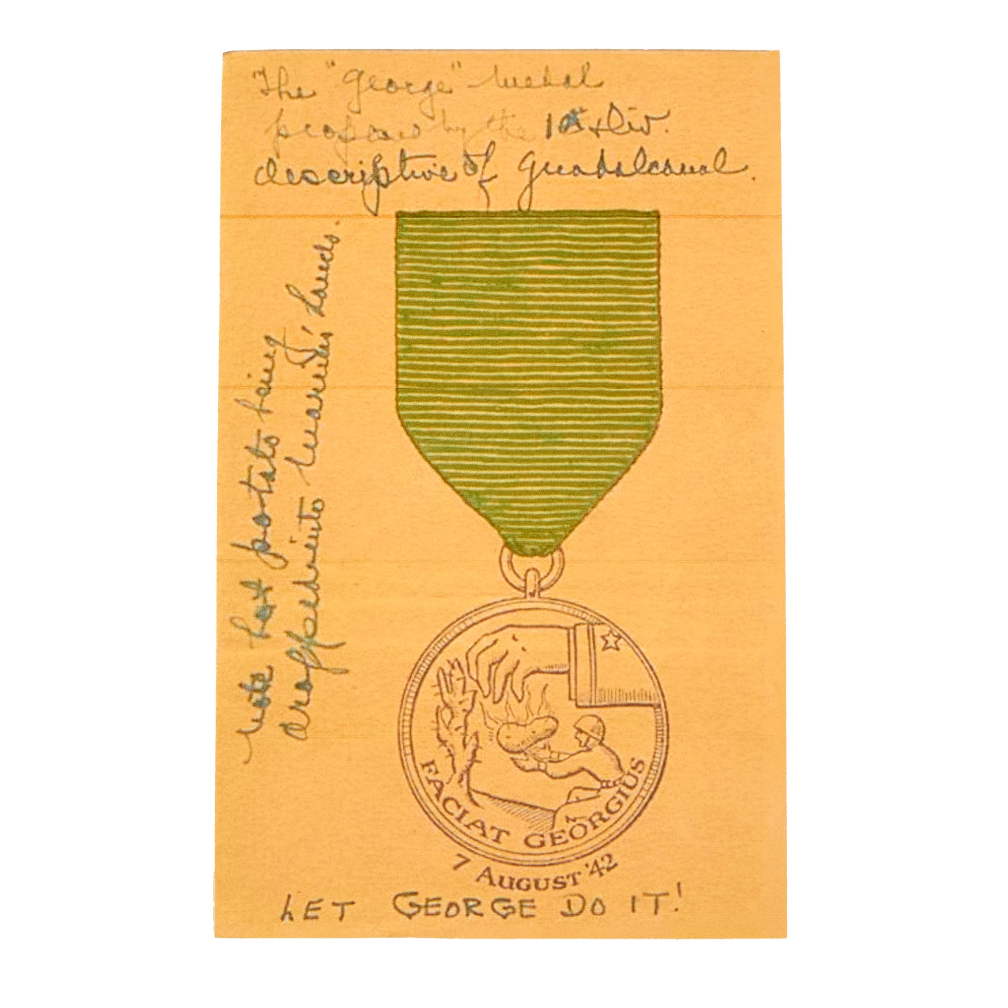 During a lull in the fighting, Col. (later MGEN) Merrill B. Twining suggested that a commemorative medal be struck. He suggested that the suspending ribbon be made of worn green twill fabric from a Marine utility uniform and bear the inscription Let George Do It, the division’s state side motto from training days when they seemed to draw more than their fair share of onerous assignments. The motto was translated into Latin by Scottish Capt. Martin Clemens. The artist who designed the medal was Capt. (later COL.) Donald L. Dickson, who drew the designs on captured Japanese post cards using a half dollar to draw the circles. The cost to receive a medal was one Australian Pound. About 45 Officers and Senior Enlisted signed up.