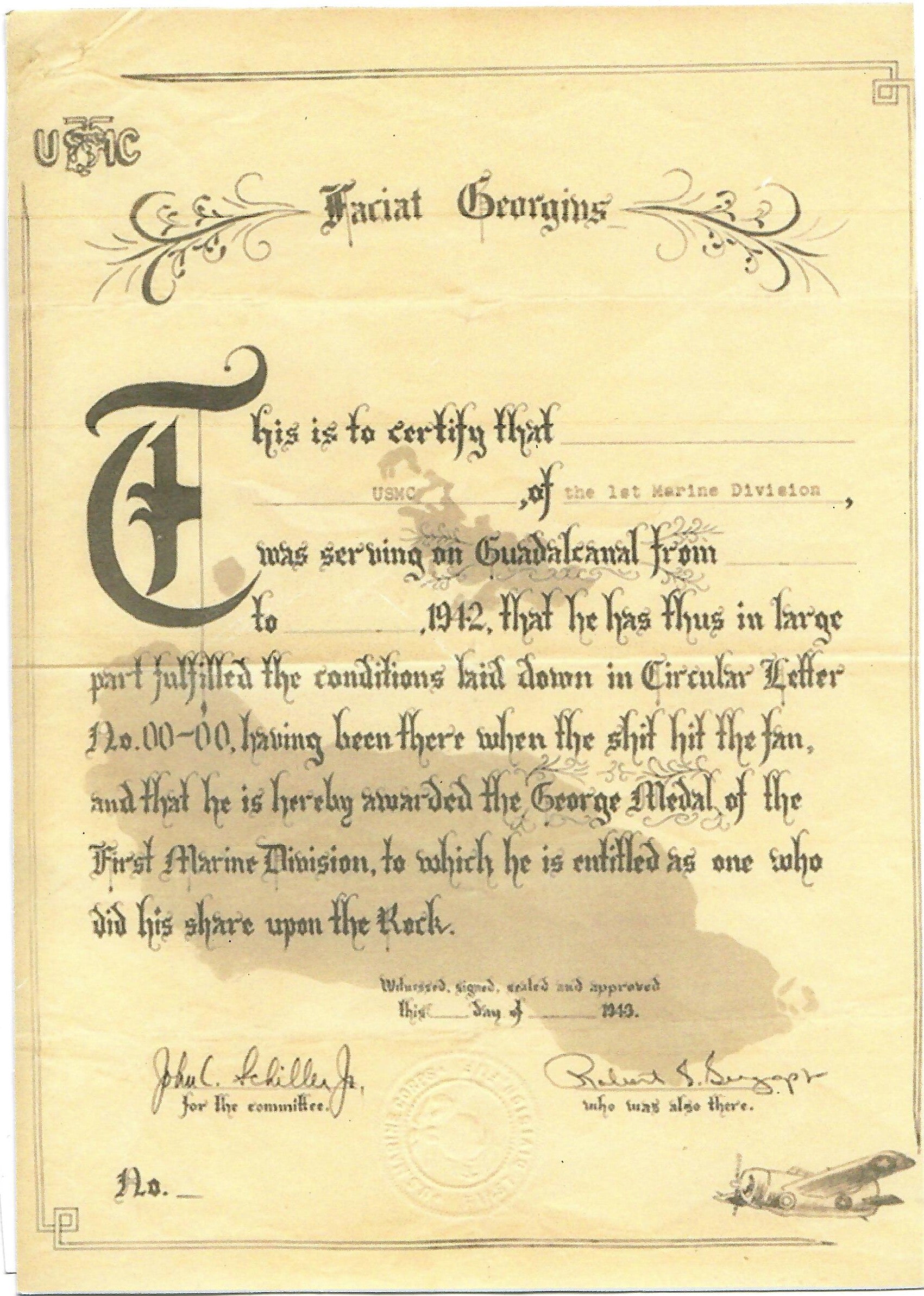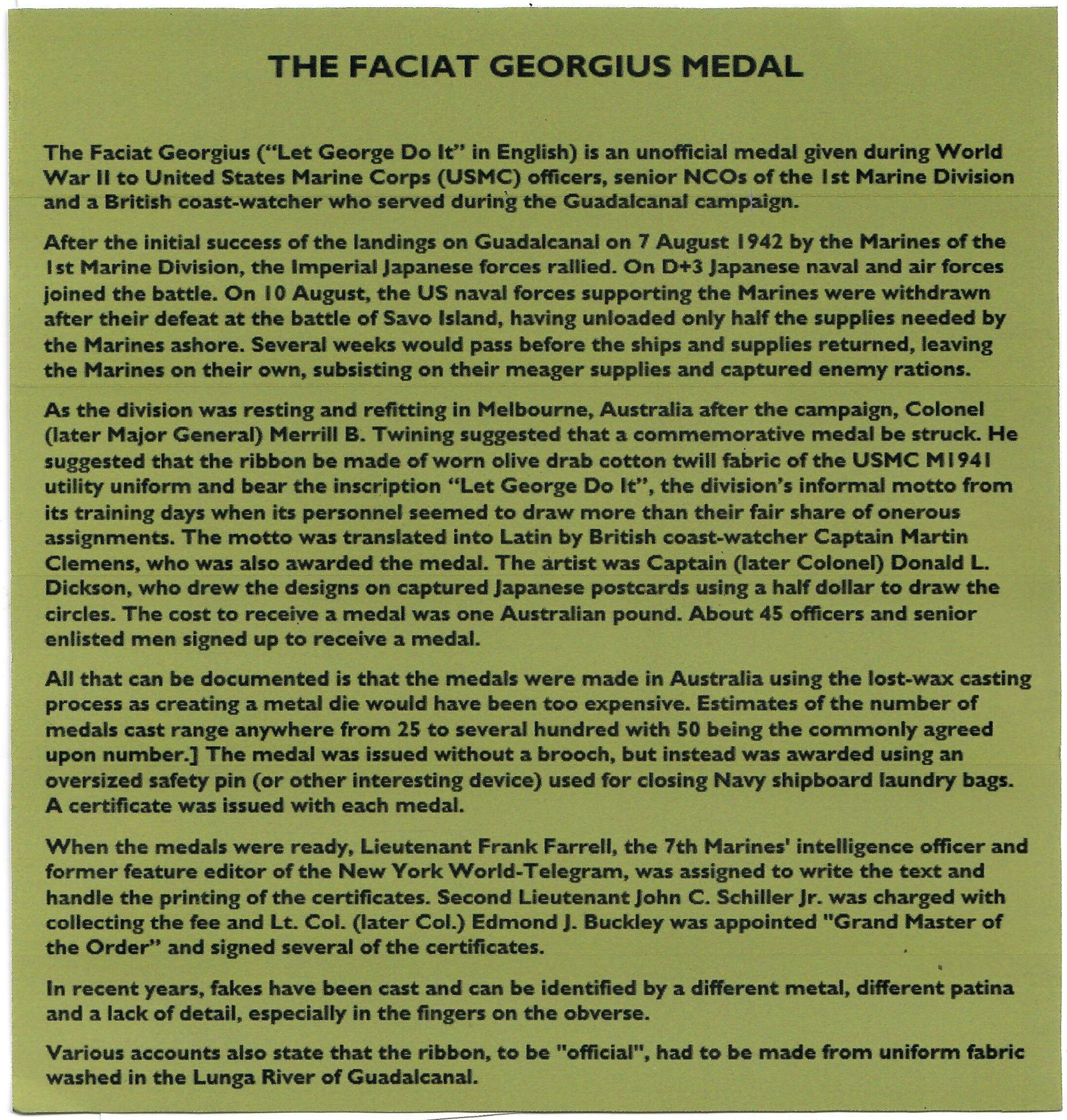 The Faciat Georgius was an unofficial United States Marine Corps medal given to officers on Guadalcanal.