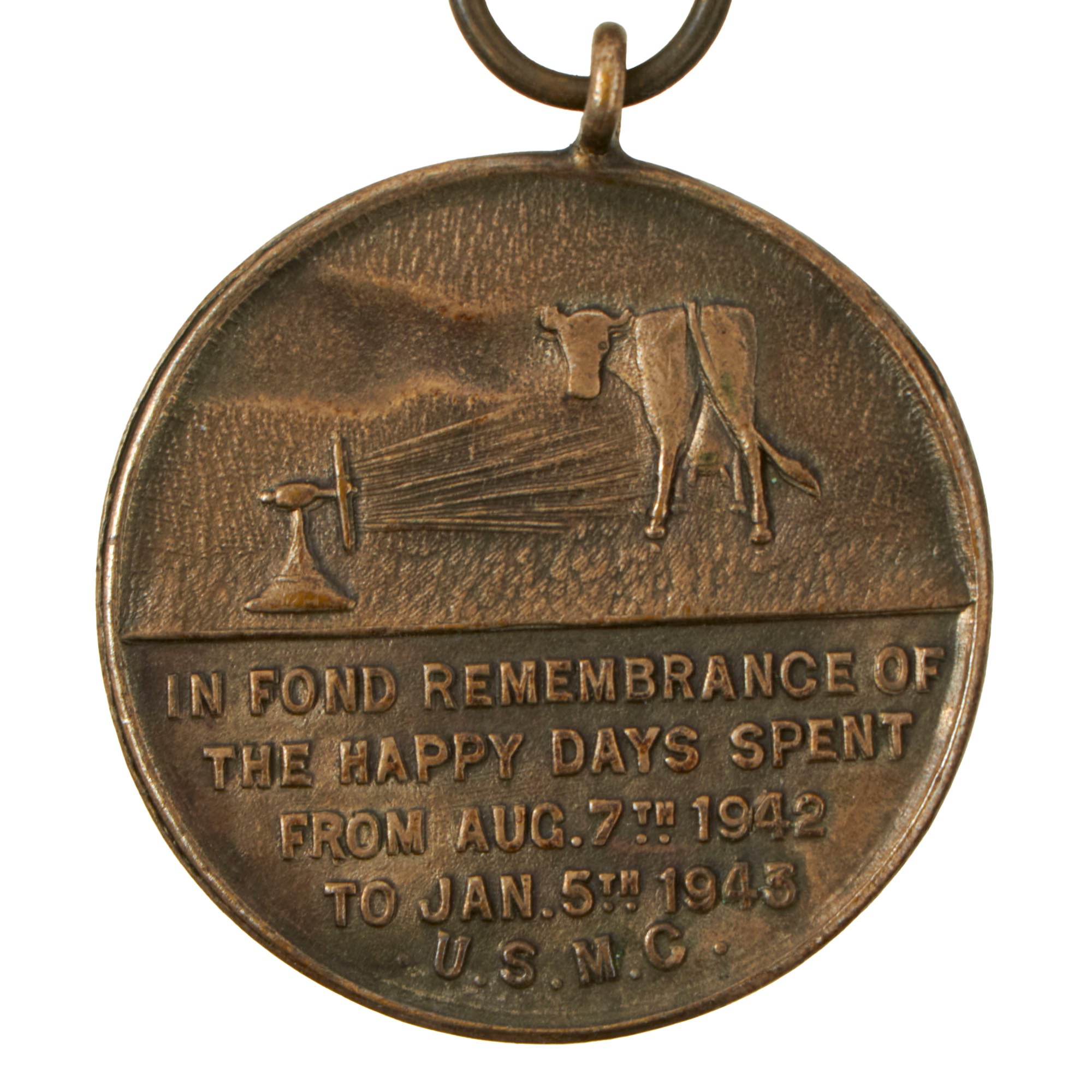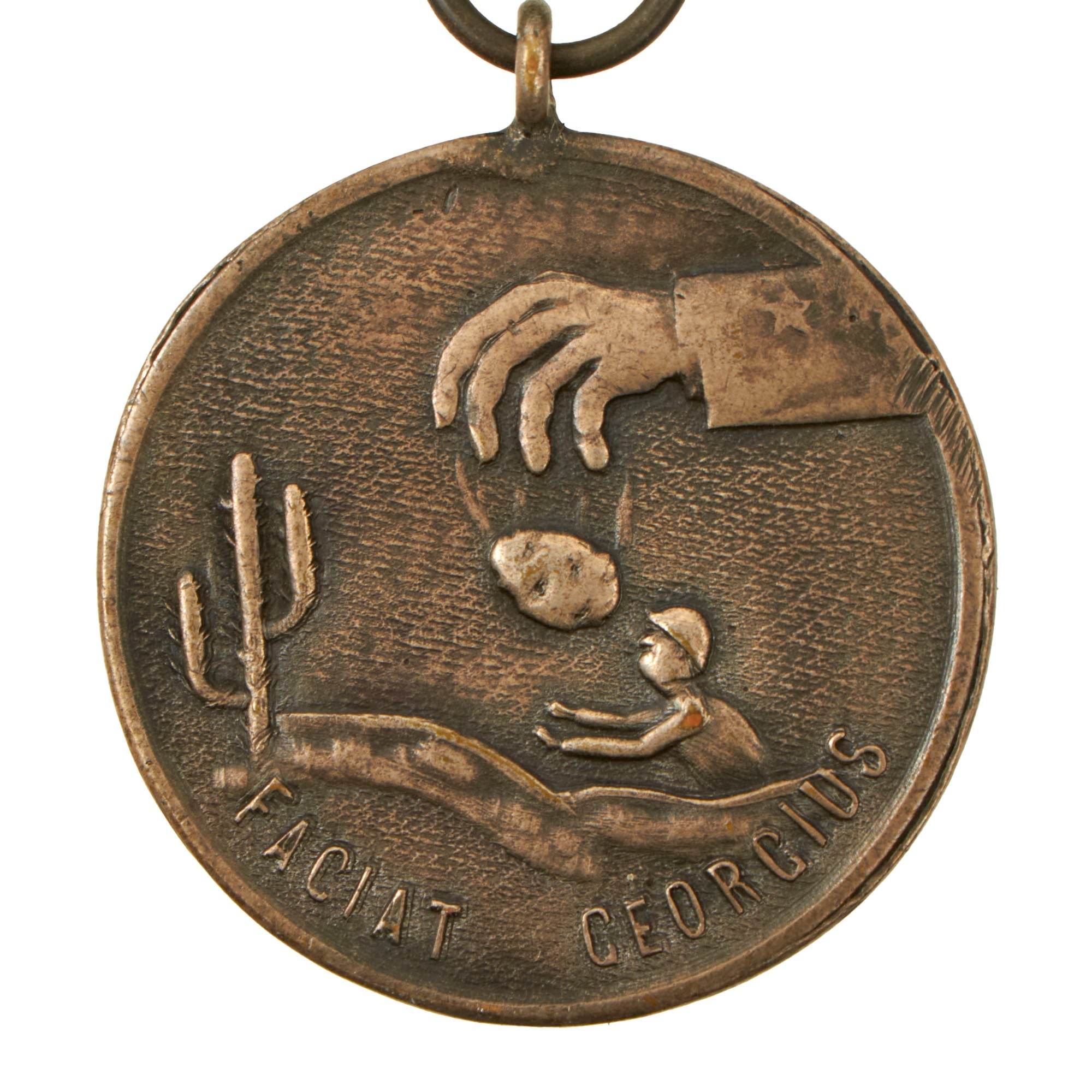 Obverse- A hand extended from a U.S. Navy uniform sleeve dropping a hot potato to an entrenched Marine. A cactus was included to symbolize the code name of the landings; "Operation Cactus." At the bottom are the words "Faciat Georgius"