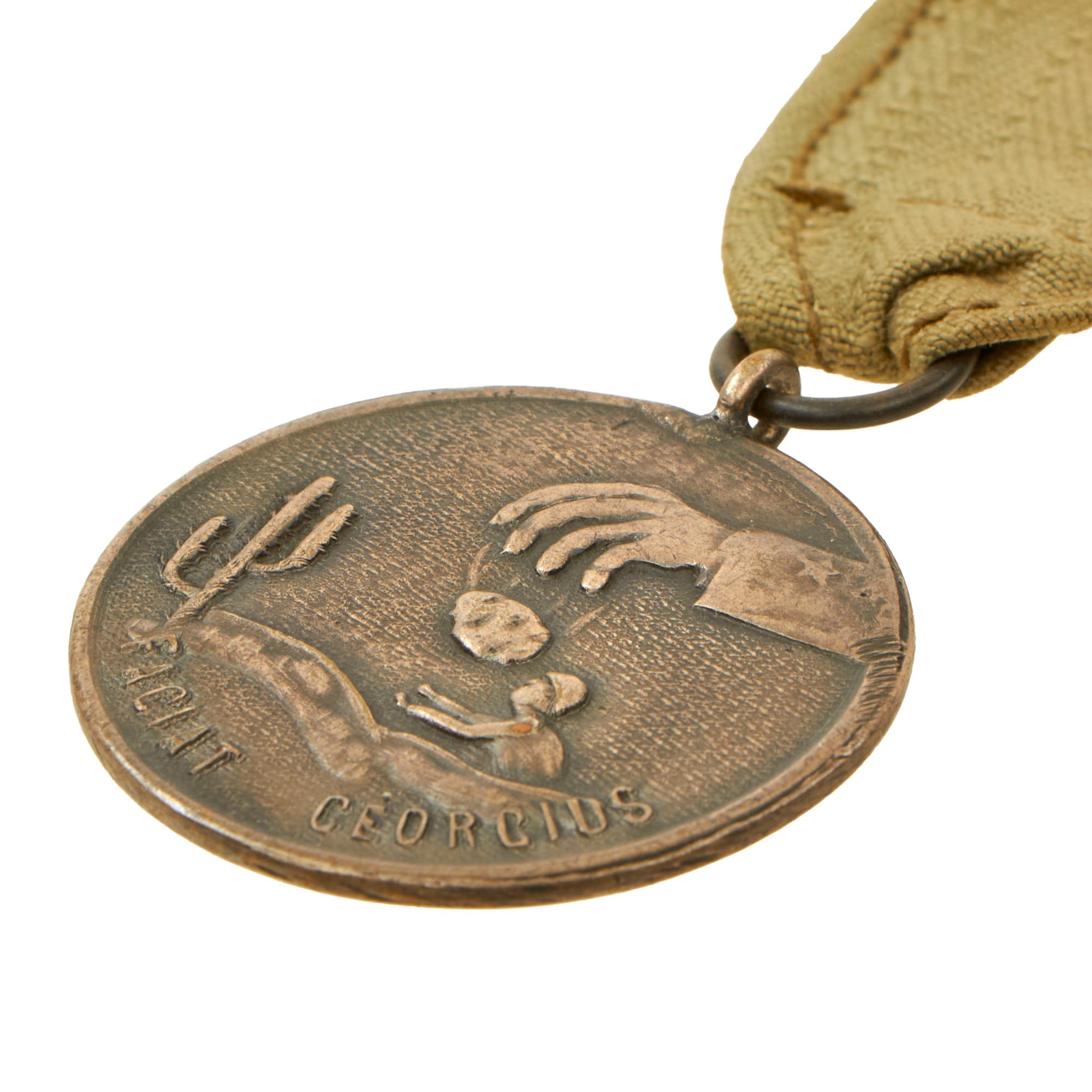 Original Item: These medals have been faked for decades, but we’ve had this one inspected by two knowledgeable collectors, both of whom consider this to be original. There is some wear most notably on the sleeve of the hand dropping the "hot potato" which has rubbed away some of the star.