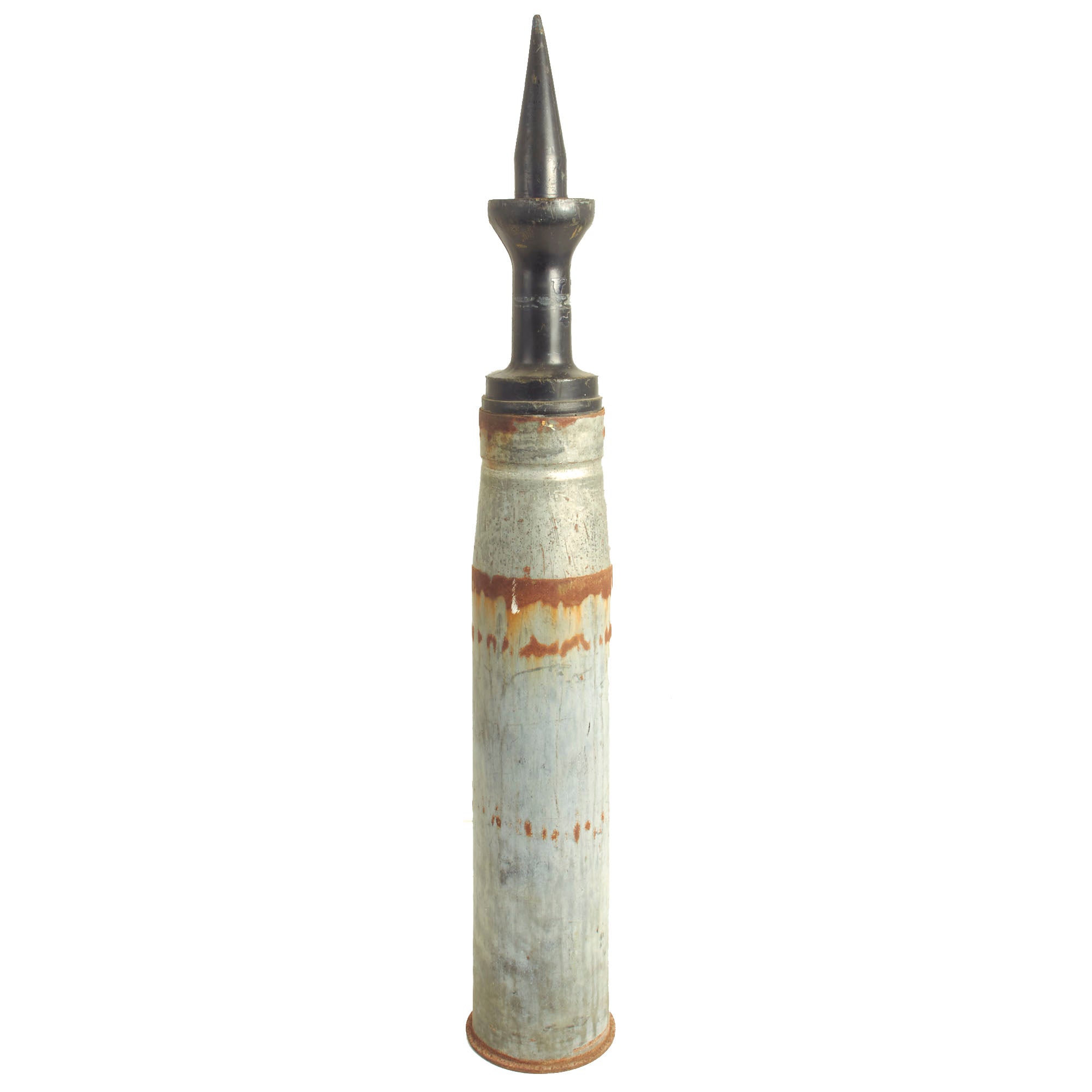 This is a DUMMY training cartridge of a high velocity, flat trajectory, discarding sabot round used in 105mm gun cannons against armored targets. It is offered in wonderful condition with minor surface oxidation present on the shell casing. The sabot portion of the round no longer retains any arsenal markings. Measures approximately 37 1/2 inches long.