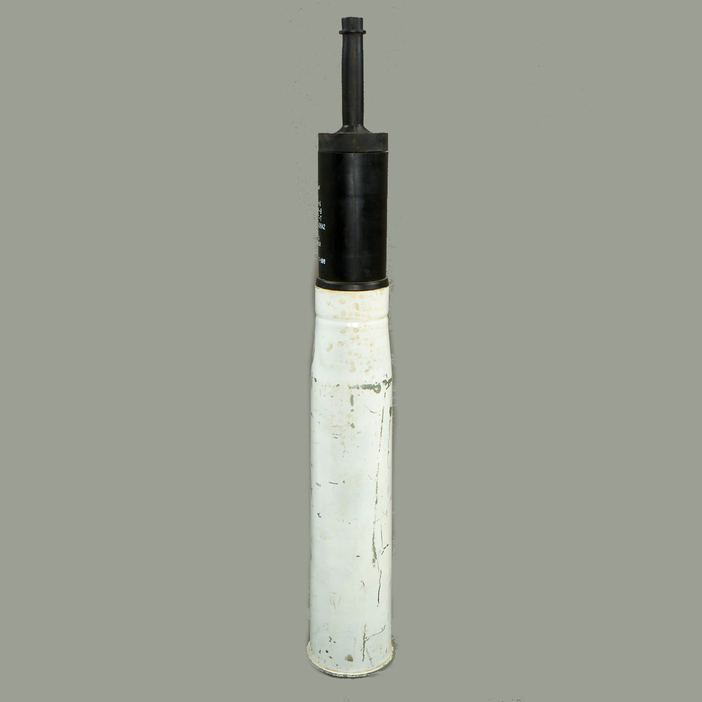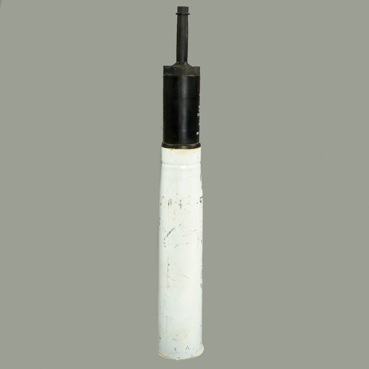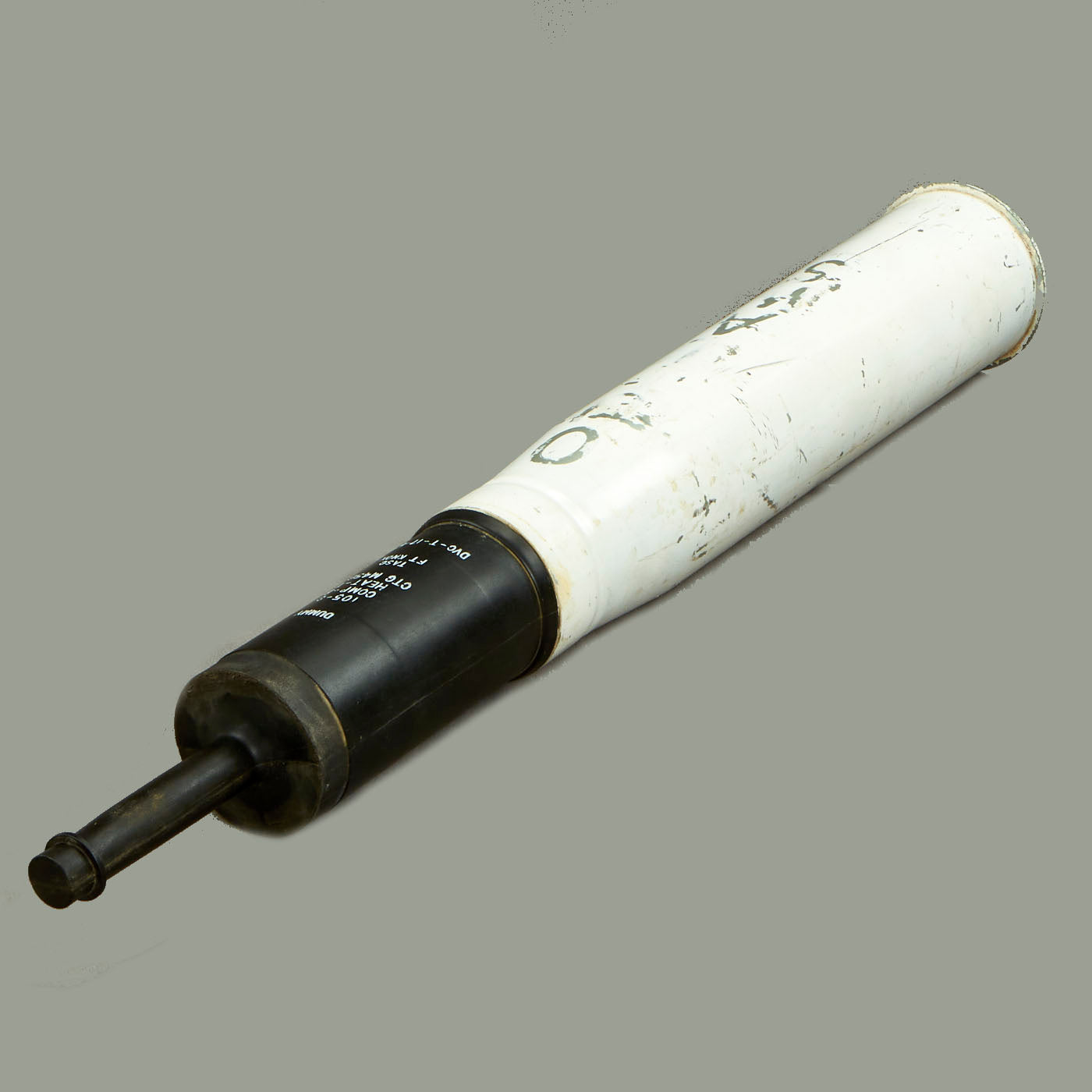 Description: The steel body projectile is fitted with a plastic obturator, a threaded standoff spike assembly, a fin and boom, and a PIBD fuze. A funnel-shaped copper liner within the body shapes the explosive charge of Comp B. A piezoelectric element retained in a nose cap is fitted to the spike assembly and is connected to the BD fuze in the body. The fin is threaded to receive a tracer.
