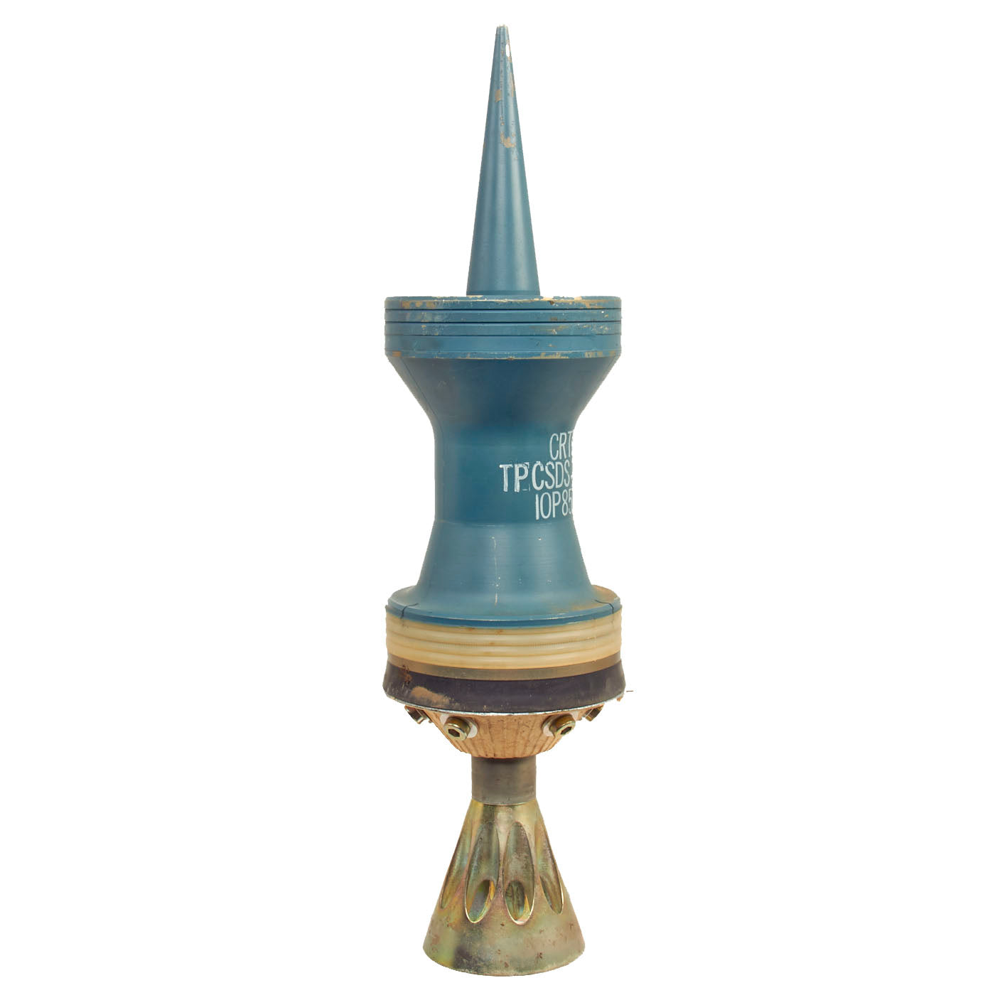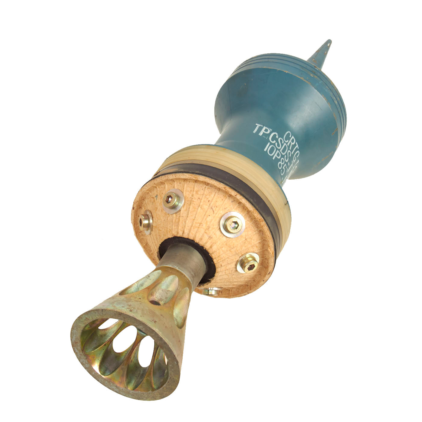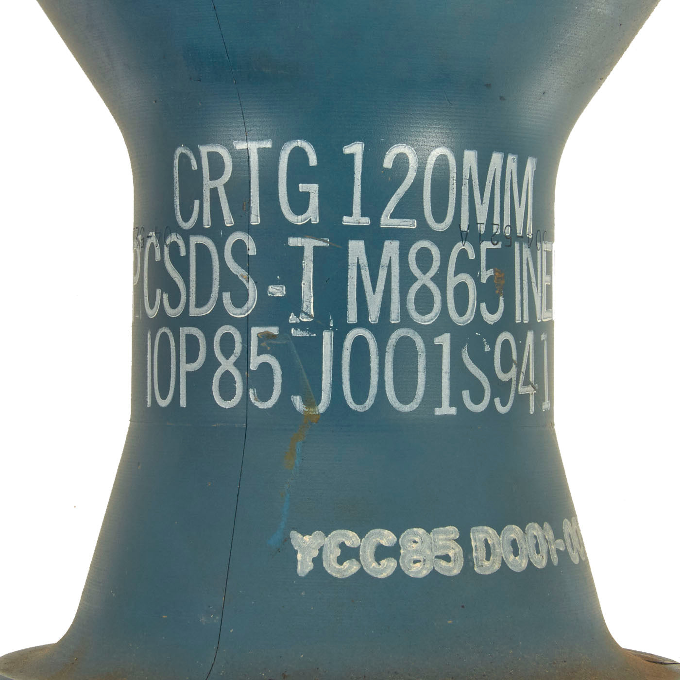 The cartridge, 120mm, TPCSDS-T, M865 contains a propulsion system consisting of a stub metal case with combustible sidewall, granular propellant, and electric M125 primer, while the projectile consists of subprojectile and aluminum sabot. The core is a one-piece steel design with a tail cone assembly which is assembled into the sabot by means of threads. The tail cone contains nine holes, or six slots, which in conjunction with the conical shape provide stabilization. Reduced range is achieved by the aerodynamic blocking effect of the holes, or slots. The tail cone assembly also contains a tracer. The aluminum sabot is composed of three 120° noninterchangeable segments with internal screw threads matching those on the outer diameter of the subprojectile. The sabot has a silicone rubber seal at the rear to prevent gas leakage.