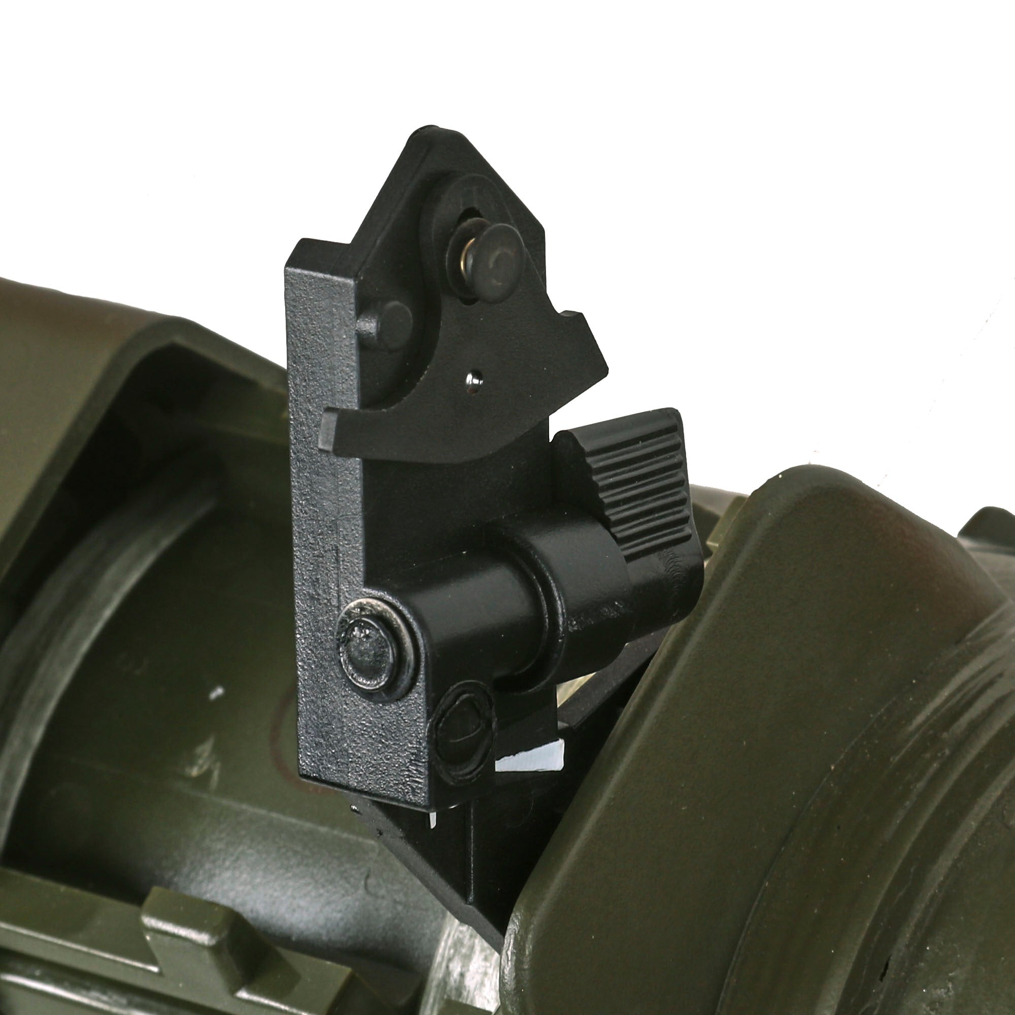 This is a recent production U.S. M136 AT-4 Anti-Tank Weapon Launcher, and it is in very good display condition. showing only light wear from service. It looks great, and has all of the original labels and safety warnings. It also still has the original sling and fold-away "shoulder stock" that helps stabilize the weapon. The front and rear sights are both intact, and they properly pop up when the covers are opened. It also still retains the front gasket with all of the rubber fingers, which would prevent dirt and other items from entering the front of the launcher. The markings are in good shape overall, with very little wear or damage.