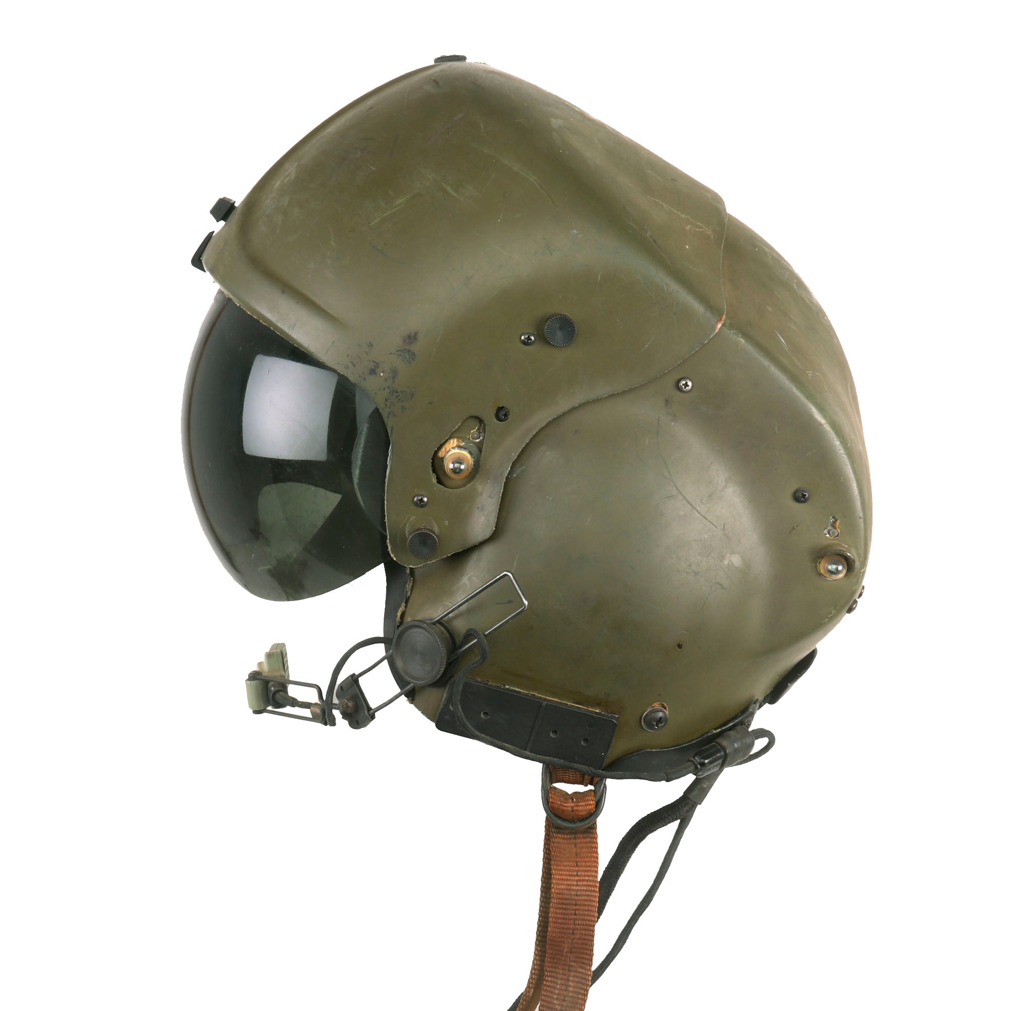 This example is in good condition, and looks to still have all of the avionics still included though one of the headphones is detached. We unfortunately have no way to test these or the IHADSS system, so we do not know if they still function correctly. The visor and cover is unfortunately broke in a few places (as can be seen) and is partially detached. As with most helmets that are several decades old and saw service use, there is some deterioration to the foam rubber inside, particularly in the left earphone, which has the transducer unprotected and loose inside the earcup. The tinted visor has been modified by having a section cut out on the bottom of the right side, probably for a better view of the targeting system. These were set up for each pilot individually based on their preferences.