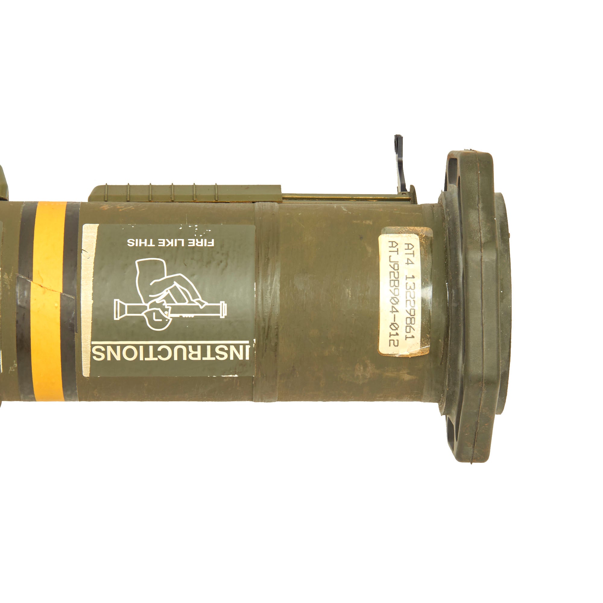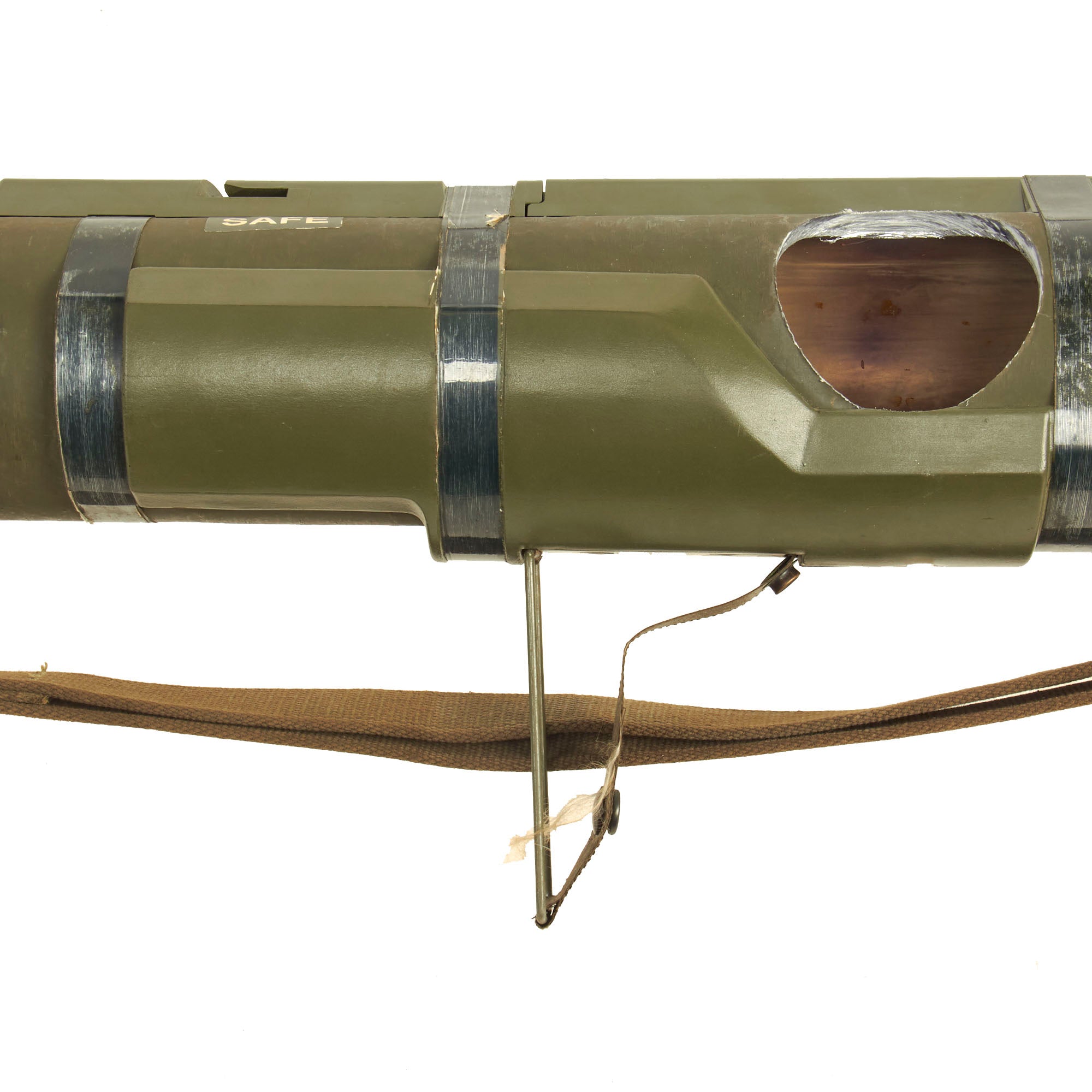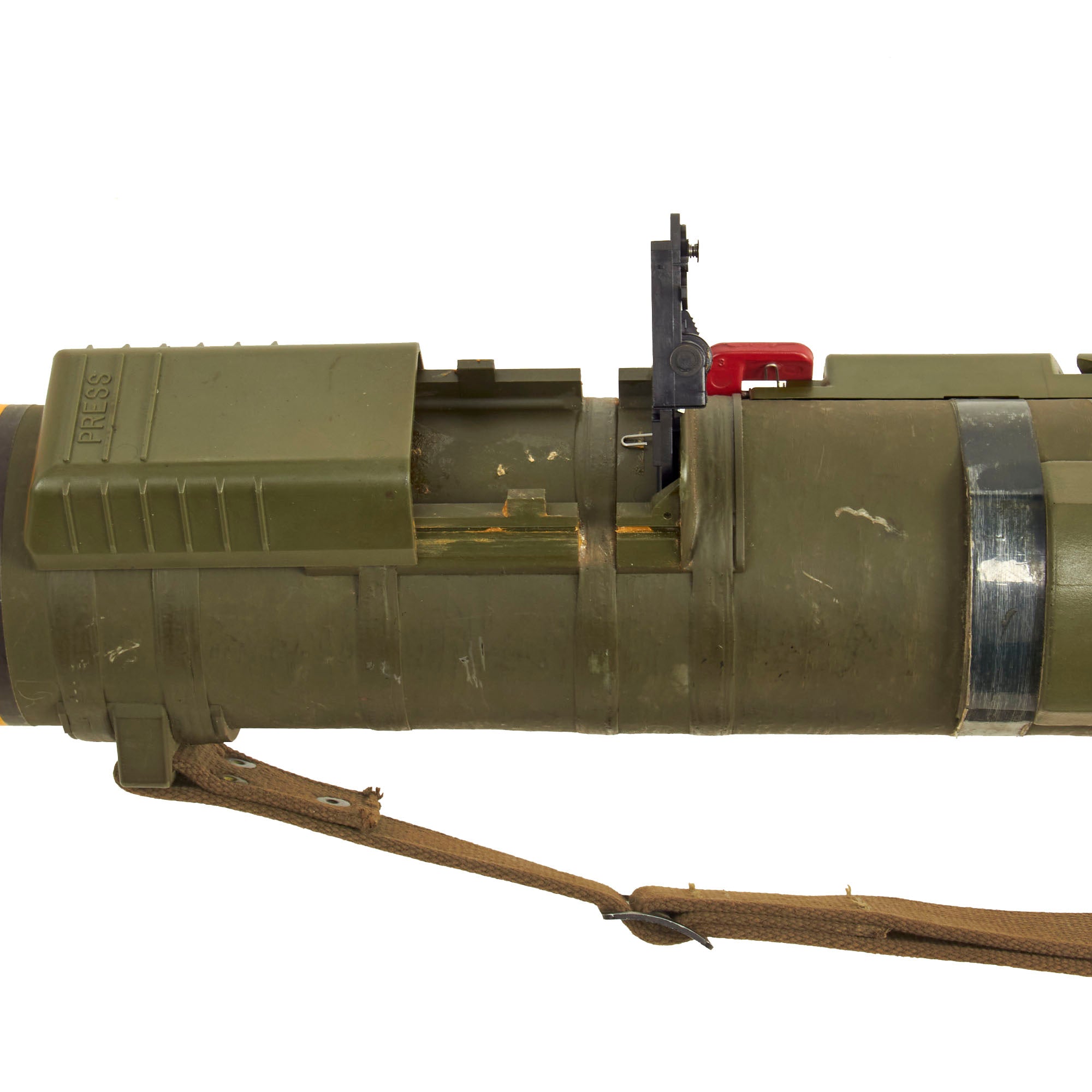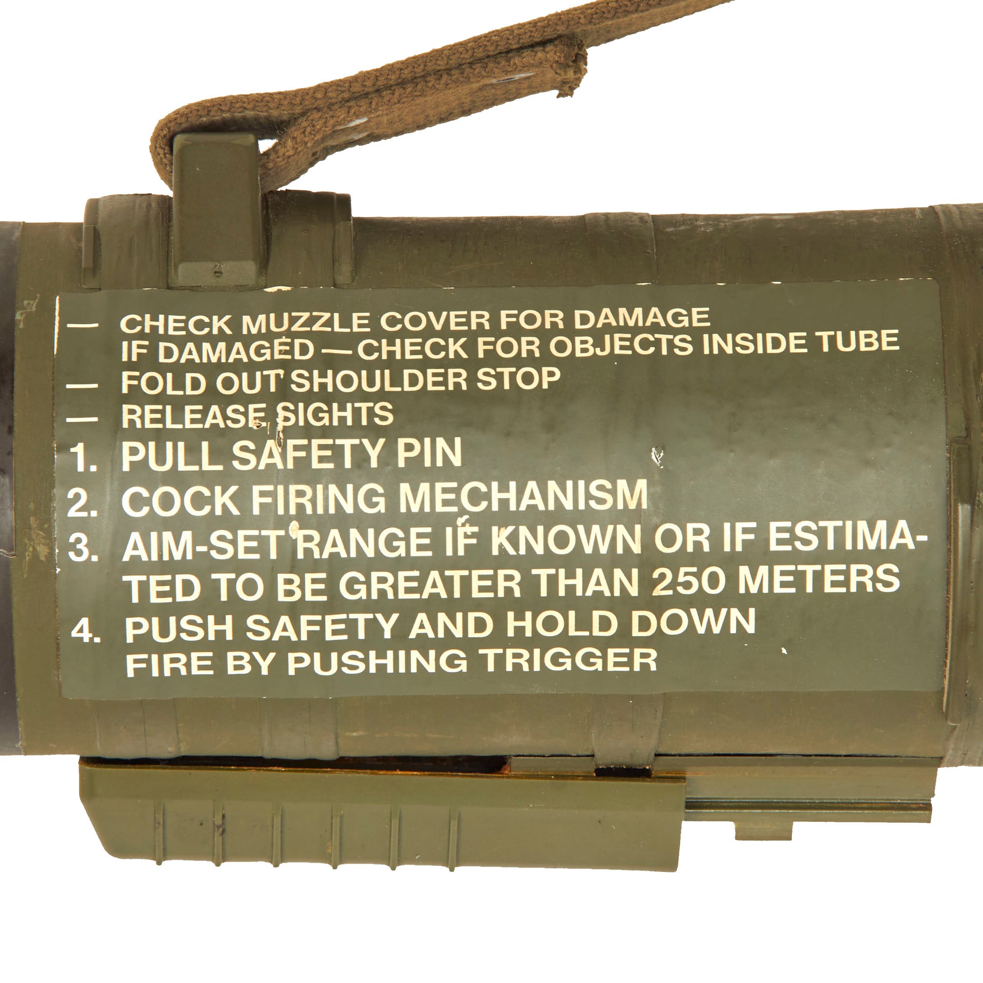 This is a recent production U.S. M163 AT-4 Anti-Tank Weapon Launcher, and it is in very good display condition. It looks great, and has all of the original labels and safety warnings. It also still has the original sling and fold-away "shoulder stock" that helps stabilize the weapon. Both the front and rear sight covers still slide away correctly, and the sights pop up and look to be intact. It even has an intact front rubber gasket with all of the "fingers" that prevent dirt and other items from entering the front of the launcher, something we do not usually see!