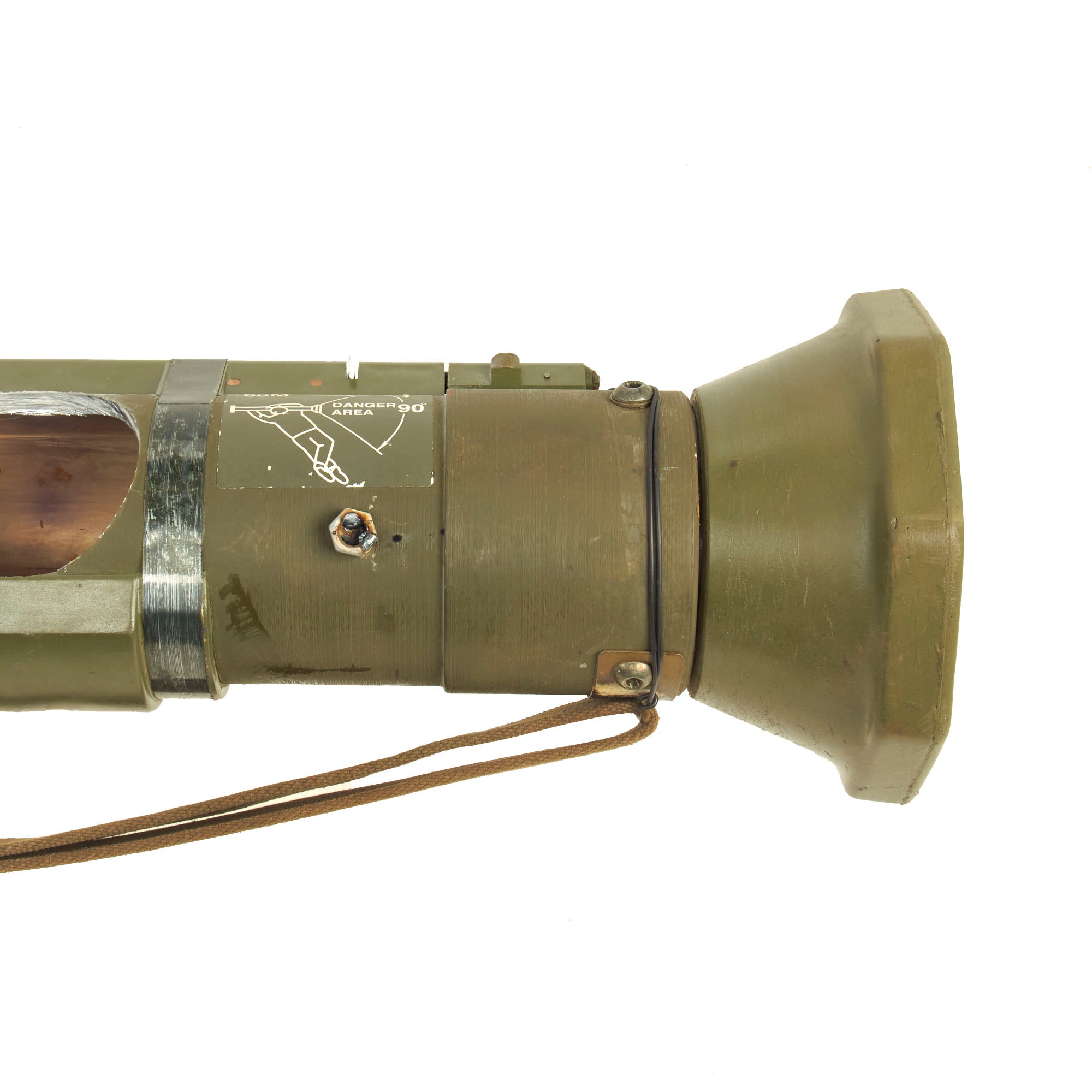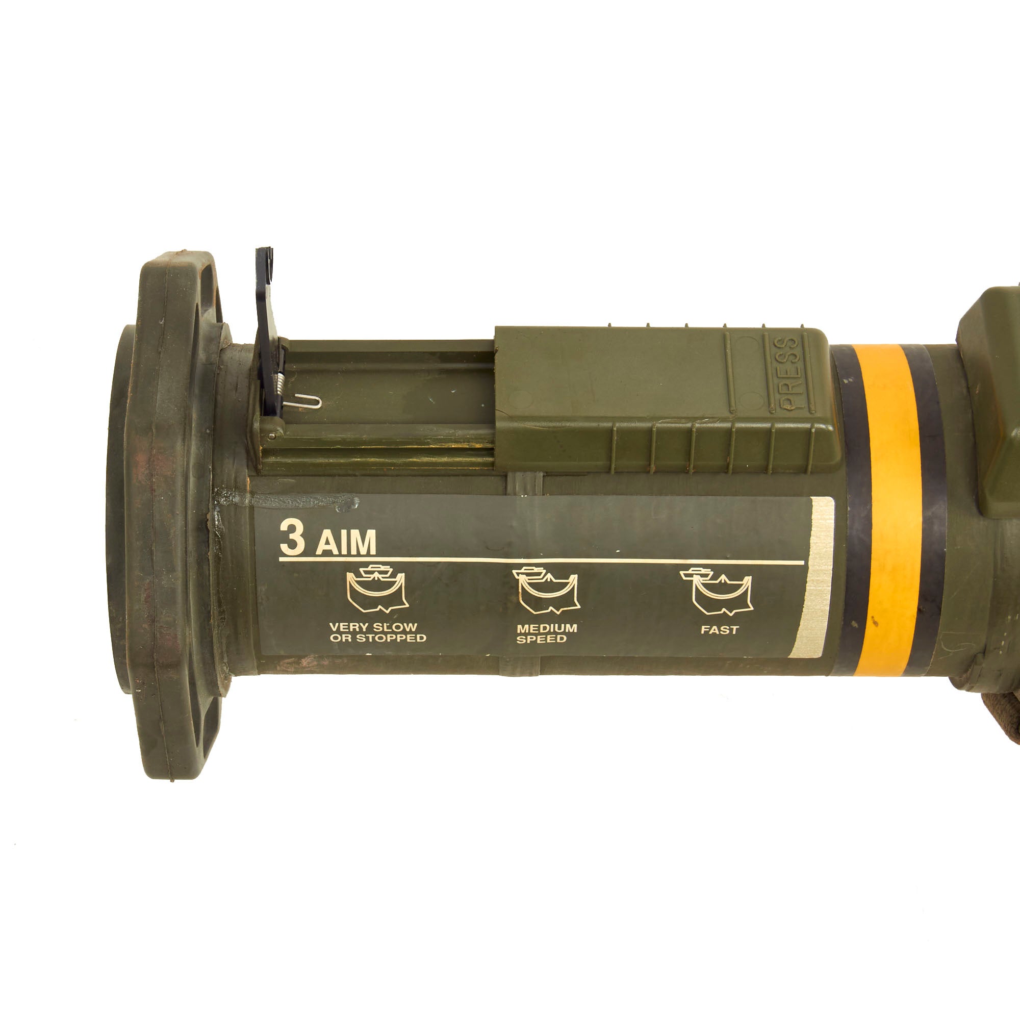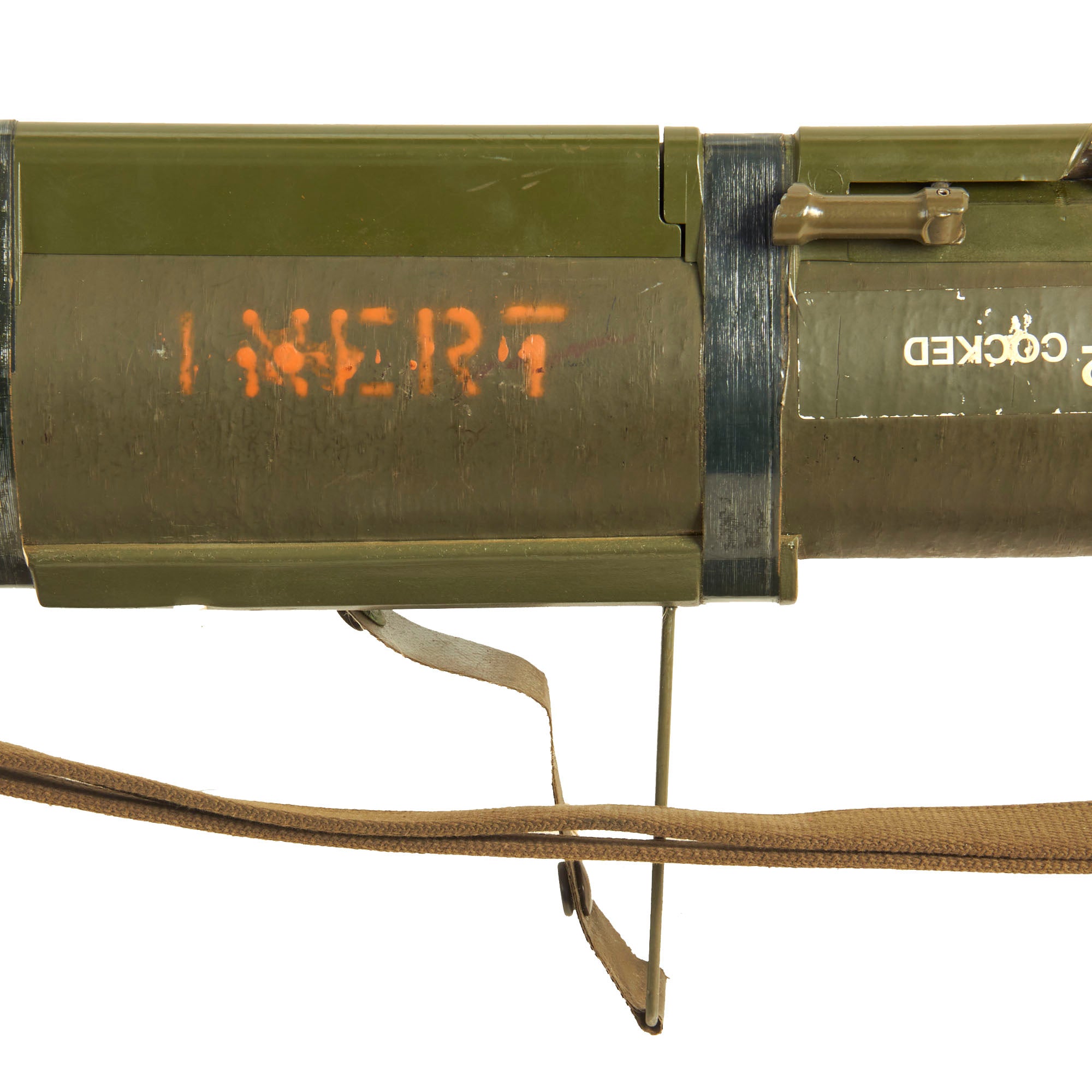 This is a recent production U.S. M163 AT-4 Anti-Tank Weapon Launcher, and it is in very good display condition. It looks great, and has all of the original labels and safety warnings. It also still has the original sling and fold-away "shoulder stock" that helps stabilize the weapon. Both the front and rear sight covers still slide away correctly, and the sights pop up and look to be intact. It even has an intact front rubber gasket with all of the "fingers" that prevent dirt and other items from entering the front of the launcher, something we do not usually see!