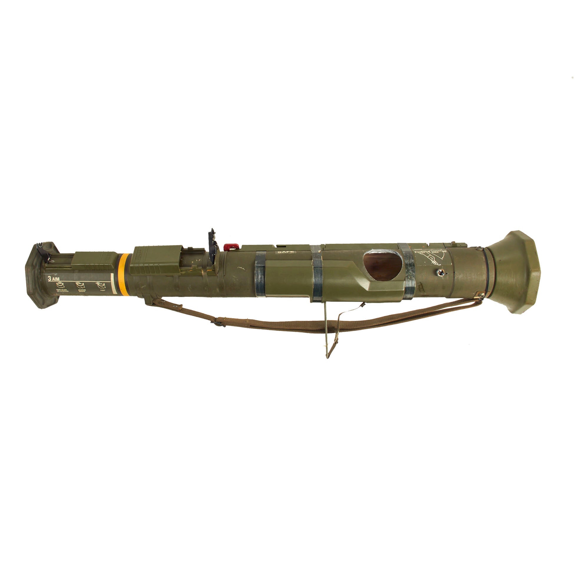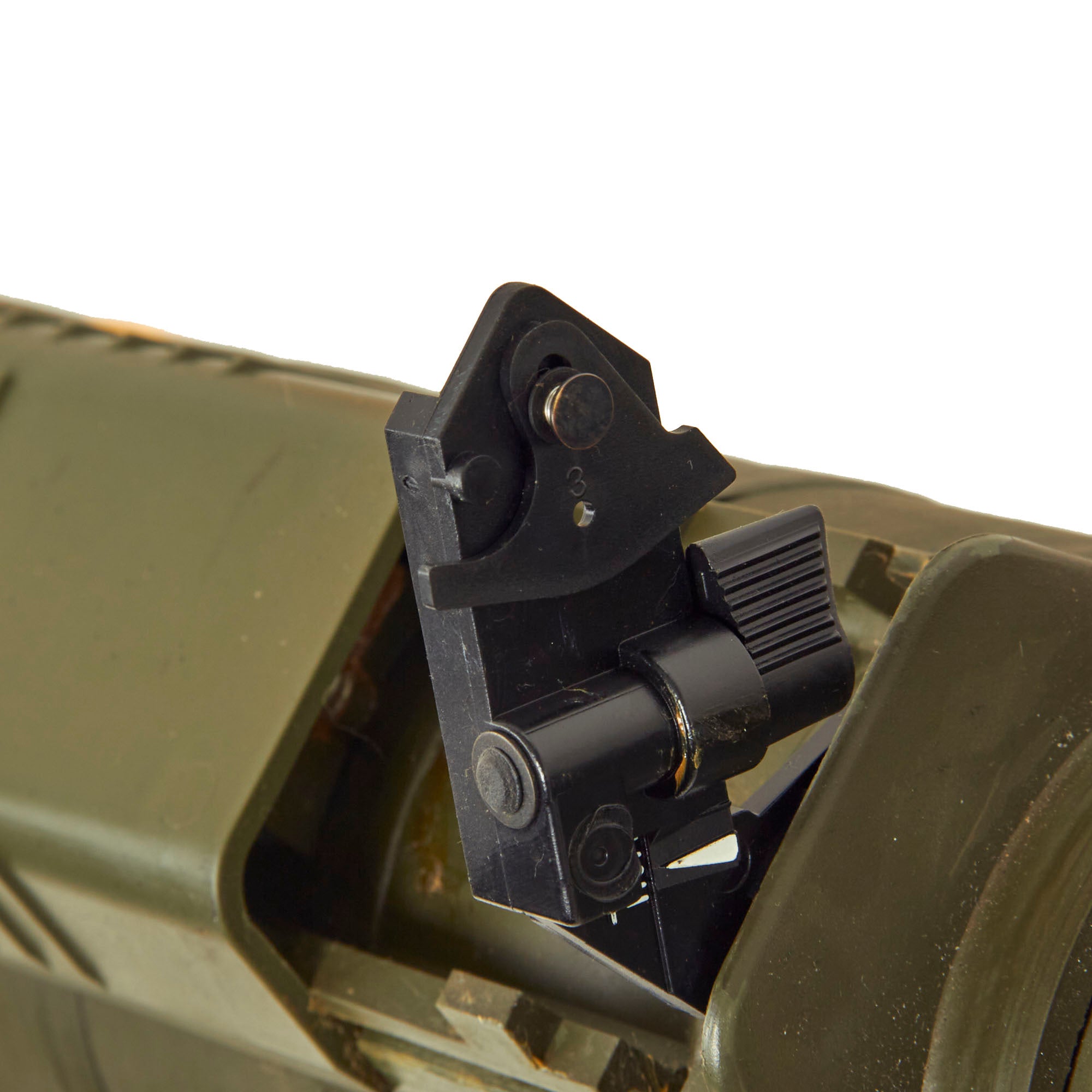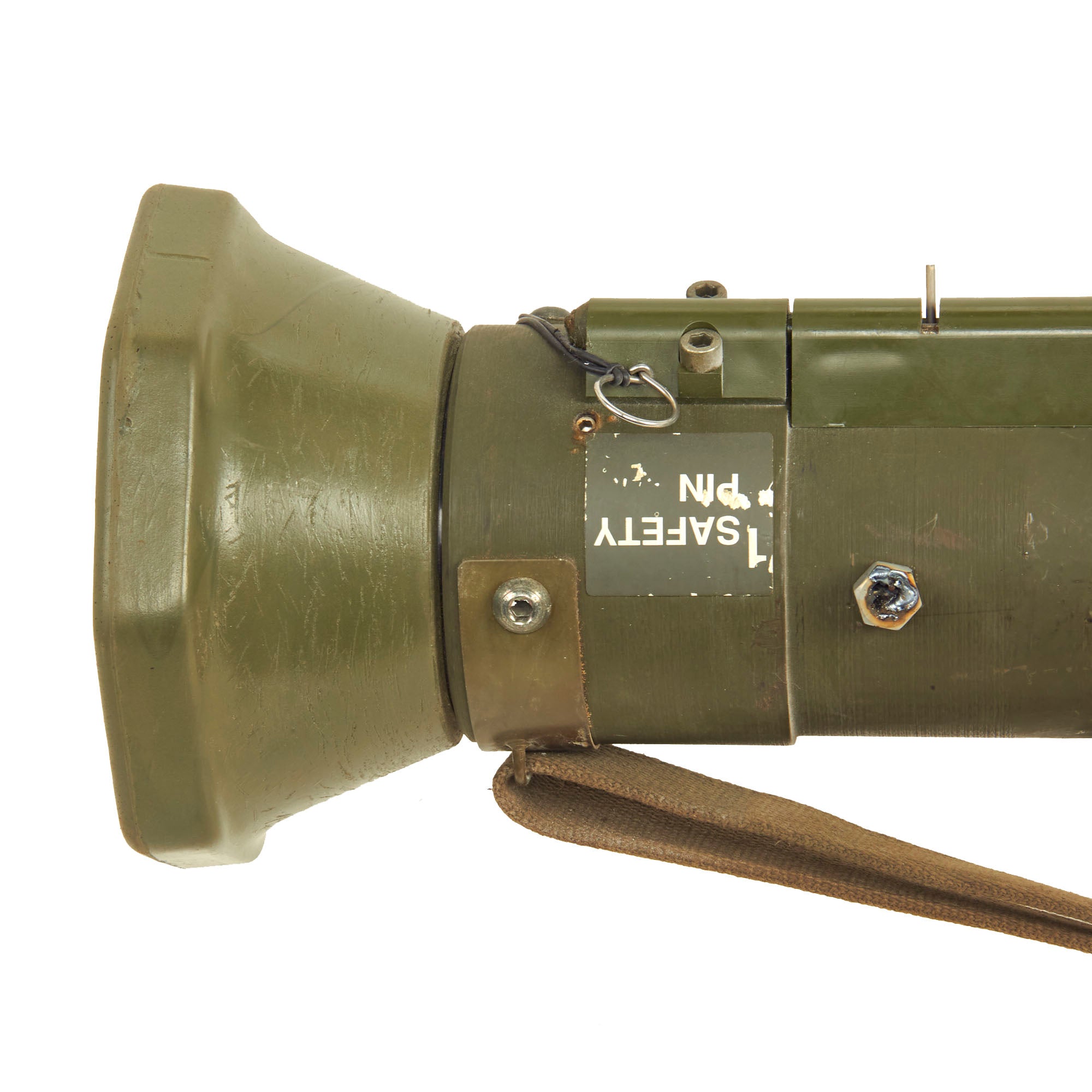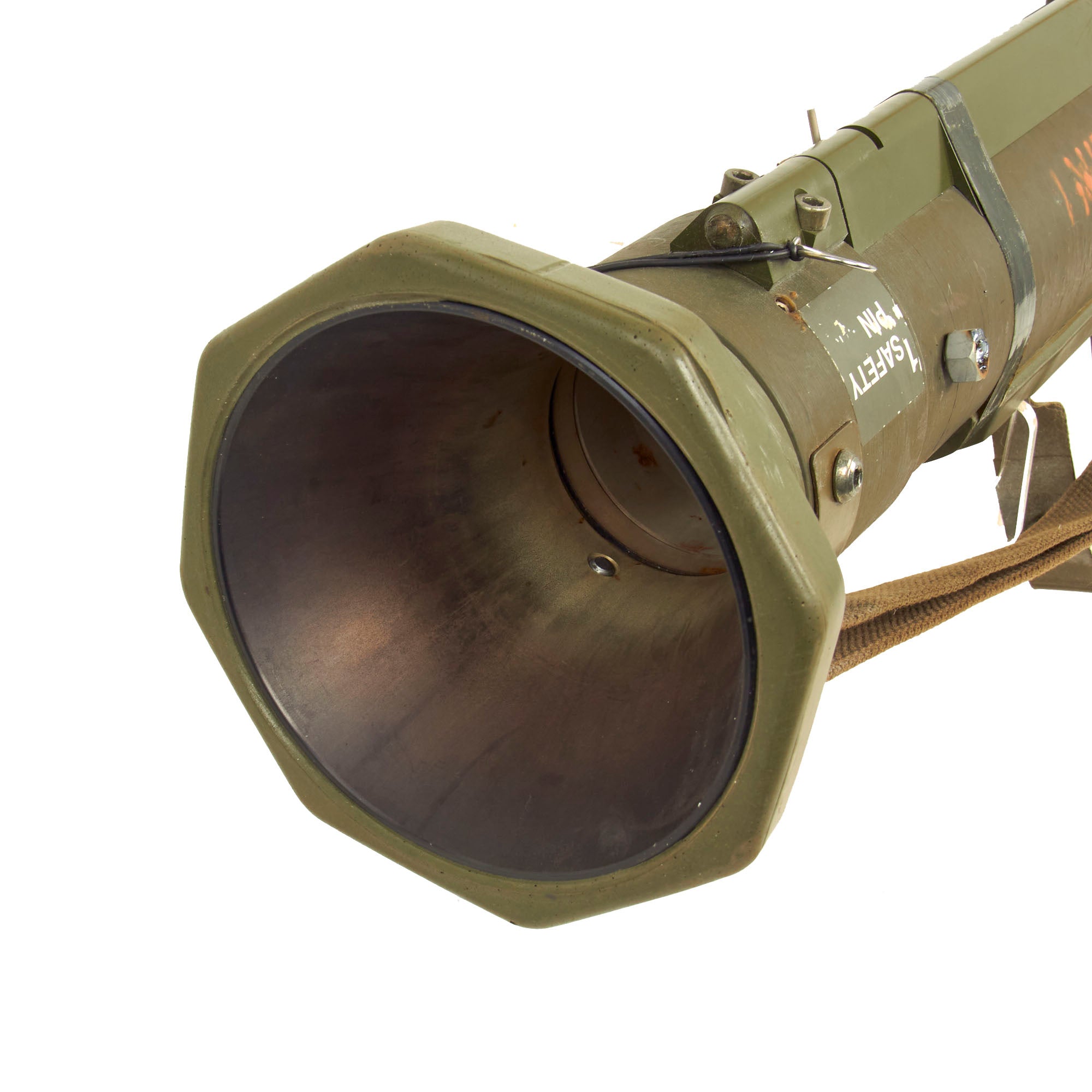 This is a recent production U.S. M163 AT-4 Anti-Tank Weapon Launcher, and it is in very good display condition. It looks great, and has all of the original labels and safety warnings. It also still has the original sling and fold-away "shoulder stock" that helps stabilize the weapon. Both the front and rear sight covers still slide away correctly, and the sights pop up and look to be intact. It even has an intact front rubber gasket with all of the "fingers" that prevent dirt and other items from entering the front of the launcher, something we do not usually see!