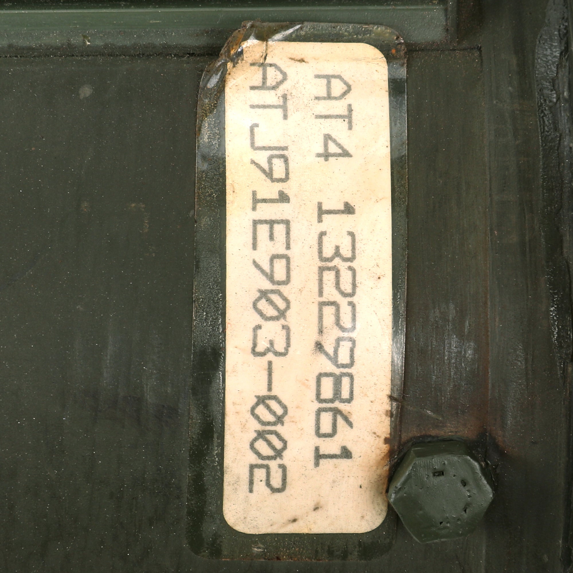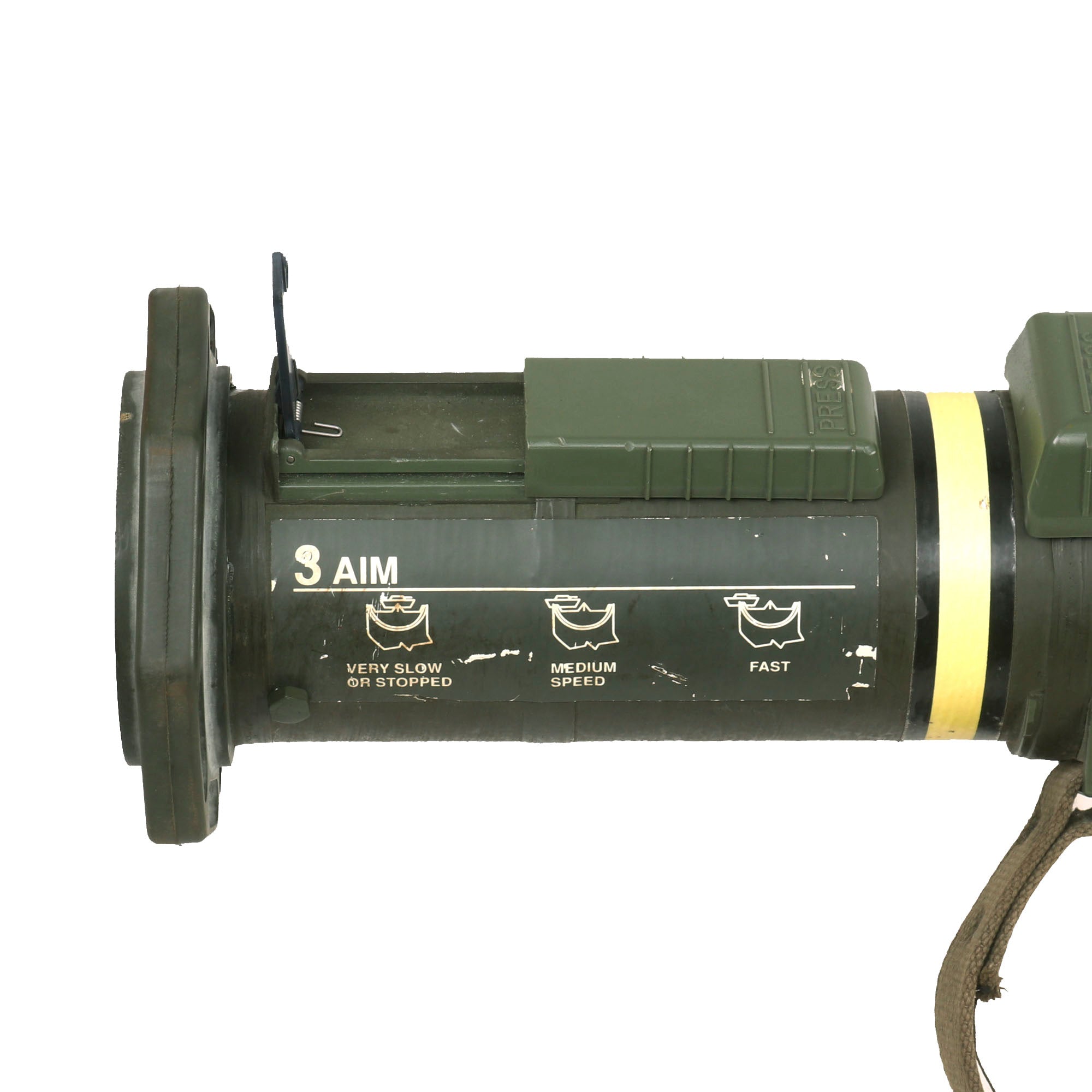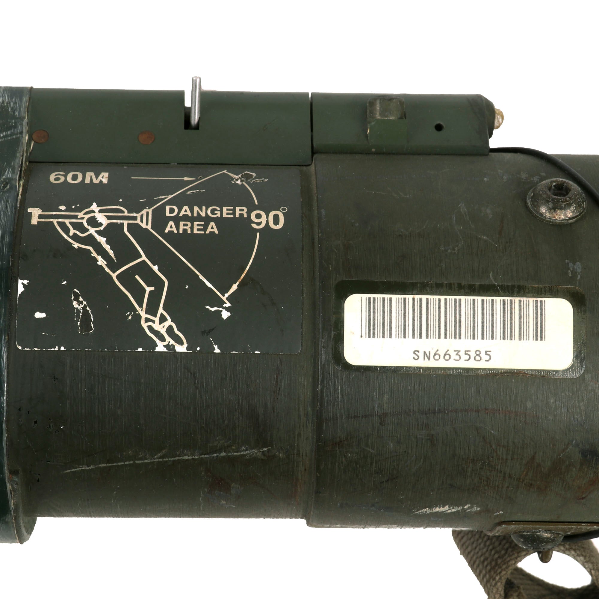 This is a recent production U.S. M163 AT-4 Anti-Tank Weapon Launcher, and it is in very good display condition. showing moderate wear from service. It looks great, and has all of the original labels and safety warnings. It also still has the original sling and fold-away "shoulder stock" that helps stabilize the weapon. The front and rear sights are both intact, and they properly pop up when the covers are opened. It also still retains the front gasket with most of the rubber fingers, which would prevent dirt and other items from entering the front of the launcher. This example still retains its barcodes which read SN663585 and AT4 13229861 AT J91E903-002.