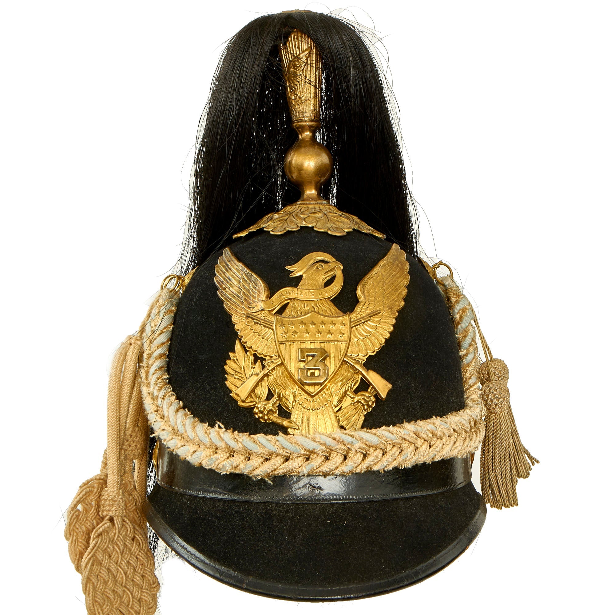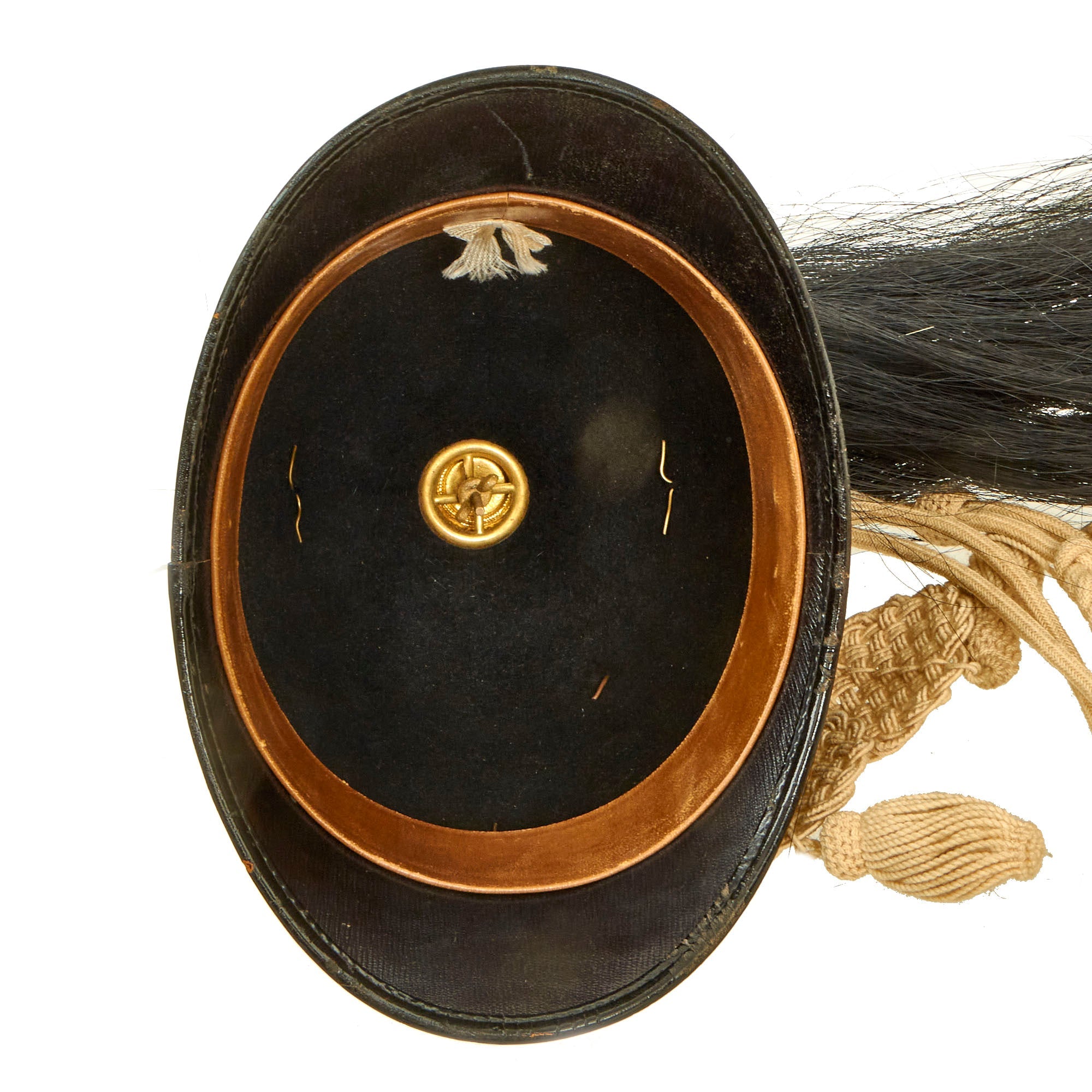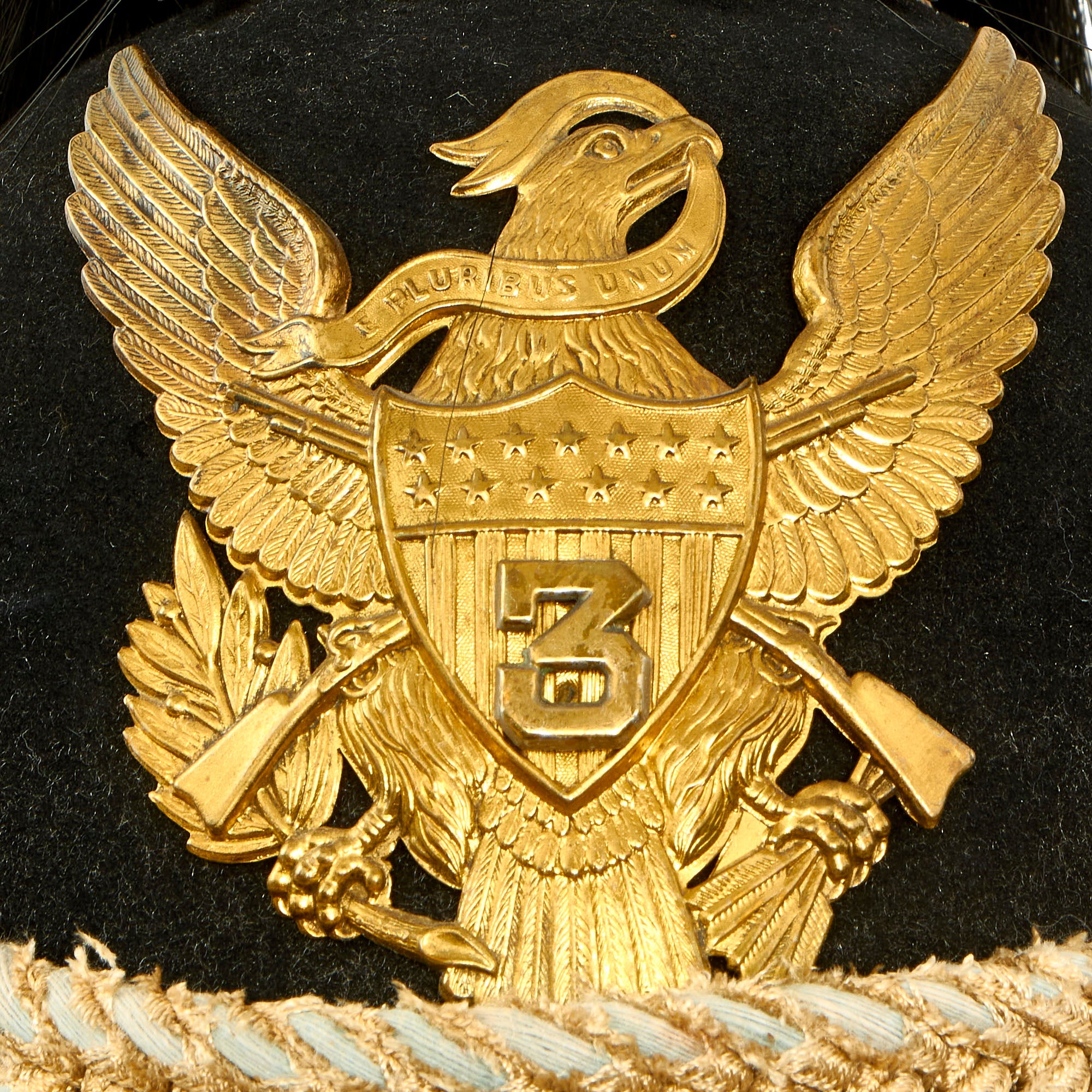 The Helmet plate displays the Great Seal of the United States, with the American Eagle with a banner in it's beak stating: E PLURIBUS UNUM. Helmet plate is in excellent condition, with all three attachment hooks present. The side cockades over the years are of crossed Rifles for an Infantry Soldier. The top has a lovely black plume, which would indicate which unit the soldier was a member of. The liner is also in great shape, with a lovely brown color.