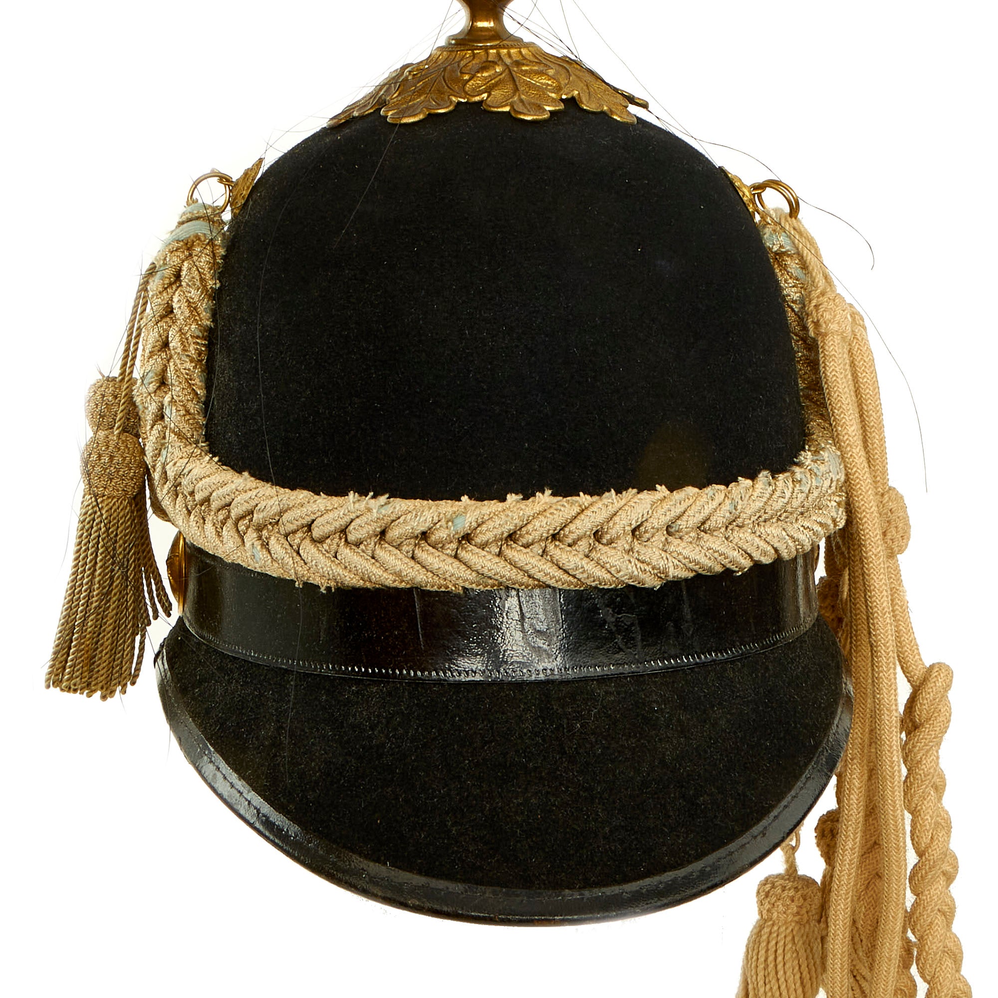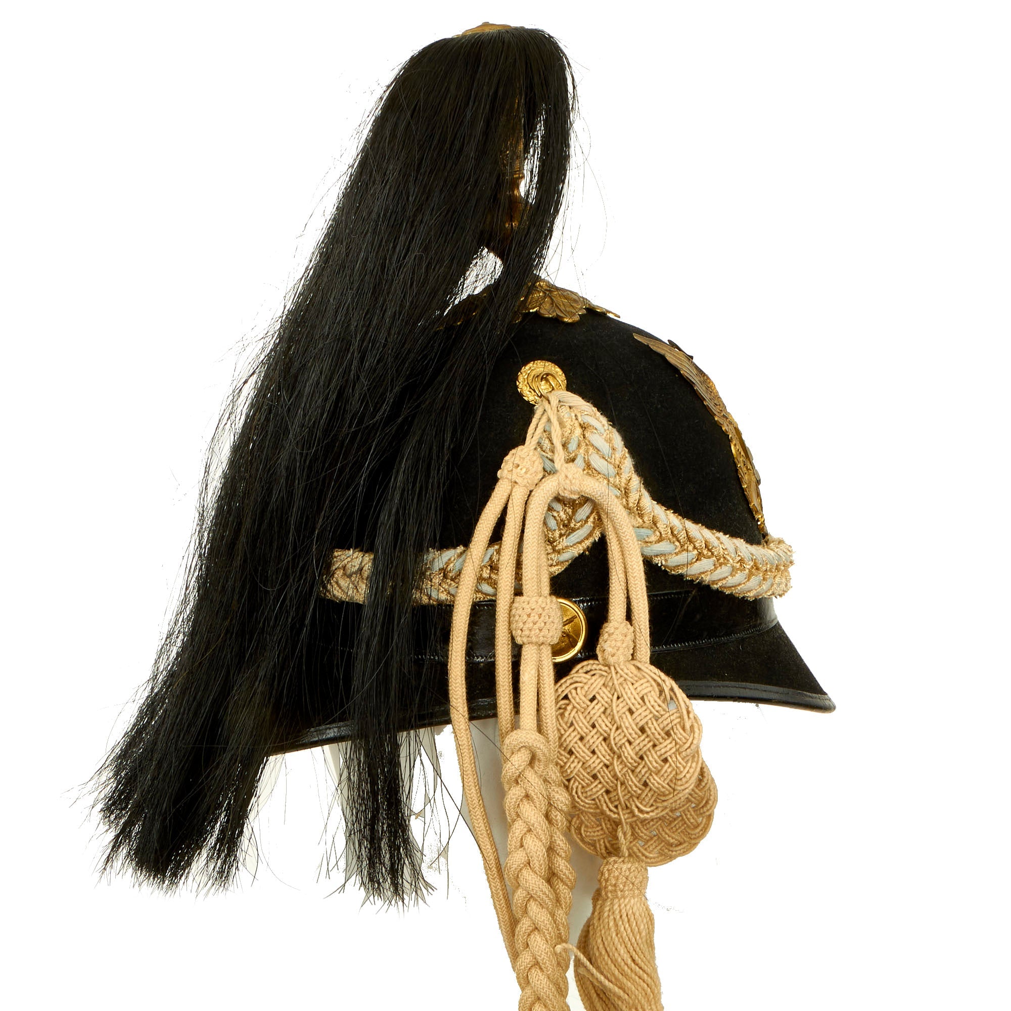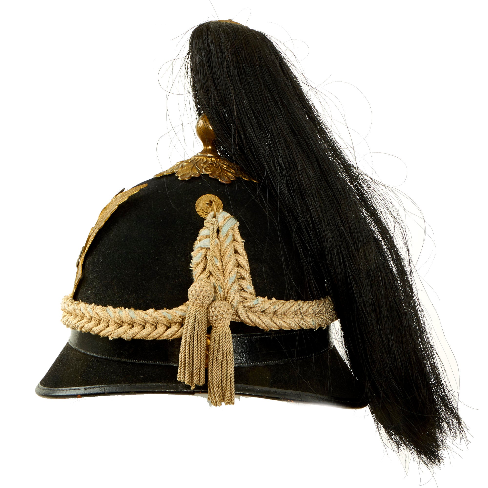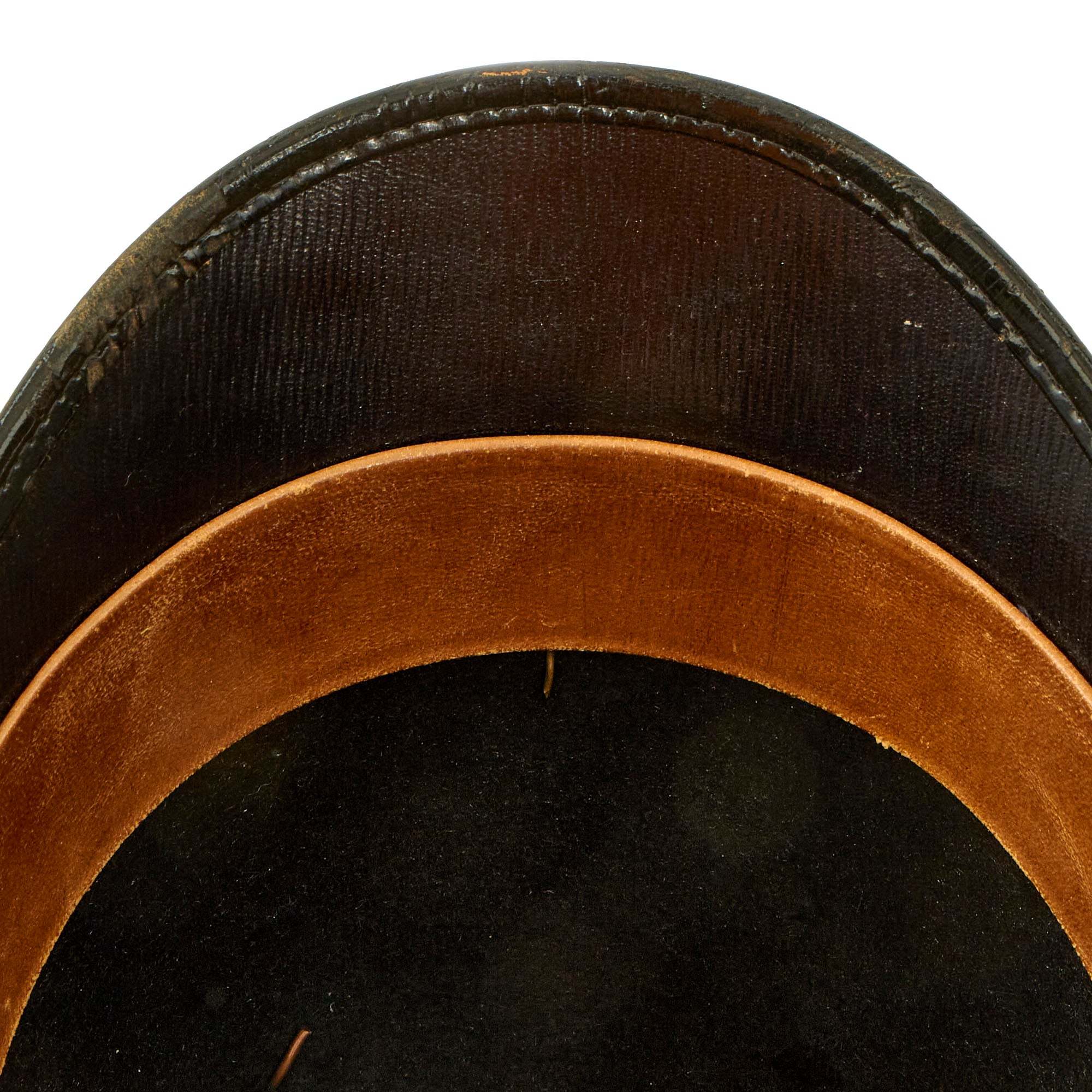 This helmet is dated NOV. 29 1897 on the underside of the liner, and it really is quite striking. This is not the type of helmet that was worn in the field, but instead one intended for use with the "dress" uniform for ceremonial occasions. It beautifully made from cork covered with black fabric, with the Maker's name inside under the liner leather sweatband :